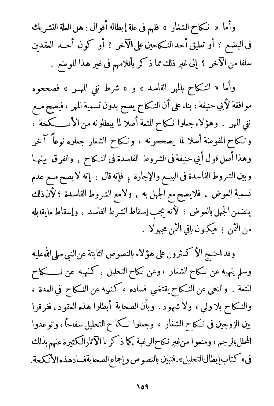 وَأَمَّا " نِكَاحُ الشِّغَارِ " فَلَهُمْ فِي عِلَّةِ إبْطَالِهِ أَقْوَالٌ: هَلْ الْعِلَّةُ التَّشْرِيكُ فِي الْبُضْعِ؟ أَوْ تَعْلِيقُ أَحَدِ النِّكَاحَيْنِ عَلَى الْآخَرِ؟ أَوْ كَوْنُ أَحَدِ الْعَقْدَيْنِ سَلَفًا مِنْ الْآخَرِ؟ إلَى غَيْرِ ذَلِكَ مِمَّا ذُكِرَ بِأَقْلَامِهِمْ فِي غَيْرِ هَذَا الْمَوْضِعِ. وَأَمَّا " النِّكَاحُ بِالْمَهْرِ الْفَاسِدِ " و " شَرْطُ نَفْيِ الْمَهْرِ " فَصَحَّحُوهُ مُوَافَقَةً لِأَبِي حَنِيفَةَ: بِنَاءً عَلَى أَنَّ النِّكَاحَ يَصِحُّ بِدُونِ تَسْمِيَةِ الْمَهْرِ فَيَصِحُّ مَعَ نَفْيِ الْمَهْرِ. وَهَؤُلَاءِ جَعَلُوا نِكَاحَ الْمُتْعَةِ أَصْلًا لِمَا يُبْطِلُونَهُ مِنْ الْأَنْكِحَةِ وَنِكَاحَ الْمُفَوَّضَةِ أَصْلًا لِمَا يُصَحِّحُونَهُ وَنِكَاحُ الشِّغَارِ جَعَلُوهُ نَوْعًا آخَرَ وَهَذَا أَصْلُ قَوْلِ أَبِي حَنِيفَةَ فِي الشُّرُوطِ الْفَاسِدَةِ فِي النِّكَاحِ وَالْفَرْقُ بَيْنَهَا وَبَيْنَ الشُّرُوطِ الْفَاسِدَةِ فِي الْبَيْعِ وَالْإِجَارَةِ؛ فَإِنَّهُ قَالَ: إنَّهُ لَا يَصِحُّ مَعَ عَدَمِ تَسْمِيَةِ الْعِوَضِ فَلَا يَصِحُّ مَعَ الْجَهْلِ بِهِ وَلَا مَعَ الشُّرُوطِ الْفَاسِدَةِ؛ لِأَنَّ ذَلِكَ يَتَضَمَّنُ الْجَهْلَ بِالْعِوَضِ؛ لِأَنَّهُ يَجِبُ إسْقَاطُ الشَّرْطِ الْفَاسِدِ وَإِسْقَاطُ مَا يُقَابِلُهُ مِنْ الثَّمَنِ فَيَكُونُ بَاقِي الثَّمَنِ مَجْهُولًا. وَقَدْ احْتَجَّ الْأَكْثَرُونَ عَلَى هَؤُلَاءِ بِالنُّصُوصِ الثَّابِتَةِ عَنْ النَّبِيِّ صَلَّى اللَّهُ عَلَيْهِ وَسَلَّمَ بِنَهْيِهِ عَنْ نِكَاحِ الشِّغَار وَعَنْ نِكَاحِ التَّحْلِيلِ كَنَهْيِهِ عَنْ نِكَاحِ الْمُتْعَةِ وَالنَّهْيُ عَنْ النِّكَاحِ يَقْتَضِي فَسَادَهُ كَنَهْيِهِ عَنْ النِّكَاحِ فِي الْعِدَّةِ وَالنِّكَاحِ بِلَا وَلِيٍّ وَلَا شُهُودٍ. وَبِأَنَّ الصَّحَابَةَ أَبْطَلُوا هَذِهِ الْعُقُودَ فَفَرَّقُوا بَيْنَ الزَّوْجَيْنِ فِي نِكَاحِ الشِّغَارِ وَجَعَلُوا نِكَاحَ التَّحْلِيلِ سِفَاحًا وَتَوَعَّدُوا الْمُحَلِّلَ بِالرَّجْمِ وَمَنَعُوا مِنْ غَيْرِ نِكَاحِ الرَّغْبَةِ كَمَا ذَكَرْنَا الْآثَارَ الْكَثِيرَةَ عَنْهُمْ بِذَلِكَ فِي " كِتَابِ إبْطَالِ التَّحْلِيلِ " فَتَبَيَّنَ بِالنُّصُوصِ وَإِجْمَاعِ الصَّحَابَةِ فَسَادُ هَذِهِ الْأَنْكِحَةِ.