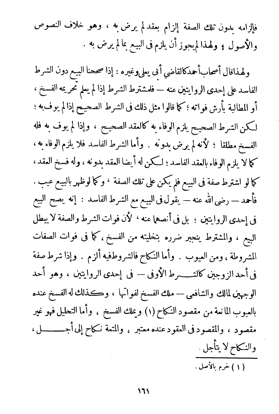 فَإِلْزَامُهُ بِدُونِ تِلْكَ الصِّفَةِ إلْزَامٌ بِعَقْدِ لَمْ يَرْضَ بِهِ وَهُوَ خِلَافُ النُّصُوصِ وَالْأُصُولِ؛ وَلِهَذَا لَمْ يُجَوَّزْ أَنْ يُلْزَمَ فِي الْبَيْعِ بِمَا لَمْ يَرْضَ بِهِ. وَلِهَذَا قَالَ أَصْحَابُ أَحْمَد كَالْقَاضِي أَبِي يَعْلَى وَغَيْرِهِ: إذَا صَحَّحْنَا الْبَيْعَ دُونَ الشَّرْطِ الْفَاسِدِ عَلَى إحْدَى الرِّوَايَتَيْنِ عَنْهُ - فَلِمُشْتَرِطِ الشَّرْطَ إذَا لَمْ يَعْلَمْ تَحْرِيمَهُ الْفَسْخُ أَوْ الْمُطَالَبَةُ بِأَرْشِ فَوَاتِهِ؛ كَمَا قَالُوا مِثْلَ ذَلِكَ فِي الشَّرْطِ الصَّحِيحِ إذَا لَمْ يُوفَ بِهِ؛ لَكِنَّ الشَّرْطَ الصَّحِيحَ يَلْزَمُ الْوَفَاءُ بِهِ كَالْعَقْدِ الصَّحِيحِ وَإِذَا لَمْ يُوفَ بِهِ فَلَهُ الْفَسْخُ مُطْلَقًا؛ لِأَنَّهُ لَمْ يَرْضَ بِدُونِهِ. وَأَمَّا الشَّرْطُ الْفَاسِدُ فَلَا يَلْزَمُ الْوَفَاءُ بِهِ كَمَا لَا يَلْزَمُ الْوَفَاءُ بِالْعَقْدِ الْفَاسِدِ؛ لَكِنْ لَهُ أَيْضًا الْعَقْدُ بِدُونِهِ وَلَهُ فَسْخُ الْعَقْدِ كَمَا لَوْ اشْتَرَطَ صِفَةً فِي الْبَيْعِ فَلَمْ يَكُنْ عَلَى تِلْكَ الصِّفَةِ وَكَمَا لَوْ ظَهَرَ بِالْبَيْعِ عَيْبٌ. فَأَحْمَدُ - رَضِيَ اللَّهُ عَنْهُ - يَقُولُ فِي الْبَيْعِ مَعَ الشَّرْطِ الْفَاسِدِ: إنَّهُ يَصِحُّ الْبَيْعُ فِي إحْدَى الرِّوَايَتَيْنِ؛ بَلْ فِي أَنَصِّهِمَا عَنْهُ لِأَنَّ فَوَاتَ الشَّرْطِ وَالصِّفَةِ لَا يُبْطِلُ الْبَيْعَ وَالْمُشْتَرِطُ يَنْجَبِرُ ضَرَرُهُ بِتَخْلِيَتِهِ مِنْ الْفَسْخِ كَمَا فِي فَوَاتِ الصِّفَاتِ الْمَشْرُوطَةِ مِنْ الْعُيُوبِ. وَأَمَّا النِّكَاحُ فَالشُّرُوطُ فِيهِ أَلْزَمُ. وَإِذَا شَرَطَ صِفَةً فِي أَحَدِ الزَّوْجَيْنِ كَالشَّرْطِ الْأَوْفَى - فِي إحْدَى الرِّوَايَتَيْنِ وَهُوَ أَحَدُ الْوَجْهَيْنِ لِمَالِكِ وَالشَّافِعِيِّ - مَلَكَ الْفَسْخَ لِفَوَاتِهَا وَكَذَلِكَ لَهُ الْفَسْخُ عِنْدَهُ بِالْعُيُوبِ الْمَانِعَةِ مِنْ مَقْصُودِ النِّكَاحِ. . . (1) وَيَمْلِكُ الْفَسْخَ وَأَمَّا التَّحْلِيلُ فَهُوَ غَيْرُ مَقْصُودٍ وَالْمَقْصُودُ فِي الْعُقُودِ عِنْدَهُ مُعْتَبَرٌ وَالْمُتْعَةُ نِكَاحٌ إلَى أَجَلٍ وَالنِّكَاحُ لَا يَتَأَجَّلُ.