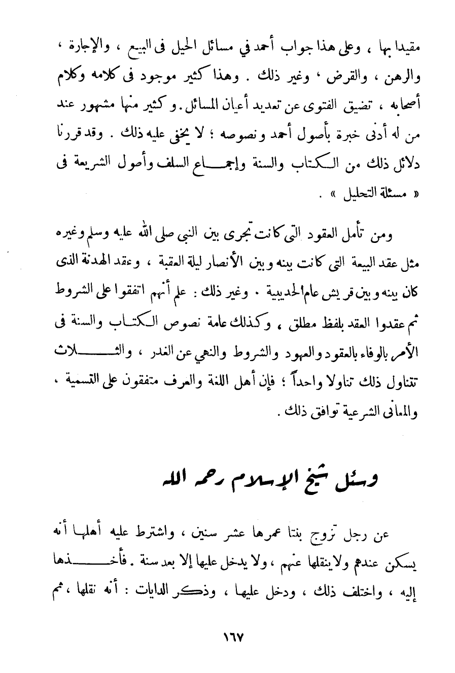 مُقَيَّدًا بِهَا وَعَلَى هَذَا جَوَابُ أَحْمَد فِي مَسَائِلِ الْحِيَلِ فِي الْبَيْعِ وَالْإِجَارَةِ وَالرَّهْنِ وَالْقَرْضِ وَغَيْرِ ذَلِكَ. وَهَذَا كَثِيرٌ مَوْجُودٌ فِي كَلَامِهِ وَكَلَامِ أَصْحَابِهِ تَضِيقُ الْفَتْوَى عَنْ تَعْدِيدِ أَعْيَانِ الْمَسَائِلِ. وَكَثِيرٌ مِنْهَا مَشْهُورٌ عِنْدَ مَنْ لَهُ أَدْنَى خِبْرَةٍ بِأُصُولِ أَحْمَد وَنُصُوصِهِ؛ لَا يَخْفَى عَلَيْهِ ذَلِكَ. وَقَدْ قَرَّرْنَا دَلَائِلَ ذَلِكَ مِنْ الْكِتَابِ وَالسُّنَّةِ وَإِجْمَاعِ السَّلَفِ وَأُصُولِ الشَّرِيعَةِ فِي " مَسْأَلَةِ التَّحْلِيلِ ". وَمَنْ تَأَمَّلَ الْعُقُودَ الَّتِي كَانَتْ تَجْرِي بَيْنَ النَّبِيِّ صَلَّى اللَّهُ عَلَيْهِ وَسَلَّمَ وَغَيْرِهِ مِثْلَ عَقْدِ الْبَيْعَةِ الَّتِي كَانَتْ بَيْنَهُ وَبَيْن الْأَنْصَارِ لَيْلَةَ الْعَقَبَةِ وَعَقْدِ الْهُدْنَةِ الَّذِي كَانَ بَيْنَهُ وَبَيْن قُرَيْشٍ عَامَ الْحُدَيْبِيَةِ. وَغَيْرِ ذَلِكَ: عَلِمَ أَنَّهُمْ اتَّفَقُوا عَلَى الشُّرُوطِ ثُمَّ عَقَدُوا الْعَقْدَ بِلَفْظِ مُطْلَقٍ وَكَذَلِكَ عَامَّةُ نُصُوصِ الْكِتَابِ وَالسُّنَّةِ فِي الْأَمْرِ بِالْوَفَاءِ بِالْعُقُودِ وَالْعُهُودِ وَالشُّرُوطِ وَالنَّهْيِ عَنْ الْغَدْرِ وَالثَّلَاثُ تَتَنَاوَلُ ذَلِكَ تَنَاوُلًا وَاحِدًا؛ فَإِنَّ أَهْلَ اللُّغَةِ وَالْعُرْفِ مُتَّفِقُونَ عَلَى التَّسْمِيَةِ وَالْمَعَانِي الشَّرْعِيَّةُ تُوَافِقُ ذَلِكَ.