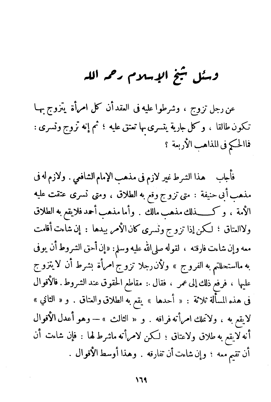 هَذَا الشَّرْطُ غَيْرُ لَازِمٍ فِي مَذْهَبِ الْإِمَامِ الشَّافِعِيِّ. وَلَازِمٌ لَهُ فِي مَذْهَبِ أَبِي حَنِيفَةَ: مَتَى تَزَوَّجَ وَقَعَ بِهِ الطَّلَاقُ وَمَتَى تَسَرَّى عَتَقَتْ عَلَيْهِ الْأَمَةُ وَكَذَلِكَ مَذْهَبُ مَالِكٍ. وَأَمَّا مَذْهَبُ أَحْمَد فَلَا يَقَعُ بِهِ الطَّلَاقُ وَلَا الْعِتَاقُ؛ لَكِنْ إذَا تَزَوَّجَ وَتَسَرَّى كَانَ الْأَمْرُ بِيَدِهَا: إنْ شَاءَتْ أَقَامَتْ مَعَهُ وَإِنْ شَاءَتْ فَارَقَتْهُ لِقَوْلِهِ صَلَّى اللَّهُ عَلَيْهِ وَسَلَّمَ {إنَّ أَحَقَّ الشُّرُوطِ أَنْ يُوفَى بِهِ مَا اسْتَحْلَلْتُمْ بِهِ الْفُرُوجَ} وَلِأَنَّ رَجُلًا تَزَوَّجَ امْرَأَةً بِشَرْطِ أَنْ لَا يَتَزَوَّجَ عَلَيْهَا فَرُفِعَ ذَلِكَ إلَى عُمَرَ فَقَالَ: مَقَاطِعُ الْحُقُوقِ عِنْدَ الشُّرُوطِ. فَالْأَقْوَالُ فِي هَذِهِ الْمَسْأَلَةِ ثَلَاثَةٌ: " أَحَدُهَا " يَقَعُ بِهِ الطَّلَاقُ وَالْعِتَاقُ. و " الثَّانِي " لَا يَقَعُ بِهِ وَلَا تَمْلِكُ امْرَأَتُهُ فِرَاقَهُ. و " الثَّالِثُ " - وَهُوَ أَعْدَلُ الْأَقْوَالِ أَنَّهُ لَا يَقَعُ بِهِ طَلَاقٌ وَلَا عِتَاقٌ؛ لَكِنْ لِامْرَأَتِهِ مَا شَرَطَ لَهَا: فَإِنْ شَاءَتْ تُقِيمُ مَعَهُ؛ وَإِنْ شَاءَتْ أَنْ تُفَارِقَهُ. وَهَذَا أَوْسَطُ الْأَقْوَالِ.