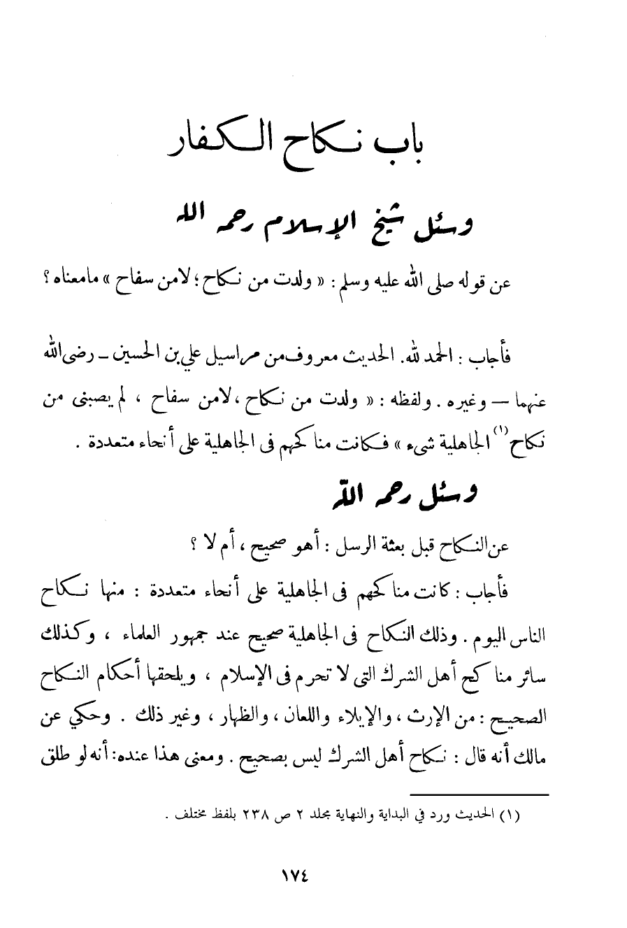والثالث: أن الشيخ رحمه الله ذكر في أثناء الفتوى الثانية قوله (وقد احتج الناس بهذا الحديث على أن نكاح الجاهلية نكاح صحيح) ، ولم يرد في الفتوى الثانية أي حديث تعود إليه الإشارة، وإنما الحديث مذكور في السؤال الذي قبله.
