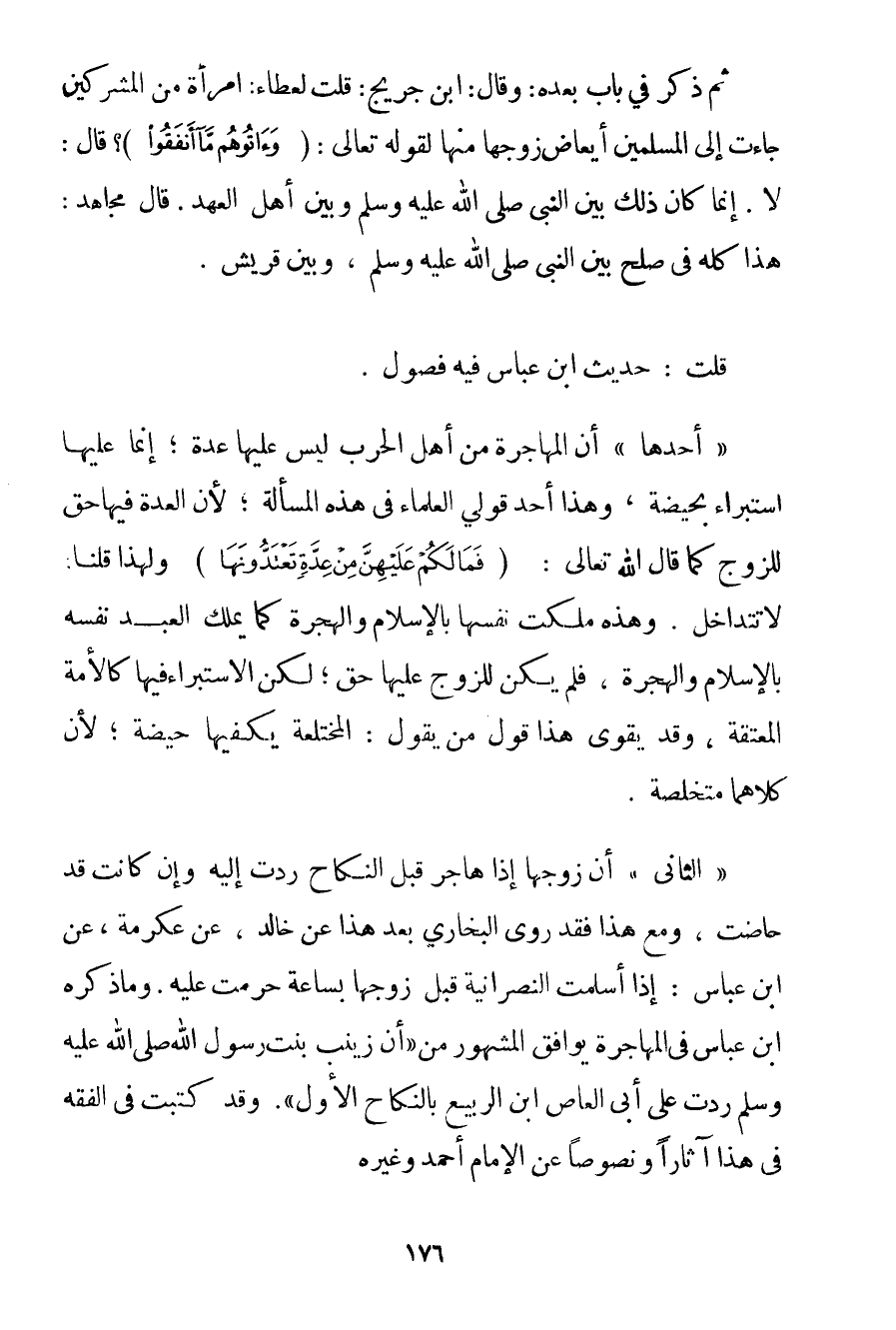 ثُمَّ ذَكَرَ فِي بَابٍ بَعْدَهُ: وَقَالَ: ابْنُ جريج: قُلْت لِعَطَاءِ: امْرَأَةٌ مِنْ الْمُشْرِكِينَ جَاءَتْ إلَى الْمُسْلِمِينَ أَيُعَاضُ زَوْجُهَا مِنْهَا لِقَوْلِهِ تَعَالَى {وَآتُوهُمْ مَا أَنْفَقُوا} ؟ قَالَ: لَا. إنَّمَا كَانَ ذَلِكَ بَيْنَ النَّبِيِّ صَلَّى اللَّهُ عَلَيْهِ وَسَلَّمَ وَبَيْنَ أَهْلِ الْعَهْدِ. قَالَ مُجَاهِدٌ: هَذَا كُلُّهُ فِي صُلْحٍ بَيْنَ النَّبِيِّ صَلَّى اللَّهُ عَلَيْهِ وَسَلَّمَ وَبَيْنَ قُرَيْشٍ. قُلْت: حَدِيثُ ابْنِ عَبَّاسٍ فِيهِ فُصُولٌ. " أَحَدُهَا " أَنَّ الْمُهَاجِرَةَ مِنْ أَهْلِ الْحَرْبِ لَيْسَ عَلَيْهَا عِدَّةٌ؛ إنَّمَا عَلَيْهَا اسْتِبْرَاءٌ بِحَيْضَةِ وَهَذَا أَحَدُ قَوْلَيْ الْعُلَمَاءِ فِي هَذِهِ الْمَسْأَلَةِ؛ لِأَنَّ الْعِدَّةَ فِيهَا حَقٌّ لِلزَّوْجِ كَمَا قَالَ اللَّهُ تَعَالَى: {فَمَا لَكُمْ عَلَيْهِنَّ مِنْ عِدَّةٍ تَعْتَدُّونَهَا} وَلِهَذَا قُلْنَا: لَا تَتَدَاخَلُ. وَهَذِهِ مَلَكَتْ نَفْسَهَا بِالْإِسْلَامِ وَالْهِجْرَةِ كَمَا يَمْلِكُ الْعَبْدُ نَفْسَهُ بِالْإِسْلَامِ وَالْهِجْرَةِ فَلَمْ يَكُنْ لِلزَّوْجِ عَلَيْهَا حَقٌّ؛ لَكِنَّ الِاسْتِبْرَاءَ فِيهَا كَالْأَمَةِ الْمُعْتَقَةِ وَقَدْ يُقَوِّي هَذَا قَوْلَ مَنْ يَقُولُ: الْمُخْتَلَعَةُ يَكْفِيهَا حَيْضَةٌ؛ لِأَنَّ كِلَاهُمَا مُتَخَلِّصَةٌ. " الثَّانِي " أَنَّ زَوْجَهَا إذَا هَاجَرَ قَبْلَ النِّكَاحِ رُدَّتْ إلَيْهِ وَإِنْ كَانَتْ قَدْ حَاضَتْ وَمَعَ هَذَا فَقَدَ رَوَى الْبُخَارِيُّ بَعْدَ هَذَا عَنْ خَالِدٍ عَنْ عِكْرِمَةَ عَنْ ابْنِ عَبَّاسٍ: إذَا أَسْلَمَتْ النَّصْرَانِيَّةُ قَبْلَ زَوْجِهَا بِسَاعَةِ حُرِّمَتْ عَلَيْهِ. وَمَا ذَكَرَهُ ابْنُ عَبَّاسٍ فِي الْمُهَاجِرَةِ يُوَافِقُ الْمَشْهُورَ مِنْ {أَنَّ زَيْنَبَ بِنْتَ رَسُولِ اللَّهِ صَلَّى اللَّهُ عَلَيْهِ وَسَلَّمَ رُدَّتْ عَلَى أَبِي العاص بْنِ الرَّبِيعِ بِالنِّكَاحِ الْأَوَّلِ} وَقَدْ كَتَبْت فِي الْفِقْهِ فِي هَذَا آثَارًا وَنُصُوصًا عَنْ الْإِمَامِ أَحْمَد وَغَيْرِهِ.
