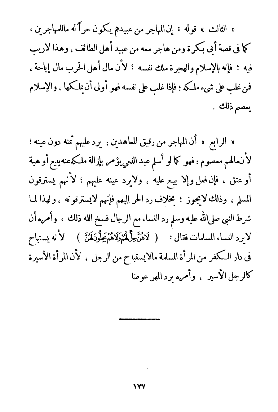 " الثَّالِثُ " قَوْلُهُ: إنَّ الْمُهَاجِرَ مِنْ عَبِيدِهِمْ يَكُونُ حُرًّا لَهُ مَا لِلْمُهَاجِرِينَ؛ كَمَا فِي قِصَّةِ أَبِي بَكْرَةَ وَمَنْ هَاجَرَ مَعَهُ مِنْ عَبِيدِ أَهْلِ الطَّائِفِ وَهَذَا لَا رَيْبَ فِيهِ؛ فَإِنَّهُ بِالْإِسْلَامِ وَالْهِجْرَةِ مَلَكَ نَفْسَهُ؛ لِأَنَّ مَالَ أَهْلِ الْحَرْبِ مَالُ إبَاحَةٍ فَمَنْ غَلَبَ عَلَى شَيْءٍ مَلَكَهُ؛ فَإِذَا غَلَبَ عَلَى نَفْسِهِ فَهُوَ أَوْلَى أَنْ يَمْلِكَهَا وَالْإِسْلَامُ يَعْصِمُ ذَلِكَ.