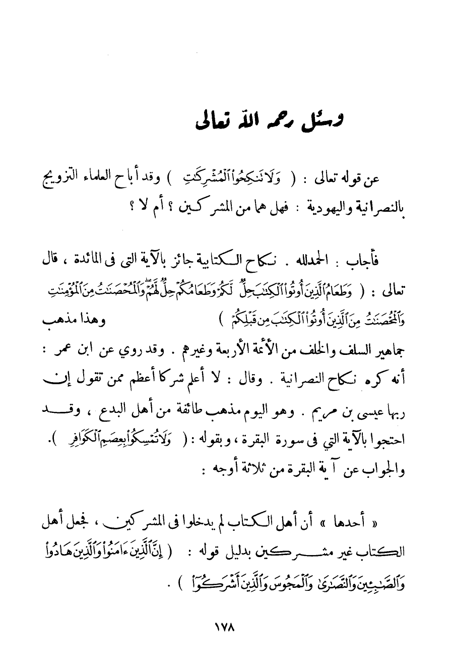 الْحَمْدُ لِلَّهِ، نِكَاحُ الْكِتَابِيَّةِ جَائِزٌ بِالْآيَةِ الَّتِي فِي الْمَائِدَةِ قَالَ تَعَالَى: {وَطَعَامُ الَّذِينَ أُوتُوا الْكِتَابَ حِلٌّ لَكُمْ وَطَعَامُكُمْ حِلٌّ لَهُمْ وَالْمُحْصَنَاتُ مِنَ الْمُؤْمِنَاتِ وَالْمُحْصَنَاتُ مِنَ الَّذِينَ أُوتُوا الْكِتَابَ مِنْ قَبْلِكُمْ} وَهَذَا مَذْهَبُ جَمَاهِيرِ السَّلَفِ وَالْخَلَفِ مِنْ الْأَئِمَّةِ الْأَرْبَعَةِ وَغَيْرِهِمْ. وَقَدْ رُوِيَ عَنْ ابْنِ عُمَرَ: أَنَّهُ كَرِهَ نِكَاحَ النَّصْرَانِيَّةِ. وَقَالَ: لَا أَعْلَمُ شُرَكَاءَ أَعْظَمَ مِمَّنْ تَقُولُ إنَّ رَبَّهَا عِيسَى ابْنُ مَرْيَمَ. وَهُوَ الْيَوْمُ مَذْهَبُ طَائِفَةٍ مِنْ أَهْلِ الْبِدَعِ وَقَدْ احْتَجُّوا بِالْآيَةِ الَّتِي فِي سُورَةِ الْبَقَرَةِ وَبِقَوْلِهِ: {وَلَا تُمْسِكُوا بِعِصَمِ الْكَوَافِرِ} . وَالْجَوَابُ عَنْ آيَةِ الْبَقَرَةِ مِنْ ثَلَاثَةِ أَوْجُهٍ: " أَحَدُهَا " أَنَّ أَهْلَ الْكِتَابِ لَمْ يَدْخُلُوا فِي الْمُشْرِكِينَ فَجُعِلَ أَهْلُ الْكِتَابِ غَيْرَ مُشْرِكِينَ بِدَلِيلِ قَوْلِهِ: {إنَّ الَّذِينَ آمَنُوا وَالَّذِينَ هَادُوا وَالصَّابِئِينَ وَالنَّصَارَى وَالْمَجُوسَ وَالَّذِينَ أَشْرَكُوا} .