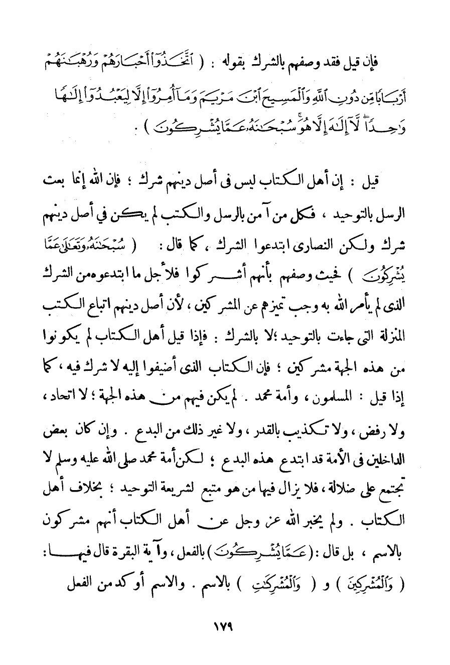 فَإِنْ قِيلَ فَقَدْ وَصَفَهُمْ بِالشِّرْكِ بِقَوْلِهِ: {اتَّخَذُوا أَحْبَارَهُمْ وَرُهْبَانَهُمْ أَرْبَابًا مِنْ دُونِ اللَّهِ وَالْمَسِيحَ ابْنَ مَرْيَمَ وَمَا أُمِرُوا إلَّا لِيَعْبُدُوا إلَهًا وَاحِدًا لَا إلَهَ إلَّا هُوَ سُبْحَانَهُ عَمَّا يُشْرِكُونَ} . قِيلَ: إنَّ أَهْلَ الْكِتَابِ لَيْسَ فِي أَصْلِ دِينِهِمْ شِرْكٌ؛ فَإِنَّ اللَّهَ إنَّمَا بَعَثَ الرُّسُلَ بِالتَّوْحِيدِ فَكُلُّ مَنْ آمَنَ بِالرُّسُلِ وَالْكُتُبِ لَمْ يَكُنْ فِي أَصْلِ دِينِهِمْ شِرْكٌ وَلَكِنَّ النَّصَارَى ابْتَدَعُوا الشِّرْكَ كَمَا قَالَ: {سُبْحَانَهُ وَتَعَالَى عَمَّا يُشْرِكُونَ} فَحَيْثُ وَصَفَهُمْ بِأَنَّهُمْ أَشْرَكُوا فَلِأَجْلِ مَا ابْتَدَعُوهُ مِنْ الشِّرْكِ الَّذِي لَمْ يَأْمُرْ اللَّهُ بِهِ وَجَبَ تَمَيُّزُهُمْ عَنْ الْمُشْرِكِينَ لِأَنَّ أَصْلَ دِينِهِمْ اتِّبَاعُ الْكُتُبِ الْمُنَزَّلَةِ الَّتِي جَاءَتْ بِالتَّوْحِيدِ؛ لَا بِالشِّرْكِ: فَإِذَا قِيلَ أَهْلُ الْكِتَابِ لَمْ يَكُونُوا مِنْ هَذِهِ الْجِهَةِ مُشْرِكِينَ؛ فَإِنَّ الْكِتَابَ الَّذِي أُضِيفُوا إلَيْهِ لَا شِرْكَ فِيهِ كَمَا إذَا قِيلَ: الْمُسْلِمُونَ وَأُمَّةُ مُحَمَّدٍ. لَمْ يَكُنْ فِيهِمْ مِنْ هَذِهِ الْجِهَةِ؛ لَا اتِّحَادٌ وَلَا رَفْضٌ وَلَا تَكْذِيبٌ بِالْقَدَرِ وَلَا غَيْرُ ذَلِكَ مِنْ الْبِدَعِ. وَإِنْ كَانَ بَعْضُ الدَّاخِلِينَ فِي الْأُمَّةِ قَدْ ابْتَدَعَ هَذِهِ الْبِدَعَ؛ لَكِنَّ أُمَّةَ مُحَمَّدٍ صَلَّى اللَّهُ عَلَيْهِ وَسَلَّمَ لَا تَجْتَمِعُ عَلَى ضَلَالَةٍ فَلَا يَزَالُ فِيهَا مَنْ هُوَ مُتَّبِعٌ لِشَرِيعَةِ التَّوْحِيدِ؛ بِخِلَافِ أَهْلِ الْكِتَابِ. وَلَمْ يُخْبِرْ اللَّهُ عَزَّ وَجَلَّ عَنْ أَهْلِ الْكِتَابِ أَنَّهُمْ مُشْرِكُونَ بِالِاسْمِ بَلْ قَالَ: {عَمَّا يُشْرِكُونَ} بِالْفِعْلِ وَآيَةُ الْبَقَرَةِ قَالَ فِيهَا: (الْمُشْرِكِينَ) وَ (الْمُشْرِكَاتِ) بِالِاسْمِ. وَالِاسْمُ أَوْكَدُ مِنْ الْفِعْلِ