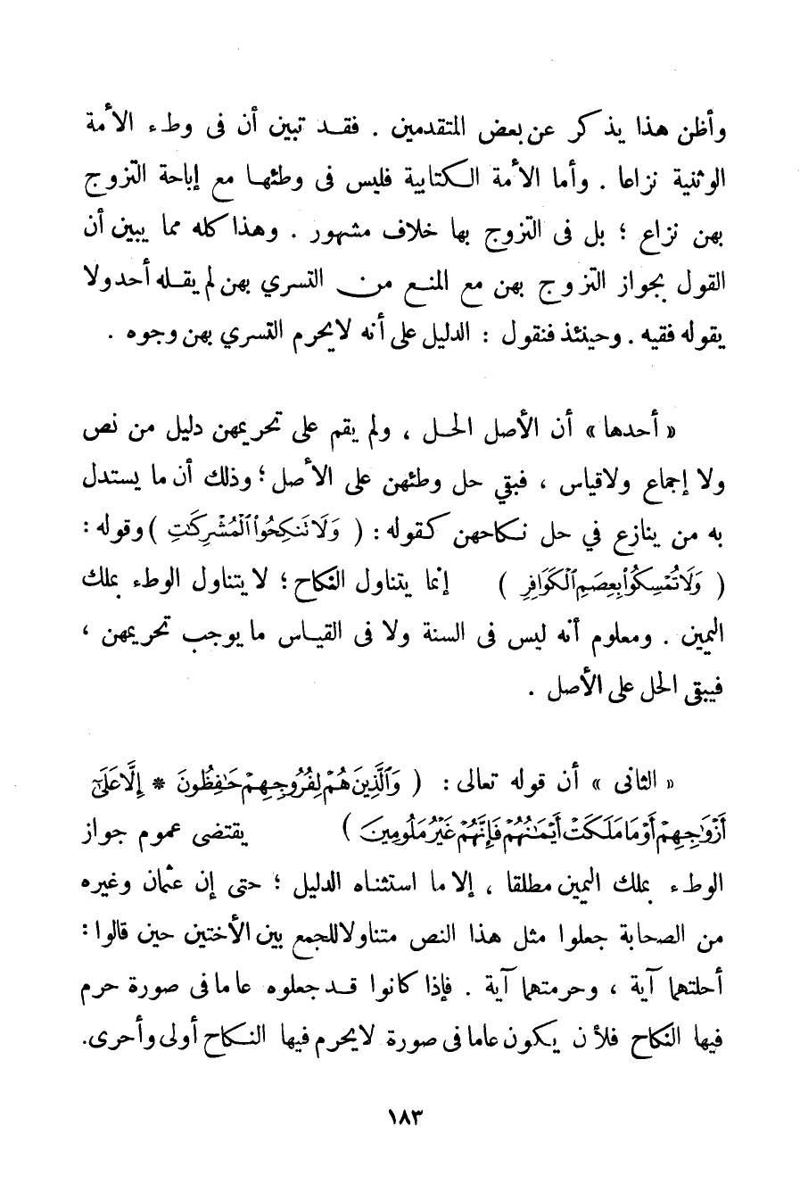 وَأَظُنُّ. هَذَا يُذْكَرُ عَنْ بَعْضِ الْمُتَقَدِّمِينَ. فَقَدْ تَبَيَّنَ أَنَّ فِي وَطْءِ الْأَمَةِ الْوَثَنِيَّةِ نِزَاعًا. وَأَمَّا الْأَمَةُ الْكِتَابِيَّةُ فَلَيْسَ فِي وَطْئِهَا مَعَ إبَاحَةِ التَّزَوُّجِ بِهِنَّ نِزَاعٌ؛ بَلْ فِي التَّزَوُّجِ بِهَا خِلَافٌ مَشْهُورٌ. وَهَذَا كُلُّهُ مِمَّا يُبَيِّنُ أَنَّ الْقَوْلَ بِجَوَازِ التَّزَوُّجِ بِهِنَّ مَعَ الْمَنْعِ مِنْ التَّسَرِّي بِهِنَّ لَمْ يَقُلْهُ أَحَدٌ وَلَا يَقُولُهُ فَقِيهٌ. وَحِينَئِذٍ فَنَقُولُ: الدَّلِيلُ عَلَى أَنَّهُ لَا يَحْرُمُ التَّسَرِّي بِهِنَّ وُجُوهٌ: " أَحَدُهَا " أَنَّ الْأَصْلَ الْحِلُّ وَلَمْ يَقُمْ عَلَى تَحْرِيمِهِنَّ دَلِيلٌ مِنْ نَصٍّ وَلَا إجْمَاعٍ وَلَا قِيَاسٍ فَبَقِيَ حِلُّ وَطْئِهِنَّ عَلَى الْأَصْلِ؛ وَذَلِكَ أَنَّ مَا يَسْتَدِلُّ بِهِ مَنْ يُنَازِعُ فِي حِلِّ نِكَاحِهِنَّ كَقَوْلِهِ: {وَلَا تَنْكِحُوا الْمُشْرِكَاتِ} وَقَوْلِهِ: {وَلَا تُمْسِكُوا بِعِصَمِ الْكَوَافِرِ} إنَّمَا يَتَنَاوَلُ النِّكَاحَ؛ لَا يَتَنَاوَلُ الْوَطْءَ بِمِلْكِ الْيَمِينِ. وَمَعْلُومٌ أَنَّهُ لَيْسَ فِي السُّنَّةِ وَلَا فِي الْقِيَاسِ مَا يُوجِبُ تَحْرِيمَهُنَّ فَيَبْقَى الْحِلُّ عَلَى الْأَصْلِ. " الثَّانِي " أَنَّ قَوْله تَعَالَى {وَالَّذِينَ هُمْ لِفُرُوجِهِمْ حَافِظُونَ} {إلَّا عَلَى أَزْوَاجِهِمْ أوْ مَا مَلَكَتْ أَيْمَانُهُمْ فَإِنَّهُمْ غَيْرُ مَلُومِينَ} يَقْتَضِي عُمُومَ جَوَازِ الْوَطْءِ بِمِلْكِ الْيَمِينِ مُطْلَقًا إلَّا مَا اسْتَثْنَاهُ الدَّلِيلُ؛ حَتَّى إنَّ عُثْمَانَ وَغَيْرَهُ مِنْ الصَّحَابَةِ جَعَلُوا مِثْلَ هَذَا النَّصِّ مُتَنَاوِلًا لِلْجَمْعِ بَيْنَ الْأُخْتَيْنِ حِينَ قَالُوا: أَحَلَّتْهُمَا آيَةٌ وَحَرَّمَتْهُمَا آيَةٌ. فَإِذَا كَانُوا قَدْ جَعَلُوهُ عَامًّا فِي صُورَةٍ حُرِّمَ فِيهَا النِّكَاحُ فَلَأَنْ يَكُونَ عَامًّا فِي صُورَةٍ لَا يَحْرُمُ فِيهَا النِّكَاحُ أَوْلَى وَأَحْرَى.