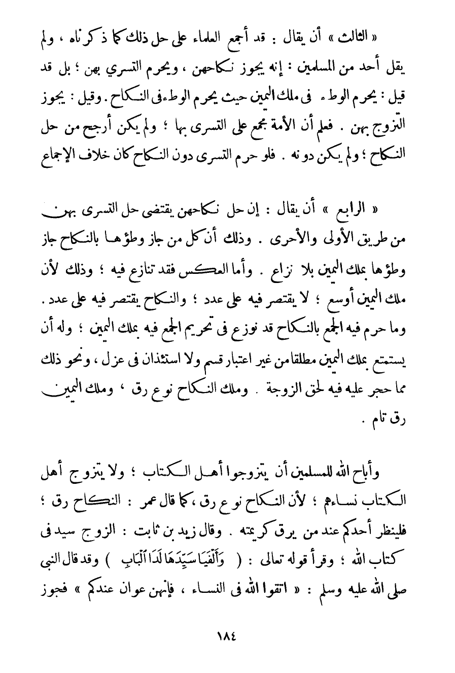" الثَّالِثُ " أَنْ يُقَالَ: قَدْ أَجْمَعَ الْعُلَمَاءُ عَلَى حِلِّ ذَلِكَ كَمَا ذَكَرْنَاهُ وَلَمْ يَقُلْ أَحَدٌ مِنْ الْمُسْلِمِينَ: إنَّهُ يَجُوزُ نِكَاحُهُنَّ وَيَحْرُمُ التَّسَرِّي بِهِنَّ؛ بَلْ قَدْ قِيلَ: يَحْرُمُ الْوَطْءُ فِي مِلْكِ الْيَمِينِ حَيْثُ يَحْرُمُ الْوَطْءُ فِي النِّكَاحِ. وَقِيلَ: يَجُوزُ التَّزَوُّجُ بِهِنَّ. فَعُلِمَ أَنَّ الْأَمَةَ مُجْمَعٌ عَلَى التَّسَرِّي بِهَا وَلَمْ يَكُنْ أَرْجَحَ مِنْ حِلِّ النِّكَاحِ؛ وَلَمْ يَكُنْ دُونَهُ. فَلَوْ حَرُمَ التَّسَرِّي دُونَ النِّكَاحِ كَانَ خِلَافَ الْإِجْمَاعِ " الرَّابِعُ " أَنْ يُقَالَ: إنَّ حِلَّ نِكَاحِهِنَّ يَقْتَضِي حِلَّ التَّسَرِّي بِهِنَّ مِنْ طَرِيقِ الْأَوْلَى وَالْأَحْرَى. وَذَلِكَ أَنَّ كُلَّ مَنْ جَازَ وَطْؤُهَا بِالنِّكَاحِ جَازَ وَطْؤُهَا بِمِلْكِ الْيَمِينِ بِلَا نِزَاعٍ. وَأَمَّا الْعَكْسُ فَقَدْ تَنَازَعَ فِيهِ؛ وَذَلِكَ لِأَنَّ مِلْكَ الْيَمِينِ أَوْسَعُ؛ لَا يُقْتَصَرُ فِيهِ عَلَى عَدَدٍ؛ وَالنِّكَاحُ يُقْتَصَرُ فِيهِ عَلَى عَدَدٍ. وَمَا حُرِّمَ فِيهِ الْجَمْعُ بِالنِّكَاحِ قَدْ نُوزِعَ فِي تَحْرِيمِ الْجَمْعِ فِيهِ بِمِلْكِ الْيَمِينِ؛ وَلَهُ أَنْ يَسْتَمْتِع بِمِلْكِ الْيَمِينِ مُطْلَقًا مِنْ غَيْرِ اعْتِبَارِ قَسَمٍ وَلَا اسْتِئْذَانٍ فِي عَزْلٍ وَنَحْوِ ذَلِكَ مِمَّا حُجِرَ عَلَيْهِ فِيهِ لِحَقِّ الزَّوْجَةِ. وَمِلْكُ النِّكَاحِ نَوْعُ رِقٍّ وَمِلْكُ الْيَمِينِ رِقٌّ تَامٌّ وَأَبَاحَ اللَّهُ لِلْمُسْلِمِينَ أَنْ يَتَزَوَّجُوا أَهْلَ الْكِتَابِ؛ وَلَا يَتَزَوَّجُ أَهْلُ الْكِتَابِ نِسَاءَهُمْ؛ لِأَنَّ النِّكَاحَ نَوْعُ رِقٍّ كَمَا قَالَ عُمَرُ: النِّكَاحُ رِقٌّ؛ فَلْيَنْظُرْ أَحَدُكُمْ عِنْدَ مَنْ يُرِقُّ كَرِيمَتَهُ. وَقَالَ زَيْدُ بْنُ ثَابِتٍ: الزَّوْجُ سَيِّدٌ فِي كِتَابِ اللَّهِ؛ وَقَرَأَ قَوْله تَعَالَى {وَأَلْفَيَا سَيِّدَهَا لَدَى الْبَابِ} وَقَدْ قَالَ النَّبِيُّ صَلَّى اللَّهُ عَلَيْهِ وَسَلَّمَ {اتَّقُوا اللَّهَ فِي النِّسَاءِ فَإِنَّهُنَّ عَوَانٌ عِنْدَكُمْ} فَجُوِّزَ