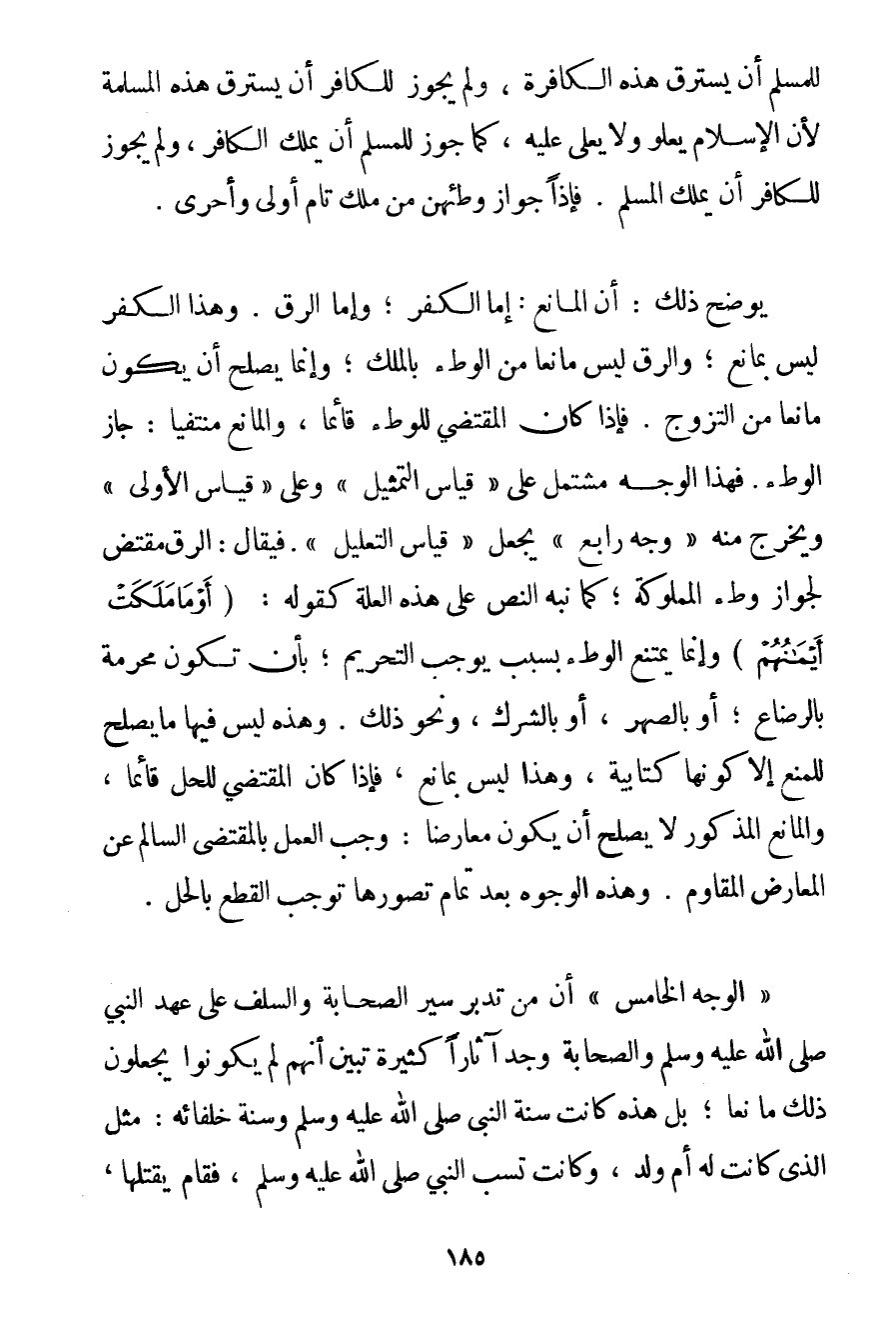 لِلْمُسْلِمِ أَنْ يَسْتَرِقَّ هَذِهِ الْكَافِرَةَ وَلَمْ يُجَوَّزْ لِلْكَافِرِ أَنْ يَسْتَرِقَّ هَذِهِ الْمُسْلِمَةَ لِأَنَّ الْإِسْلَامَ يَعْلُو وَلَا يُعْلَى عَلَيْهِ كَمَا جُوِّزَ لِلْمُسْلِمِ أَنْ يَمْلِكَ الْكَافِرَ وَلَمْ يُجَوَّزْ لِلْكَافِرِ أَنْ يَمْلِكَ الْمُسْلِمَ. فَإِذًا جَوَازُ وَطْئِهِنَّ مِنْ مِلْكٍ تَامٍّ أَوْلَى وَأَحْرَى. يُوَضِّحُ ذَلِكَ: أَنَّ الْمَانِعَ: إمَّا الْكُفْرُ؛ وَإِمَّا الرِّقُّ. وَهَذَا الْكُفْرُ لَيْسَ بِمَانِعِ؛ وَالرِّقُّ لَيْسَ مَانِعًا مِنْ الْوَطْءِ بِالْمِلْكِ؛ وَإِنَّمَا يَصْلُحُ أَنْ يَكُونَ مَانِعًا مِنْ التَّزَوُّجِ. فَإِذَا كَانَ الْمُقْتَضِي لِلْوَطْءِ قَائِمًا وَالْمَانِعُ مُنْتَفِيًا: جَازَ الْوَطْءُ. فَهَذَا الْوَجْهُ مُشْتَمِلٌ عَلَى " قِيَاسِ التَّمْثِيلِ " وَعَلَى " قِيَاس الْأَوْلَى " وَيَخْرُجُ مِنْهُ " وَجْهٌ رَابِعٌ " يُجْعَلُ " قِيَاسَ التَّعْلِيلِ ". فَيُقَالُ: الرِّقُّ مُقْتَضٍ لِجَوَازِ وَطْءِ الْمَمْلُوكَةِ؛ كَمَا نَبَّهَ النَّصُّ عَلَى هَذِهِ الْعِلَّةِ كَقَوْلِهِ: {أَوْ مَا مَلَكَتْ أَيْمَانُكُمْ} وَإِنَّمَا يَمْتَنِعُ الْوَطْءُ بِسَبَبِ. يُوجِبُ التَّحْرِيمَ؛ بِأَنْ تَكُونَ مُحَرَّمَةً بِالرِّضَاعِ؛ أَوْ بِالصِّهْرِ أَوْ بِالشِّرْكِ وَنَحْوِ ذَلِكَ. وَهَذِهِ لَيْسَ فِيهَا مَا يَصْلُحُ لِلْمَنْعِ إلَّا كَوْنُهَا كِتَابِيَّةً وَهَذَا لَيْسَ بِمَانِعِ فَإِذَا كَانَ الْمُقْتَضِي لِلْحِلِّ قَائِمًا وَالْمَانِعُ الْمَذْكُورُ لَا يَصْلُحُ أَنْ يَكُونَ مُعَارِضًا: وَجَبَ الْعَمَلُ بِالْمُقْتَضِي السَّالِمِ عَنْ الْمَعَارِضِ الْمُقَاوِمِ. وَهَذِهِ الْوُجُوهُ بَعْدَ تَمَامِ تَصَوُّرِهَا تُوجِبُ الْقَطْعَ بِالْحِلِّ. " الْوَجْهُ الْخَامِسُ " أَنَّ مَنْ تَدَبَّرَ سِيَرَ الصَّحَابَةِ وَالسَّلَفِ عَلَى عَهْدِ النَّبِيِّ صَلَّى اللَّهُ عَلَيْهِ وَسَلَّمَ وَالصَّحَابَةِ وَجَدَ آثَارًا كَثِيرَةً تُبَيِّنُ أَنَّهُمْ لَمْ يَكُونُوا يَجْعَلُونَ ذَلِكَ مَانِعًا؛ بَلْ هَذِهِ كَانَتْ سُنَّةَ النَّبِيِّ صَلَّى اللَّهُ عَلَيْهِ وَسَلَّمَ وَسُنَّةَ خُلَفَائِهِ: مِثْلُ الَّذِي كَانَتْ لَهُ أُمُّ وَلَدٍ وَكَانَتْ تَسُبُّ النَّبِيَّ صَلَّى اللَّهُ عَلَيْهِ وَسَلَّمَ فَقَامَ يَقْتُلُهَا