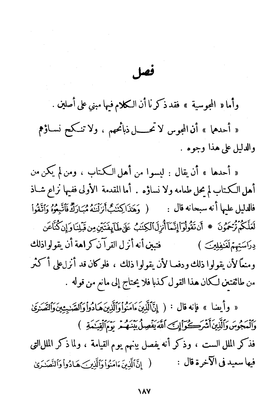 " أَحَدُهُمَا " أَنَّ الْمَجُوسَ لَا تَحِلُّ ذَبَائِحُهُمْ وَلَا تُنْكَحُ نِسَاؤُهُمْ وَالدَّلِيلُ عَلَى هَذَا وُجُوهٌ. " أَحَدُهَا " أَنْ يُقَالَ: لَيْسُوا مِنْ أَهْلِ الْكِتَابِ وَمَنْ لَمْ يَكُنْ مِنْ أَهْلِ الْكِتَابِ لَمْ يَحِلَّ طَعَامُهُ وَلَا نِسَاؤُهُ. أَمَّا الْمُقَدِّمَةُ الْأُولَى فَفِيهَا نِزَاعٌ شَاذٌّ فَالدَّلِيلُ عَلَيْهَا أَنَّهُ سُبْحَانَهُ قَالَ: {وَهَذَا كِتَابٌ أَنْزَلْنَاهُ مُبَارَكٌ فَاتَّبِعُوهُ وَاتَّقُوا لَعَلَّكُمْ تُرْحَمُونَ} {أَنْ تَقُولُوا إنَّمَا أُنْزِلَ الْكِتَابُ عَلَى طَائِفَتَيْنِ مِنْ قَبْلِنَا وَإِنْ كُنَّا عَنْ دِرَاسَتِهِمْ لَغَافِلِينَ} فَتَبَيَّنَ أَنَّهُ أَنْزَلَ الْقُرْآنَ كَرَاهَةَ أَنْ يَقُولُوا ذَلِكَ وَمَنْعًا لِأَنْ يَقُولُوا ذَلِكَ وَدَفْعًا لِأَنْ يَقُولُوا ذَلِكَ فَلَوْ كَانَ قَدْ أُنْزِلَ عَلَى أَكْثَرَ مِنْ طَائِفَتَيْنِ لَكَانَ هَذَا الْقَوْلُ كَذِبًا فَلَا يَحْتَاجُ إلَى مَانِعٍ مِنْ قَوْلِهِ. (وَأَيْضًا فَإِنَّهُ قَالَ: {إنَّ الَّذِينَ آمَنُوا وَالَّذِينَ هَادُوا وَالصَّابِئِينَ وَالنَّصَارَى وَالْمَجُوسَ وَالَّذِينَ أَشْرَكُوا إنَّ اللَّهَ يَفْصِلُ بَيْنَهُمْ يَوْمَ الْقِيَامَةِ} فَذَكَرَ الْمِلَلَ السِّتَّ وَذَكَرَ أَنَّهُ يَفْصِلُ بَيْنَهُمْ يَوْمَ الْقِيَامَةِ وَلَمَّا ذَكَرَ الْمِلَلَ الَّتِي فِيهَا سَعِيدٌ فِي الْآخِرَةِ قَالَ: {إنَّ الَّذِينَ آمَنُوا وَالَّذِينَ هَادُوا وَالنَّصَارَى