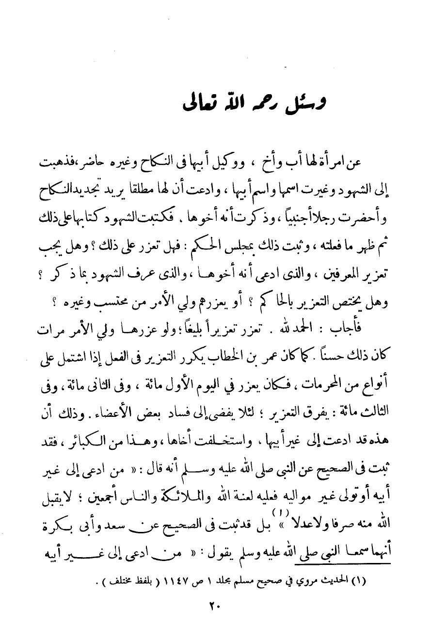 الْحَمْدُ لِلَّهِ، تُعَزَّرُ تَعْزِيرًا بَلِيغًا؛ وَلَوْ عَزَّرَهَا وَلِيُّ الْأَمْرِ مَرَّاتٍ كَانَ ذَلِكَ حَسَنًا كَمَا كَانَ عُمَرُ بْنُ الْخَطَّابِ يُكَرِّرُ التَّعْزِيرَ فِي الْفِعْلِ إذَا اشْتَمَلَ عَلَى أَنْوَاعٍ مِنْ الْمُحَرَّمَاتِ فَكَانَ يُعَزِّرُ فِي الْيَوْمِ الْأَوَّلِ مِائَةً وَفِي الثَّانِي مِائَةً وَفِي الثَّالِثِ مِائَةً: يُفَرِّقُ التَّعْزِيرَ؛ لِئَلَّا يُفْضِي إلَى فَسَادِ بَعْضِ الْأَعْضَاءِ. وَذَلِكَ أَنَّ هَذِهِ قَدْ ادَّعَتْ إلَى غَيْرِ أَبِيهَا وَاسْتَخْلَفَتْ أَخَاهَا وَهَذَا مِنْ الْكَبَائِرِ فَقَدْ ثَبَتَ فِي الصَّحِيحِ عَنْ النَّبِيِّ صَلَّى اللَّهُ عَلَيْهِ وَسَلَّمَ أَنَّهُ قَالَ: {مَنْ ادَّعَى إلَى غَيْرِ أَبِيهِ أَوْ تَوَلَّى غَيْرَ مَوَالِيهِ فَعَلَيْهِ لَعْنَةُ اللَّهِ وَالْمَلَائِكَةِ وَالنَّاسِ أَجْمَعِينَ؛ لَا يَقْبَلُ اللَّهُ مِنْهُ صَرْفًا وَلَا عَدْلًا} بَلْ قَدْ ثَبَتَ فِي الصَّحِيحِ عَنْ سَعْدٍ وَأَبِي بَكْرَةَ أَنَّهُمَا سَمِعَا النَّبِيَّ صَلَّى اللَّهُ عَلَيْهِ وَسَلَّمَ يَقُولُ: {مَنْ ادَّعَى إلَى غَيْرِ أَبِيهِ