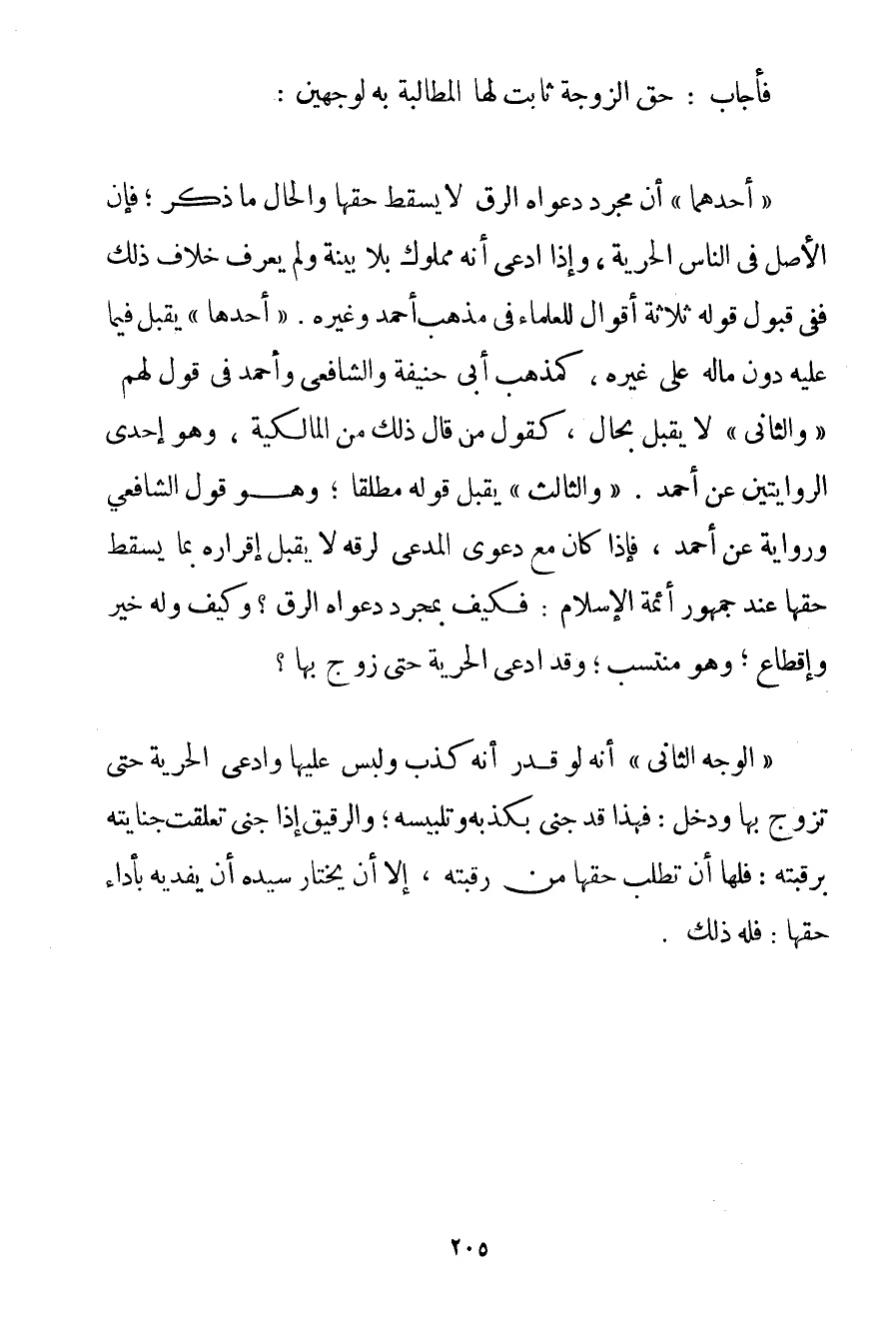 حَقُّ الزَّوْجَةِ ثَابِتٌ لَهَا الْمُطَالَبَةُ بِهِ لِوَجْهَيْنِ: " أَحَدُهُمَا " أَنَّ مُجَرَّدَ دَعْوَاهُ الرِّقَّ لَا يُسْقِطُ حَقَّهَا وَالْحَالُ مَا ذَكَرَ؛ فَإِنَّ الْأَصْلَ فِي النَّاسِ الْحُرِّيَّةُ وَإِذَا ادَّعَى أَنَّهُ مَمْلُوكٌ بِلَا بَيِّنَةٍ وَلَمْ يُعْرَفْ خِلَافُ ذَلِكَ فَفِي قَبُولِ قَوْلِهِ ثَلَاثَةُ أَقْوَالٍ لِلْعُلَمَاءِ فِي مَذْهَبِ أَحْمَد وَغَيْرِهِ. " أَحَدُهَا " يُقْبَلُ فِيمَا عَلَيْهِ دُونَ مَالِهِ عَلَى غَيْرِهِ كَمَذْهَبِ أَبِي حَنِيفَةَ وَالشَّافِعِيِّ وَأَحْمَد فِي قَوْلٍ لَهُمْ. " وَالثَّانِي " لَا يُقْبَلُ بِحَالِ كَقَوْلِ مَنْ قَالَ ذَلِكَ مِنْ الْمَالِكِيَّةِ وَهُوَ إحْدَى الرِّوَايَتَيْنِ عَنْ أَحْمَد. " وَالثَّالِثُ " يُقْبَلُ قَوْلُهُ مُطْلَقًا؛ وَهُوَ قَوْلُ الشَّافِعِيِّ وَرِوَايَةٌ عَنْ أَحْمَد فَإِذَا كَانَ مَعَ دَعْوَى الْمُدَّعِي لِرِقِّهِ لَا يُقْبَلُ إقْرَارُهُ بِمَا يُسْقِطُ حَقَّهَا عِنْدَ جُمْهُورِ أَئِمَّةِ الْإِسْلَامِ: فَكَيْفَ بِمُجَرَّدِ دَعْوَاهُ الرِّقَّ؟ وَكَيْفَ وَلَهُ خَيْرٌ وَإِقْطَاعٌ؛ وَهُوَ مُنْتَسِبٌ؛ وَقَدْ ادَّعَى الْحُرِّيَّةَ حَتَّى زُوِّجَ بِهَا؟ " الْوَجْهُ الثَّانِي " أَنَّهُ لَوْ قُدِّرَ أَنَّهُ كَذَبَ وَلَبَّسَ عَلَيْهَا وَادَّعَى الْحُرِّيَّةَ حَتَّى تَزَوَّجَ بِهَا وَدَخَلَ: فَهَذَا قَدْ جَنَى بِكَذِبِهِ وَتَلْبِيسِهِ؛ وَالرَّقِيقُ إذَا جَنَى تَعَلَّقَتْ جِنَايَتُهُ بِرَقَبَتِهِ: فَلَهَا أَنْ تَطْلُبَ حَقَّهَا مِنْ رَقَبَتِهِ إلَّا أَنْ يَخْتَارَ سَيِّدُهُ أَنْ يَفْدِيَهُ بِأَدَاءِ حَقِّهَا: فَلَهُ ذَلِكَ.