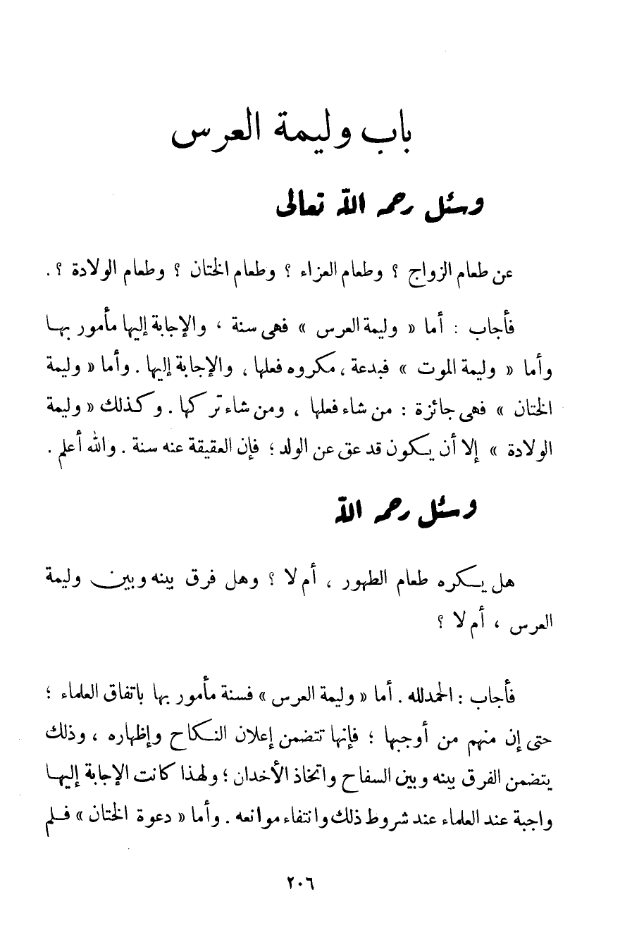 فَأَجَابَ: أَمَّا " وَلِيمَةُ الْعُرْسِ " فَهِيَ سُنَّةٌ وَالْإِجَابَةُ إلَيْهَا مَأْمُورٌ بِهَا وَأَمَّا " وَلِيمَةُ الْمَوْتِ " فَبِدْعَةٌ مَكْرُوهٌ فِعْلُهَا وَالْإِجَابَةُ إلَيْهَا. وَأَمَّا " وَلِيمَةُ الْخِتَانِ " فَهِيَ جَائِزَةٌ: مَنْ شَاءَ فَعَلَهَا وَمَنْ شَاءَ تَرَكَهَا. وَكَذَلِكَ " وَلِيمَةُ الْوِلَادَةِ " إلَّا أَنْ يَكُونَ قَدْ عَقَّ عَنْ الْوَلَدِ؛ فَإِنَّ الْعَقِيقَةَ عَنْهُ سُنَّةٌ. وَاَللَّهُ أَعْلَمُ.