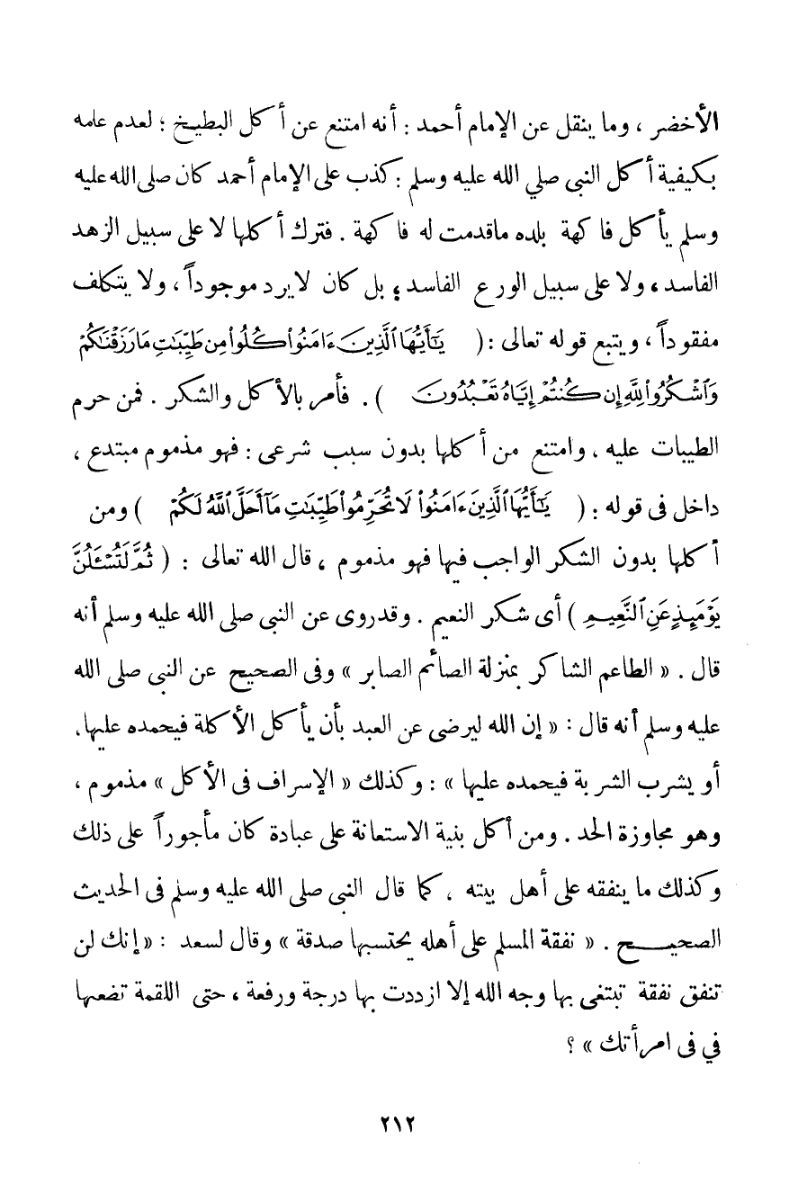 الْأَخْضَرُ وَمَا يُنْقَلُ عَنْ الْإِمَامِ أَحْمَد: أَنَّهُ امْتَنَعَ عَنْ أَكْلِ الْبِطِّيخِ؛ لِعَدَمِ عِلْمِهِ بِكَيْفِيَّةِ أَكْلِ النَّبِيِّ صَلَّى اللَّهُ عَلَيْهِ وَسَلَّمَ كَذِبٌ عَلَى الْإِمَامِ أَحْمَد. كَانَ صَلَّى اللَّهُ عَلَيْهِ وَسَلَّمَ يَأْكُلُ فَاكِهَةَ بَلَدِهِ مَا قُدِّمَتْ لَهُ فَاكِهَةٌ. فَتَرَكَ أَكْلَهَا لَا عَلَى سَبِيلِ الزُّهْدِ الْفَاسِدِ وَلَا عَلَى سَبِيلِ الْوَرَعِ الْفَاسِدِ؛ بَلْ كَانَ لَا يَرُدُّ مَوْجُودًا؛ وَلَا يَتَكَلَّفُ مَفْقُودًا وَيَتَّبِعُ قَوْله تَعَالَى {يَا أَيُّهَا الَّذِينَ آمَنُوا كُلُوا مِنْ طَيِّبَاتِ مَا رَزَقْنَاكُمْ وَاشْكُرُوا لِلَّهِ إنْ كُنْتُمْ إيَّاهُ تَعْبُدُونَ} . فَأَمَرَ بِالْأَكْلِ وَالشُّكْرِ. فَمَنْ حَرَّمَ الطَّيِّبَاتِ عَلَيْهِ وَامْتَنَعَ مِنْ أَكْلِهَا بِدُونِ سَبَبٍ شَرْعِيٍّ: فَهُوَ مَذْمُومٌ مُبْتَدِعٌ دَاخِلٌ فِي قَوْلِهِ: {يَا أَيُّهَا الَّذِينَ آمَنُوا لَا تُحَرِّمُوا طَيِّبَاتِ مَا أَحَلَّ اللَّهُ لَكُمْ} وَمَنْ أَكَلَهَا بِدُونِ الشُّكْرِ الْوَاجِبِ فِيهَا فَهُوَ مَذْمُومٌ قَالَ اللَّهُ تَعَالَى: {ثُمَّ لَتُسْأَلُنَّ يَوْمَئِذٍ عَنِ النَّعِيمِ} أَيْ شُكْرِ النَّعِيمِ. وَقَدْ رُوِيَ عَنْ النَّبِيِّ صَلَّى اللَّهُ عَلَيْهِ وَسَلَّمَ أَنَّهُ قَالَ. {الطَّاعِمُ الشَّاكِرُ بِمَنْزِلَةِ الصَّائِمِ الصَّابِرِ} وَفِي الصَّحِيح عَنْ النَّبِيِّ صَلَّى اللَّهُ عَلَيْهِ وَسَلَّمَ أَنَّهُ قَالَ: {إنَّ اللَّهَ لَيَرْضَى عَنْ الْعَبْدِ بِأَنْ يَأْكُلَ الْأَكْلَةَ فَيَحْمَدُهُ عَلَيْهَا أَوْ يَشْرَبَ الشَّرْبَةَ فَيَحْمَدُهُ عَلَيْهَا} وَكَذَلِكَ " الْإِسْرَافُ فِي الْأَكْلِ " مَذْمُومٌ وَهُوَ مُجَاوَزَةُ الْحَدِّ. وَمَنْ أَكَلَ بِنِيَّةِ الِاسْتِعَانَةِ عَلَى عِبَادَةٍ كَانَ مَأْجُورًا عَلَى ذَلِكَ وَكَذَلِكَ مَا يُنْفِقُهُ عَلَى أَهْلِ بَيْتِهِ كَمَا قَالَ النَّبِيُّ صَلَّى اللَّهُ عَلَيْهِ وَسَلَّمَ فِي الْحَدِيثِ الصَّحِيحِ. {نَفَقَةُ الْمُسْلِمِ عَلَى أَهْلِهِ يَحْتَسِبُهَا صَدَقَةً} وَقَالَ لِسَعْدِ: {إنَّك لَنْ تُنْفِقَ نَفَقَةً تَبْتَغِي بِهَا وَجْهَ اللَّهِ إلَّا ازْدَدْت بِهَا دَرَجَةً وَرِفْعَةً حَتَّى اللُّقْمَةَ تَضَعُهَا فِي فِي امْرَأَتِك} .