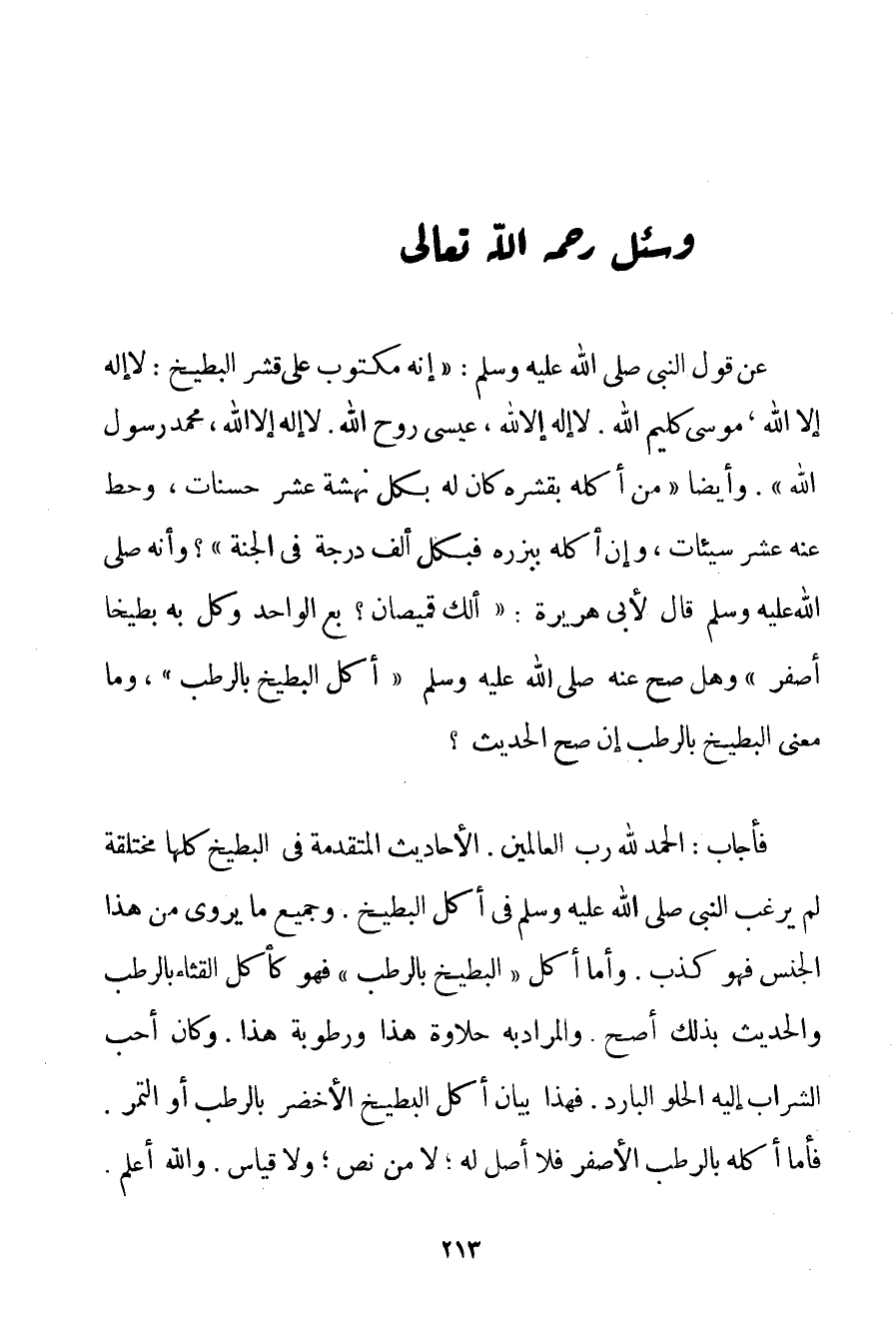 عَنْ قَوْلِ النَّبِيِّ صَلَّى اللَّهُ عَلَيْهِ وَسَلَّمَ {إنَّهُ مَكْتُوبٌ عَلَى قِشْرِ الْبِطِّيخِ: لَا إلَهَ إلَّا اللَّهُ مُوسَى كَلِيمُ اللَّهِ. لَا إلَهَ إلَّا اللَّهُ عِيسَى رُوحُ اللَّهِ. لَا إلَهَ إلَّا اللَّهُ مُحَمَّدٌ رَسُولُ اللَّهِ} . وَأَيْضًا " مَنْ أَكَلَهُ بِقِشْرِهِ كَانَ لَهُ بِكُلِّ نَهْشَةٍ عَشْرُ حَسَنَاتٍ وَحُطَّ عَنْهُ عَشْرُ سَيِّئَاتٍ وَإِنْ أَكَلَهُ بِبِزْرِهِ فَبِكُلِّ أَلْفٍ دَرَجَةٌ فِي الْجَنَّةِ "؟ وَأَنَّهُ صَلَّى اللَّهُ عَلَيْهِ وَسَلَّمَ قَالَ لِأَبِي هُرَيْرَةَ: " أَلَك قَمِيصَانِ؟ بِعْ الْوَاحِدَ وَكُلْ بِهِ بِطِّيخًا أَصْفَرَ " وَهَلْ صَحَّ عَنْهُ صَلَّى اللَّهُ عَلَيْهِ وَسَلَّمَ " أَكْلُ الْبِطِّيخِ بِالرُّطَبِ " وَمَا مَعْنَى الْبِطِّيخِ بِالرُّطَبِ إنْ صَحَّ الْحَدِيثُ؟