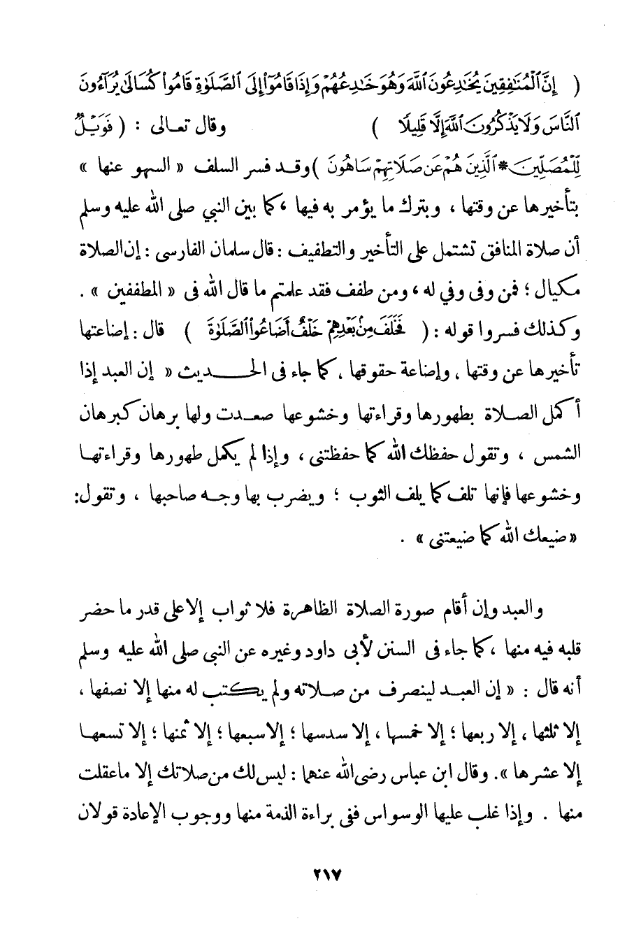 {إنَّ الْمُنَافِقِينَ يُخَادِعُونَ اللَّهَ وَهُوَ خَادِعُهُمْ وَإِذَا قَامُوا إلَى الصَّلَاةِ قَامُوا كُسَالَى يُرَاءُونَ النَّاسَ وَلَا يَذْكُرُونَ اللَّهَ إلَّا قَلِيلًا} وَقَالَ تَعَالَى: {فَوَيْلٌ لِلْمُصَلِّينَ} {الَّذِينَ هُمْ عَنْ صَلَاتِهِمْ سَاهُونَ} وَقَدْ فَسَّرَ السَّلَفُ " السَّهْوَ عَنْهَا " بِتَأْخِيرِهَا عَنْ وَقْتِهَا وَبِتَرْكِ مَا يُؤْمَرُ بِهِ فِيهَا كَمَا بَيَّنَ النَّبِيُّ صَلَّى اللَّهُ عَلَيْهِ وَسَلَّمَ أَنَّ صَلَاةَ الْمُنَافِقِ تَشْتَمِلُ عَلَى التَّأْخِيرِ وَالتَّطْفِيفِ: قَالَ سَلْمَانُ الْفَارِسِيُّ: إنَّ الصَّلَاةَ مِكْيَالٌ؛ فَمَنْ وَفَّى وُفِّيَ لَهُ وَمَنْ طَفَّفَ فَقَدْ عَلِمْتُمْ مَا قَالَ اللَّهُ فِي " الْمُطَفِّفِينَ ". وَكَذَلِكَ فَسَّرُوا قَوْلَهُ: {فَخَلَفَ مِنْ بَعْدِهِمْ خَلْفٌ أَضَاعُوا الصَّلَاةَ} قَالَ: إضَاعَتُهَا تَأْخِيرُهَا عَنْ وَقْتِهَا وَإِضَاعَتُهَا حُقُوقَهَا كَمَا جَاءَ فِي الْحَدِيثِ {إنَّ الْعَبْدَ إذَا أَكْمَلَ الصَّلَاةَ بِطَهُورِهَا وَقِرَاءَتِهَا وَخُشُوعِهَا صَعِدَتْ وَلَهَا بُرْهَانٌ كَبُرْهَانِ الشَّمْسِ وَتَقُولُ حَفِظَك اللَّهُ كَمَا حَفِظْتنِي وَإِذَا لَمْ يُكْمِلْ طَهُورَهَا وَقِرَاءَتَهَا وَخُشُوعَهَا فَإِنَّهَا تُلَفُّ كَمَا يُلَفُّ الثَّوْبُ؛ وَيُضْرَبُ بِهَا وَجْهُ صَاحِبِهَا وَتَقُولُ ضَيَّعَك اللَّهُ كَمَا ضَيَّعْتنِي} . وَالْعَبْدُ وَإِنْ أَقَامَ صُورَةَ الصَّلَاةِ الظَّاهِرَةَ فَلَا ثَوَابَ إلَّا عَلَى قَدْرِ مَا حَضَرَ قَلْبُهُ فِيهِ مِنْهَا كَمَا جَاءَ فِي السُّنَنِ لِأَبِي دَاوُد وَغَيْرِهِ عَنْ النَّبِيِّ صَلَّى اللَّهُ عَلَيْهِ وَسَلَّمَ أَنَّهُ قَالَ: {إنَّ الْعَبْدَ لَيَنْصَرِفُ مِنْ صَلَاتِهِ وَلَمْ يُكْتَبْ لَهُ مِنْهَا إلَّا نِصْفُهَا إلَّا ثُلُثُهَا إلَّا رُبُعُهَا؛ إلَّا خُمُسُهَا؛ إلَّا سُدُسُهَا؛ إلَّا سُبُعُهَا؛ إلَّا ثُمُنُهَا؛ إلَّا تسعها إلَّا عُشُرُهَا} . وَقَالَ ابْنُ عَبَّاسٍ رَضِيَ اللَّهُ عَنْهُمَا لَيْسَ لَك مِنْ صَلَاتِك إلَّا مَا عَقَلْت مِنْهَا. وَإِذَا غَلَبَ عَلَيْهَا الْوَسْوَاسُ فَفِي بَرَاءَةِ الذِّمَّةِ مِنْهَا وَوُجُوبِ الْإِعَادَةِ قَوْلَانِ