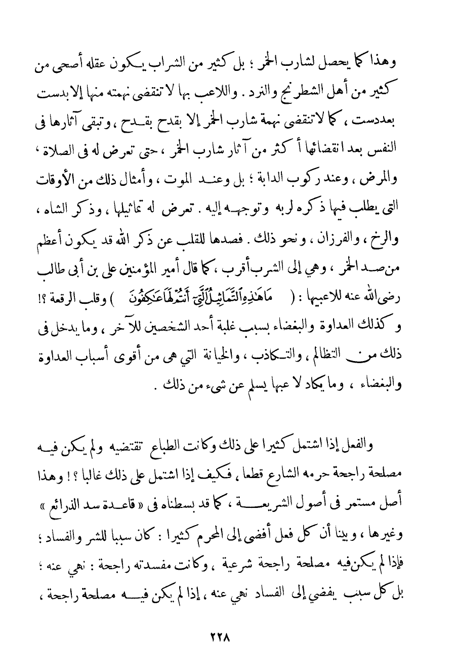 وَهَذَا كَمَا يَحْصُلُ لِشَارِبِ الْخَمْرِ؛ بَلْ كَثِيرٌ مِنْ الشُّرَّابِ يَكُونُ عَقْلُهُ أصحى مِنْ كَثِيرٍ مِنْ أَهْلِ الشِّطْرَنْجِ وَالنَّرْدِ. وَاللَّاعِبُ بِهَا لَا تَنْقَضِي نَهْمَتُهُ مِنْهَا إلَّا بدست بَعْدَ دست؛ كَمَا لَا تَنْقَضِي نَهْمَةُ شَارِبِ الْخَمْرِ إلَّا بِقَدَحِ بِقَدَحِ وَتَبْقَى آثَارُهَا فِي النَّفْسِ بَعْدَ انْقِضَائِهَا أَكْثَرَ مِنْ آثَارِ شَارِبِ الْخَمْرِ حَتَّى تَعْرِضَ لَهُ فِي الصَّلَاةِ وَالْمَرَضِ وَعِنْدَ رُكُوبِ الدَّابَّةِ؛ بَلْ وَعِنْدَ الْمَوْتِ؛ وَأَمْثَالِ ذَلِكَ مِنْ الْأَوْقَاتِ الَّتِي يُطْلَبُ فِيهَا ذِكْرُهُ لِرَبِّهِ وَتَوَجُّهُهُ إلَيْهِ. تَعْرِضُ لَهُ تَمَاثِيلُهَا وَذِكْرُ الشَّاهِ وَالرُّخِّ وَالْفِرْزَانِ وَنَحْوِ ذَلِكَ. فَصَدُّهَا لِلْقَلْبِ عَنْ ذِكْرِ اللَّهِ قَدْ يَكُونُ أَعْظَمَ مِنْ صَدِّ الْخَمْرِ وَهِيَ إلَى الشُّرْبِ أَقْرَبُ كَمَا قَالَ أَمِيرُ الْمُؤْمِنِينَ عَلِيُّ بْنُ أَبِي طَالِبٍ رَضِيَ اللَّهُ عَنْهُ لِلَاعِبِيهَا: مَا هَذِهِ التَّمَاثِيلُ الَّتِي أَنْتُمْ لَهَا عَاكِفُونَ وَقَلَبَ الرُّقْعَةِ وَكَذَلِكَ الْعَدَاوَةُ وَالْبَغْضَاءُ بِسَبَبِ غَلَبَةِ أَحَدِ الشَّخْصَيْنِ لِلْآخَرِ وَمَا يَدْخُلُ فِي ذَلِكَ مِنْ التَّظَالُمِ وَالتَّكَاذُبِ وَالْخِيَانَةِ الَّتِي هِيَ مِنْ أَقْوَى أَسْبَابِ الْعَدَاوَةِ وَالْبَغْضَاءِ وَمَا يَكَادُ لَاعِبُهَا يَسْلَمُ عَنْ شَيْءٍ مِنْ ذَلِكَ. وَالْفِعْلُ إذَا اشْتَمَلَ كَثِيرًا عَلَى ذَلِكَ وَكَانَتْ الطِّبَاعُ تَقْتَضِيهِ وَلَمْ يَكُنْ فِيهِ مَصْلَحَةٌ رَاجِحَةٌ حَرَّمَهُ الشَّارِعُ قَطْعًا فَكَيْفَ إذَا اشْتَمَلَ عَلَى ذَلِكَ غَالِبًا وَهَذَا أَصْلٌ مُسْتَمِرٌّ فِي أُصُولِ الشَّرِيعَةِ كَمَا قَدْ بَسَطْنَاهُ فِي " قَاعِدَةِ سَدِّ الذَّرَائِعِ " وَغَيْرِهَا وَبَيَّنَّا أَنَّ كُلَّ فِعْلٍ أَفْضَى إلَى الْمُحَرَّمِ كَثِيرًا: كَانَ سَبَبًا لِلشَّرِّ وَالْفَسَادِ؛ فَإِذَا لَمْ يَكُنْ فِيهِ مَصْلَحَةٌ رَاجِحَةٌ شَرْعِيَّةٌ وَكَانَتْ مَفْسَدَتُهُ رَاجِحَةً: نُهِيَ عَنْهُ؛ بَلْ كُلُّ سَبَبٍ يُفْضِي إلَى الْفَسَادِ نُهِيَ عَنْهُ إذَا لَمْ يَكُنْ فِيهِ مَصْلَحَةٌ رَاجِحَةٌ