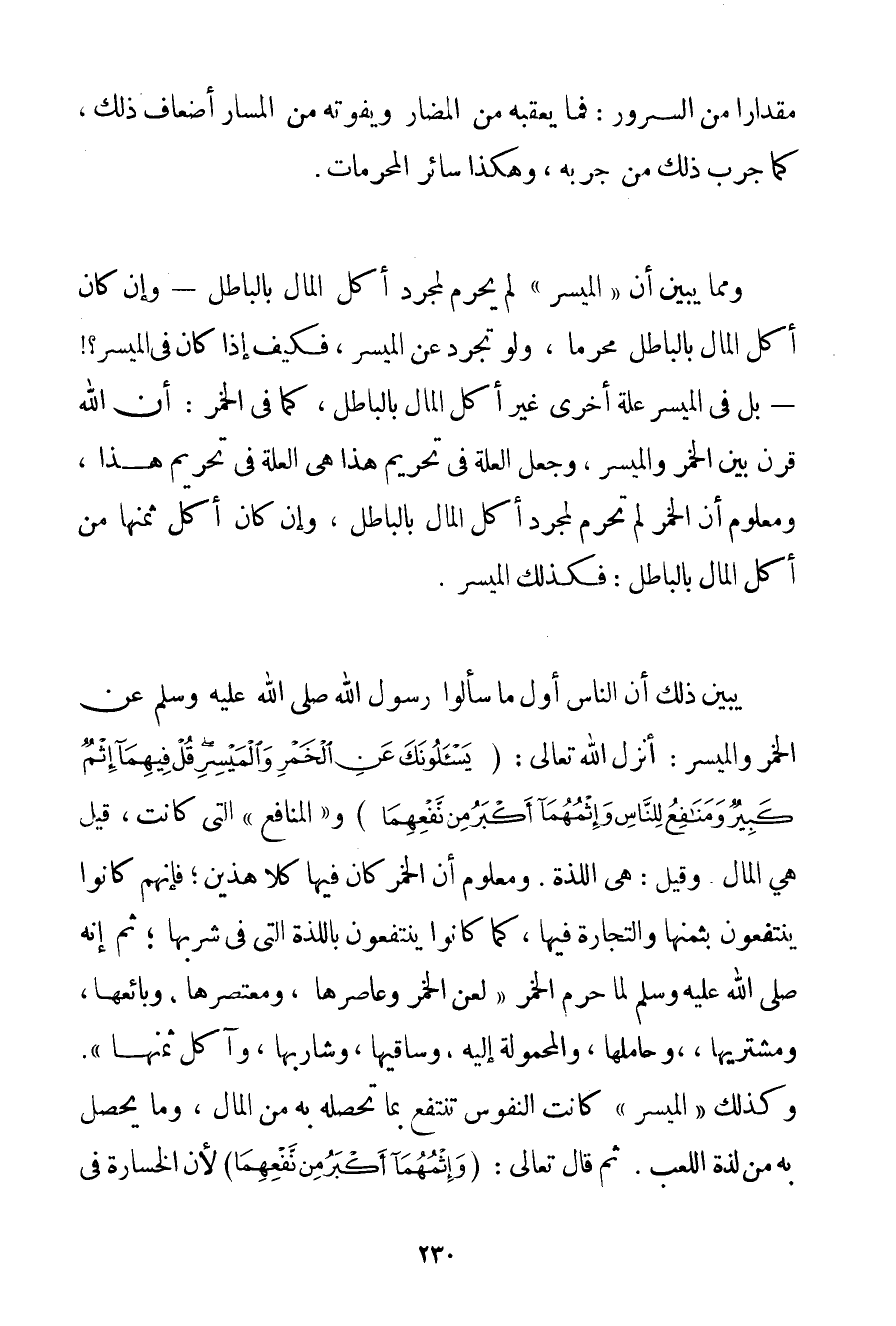 مِقْدَارًا مِنْ السُّرُورِ: فَمَا يَعْقُبُهُ مِنْ الْمَضَارِّ وَيَفُوتُهُ مِنْ المسار أَضْعَافُ ذَلِكَ كَمَا جَرَّبَ ذَلِكَ مَنْ جَرَّبَهُ وَهَكَذَا سَائِرُ الْمُحَرَّمَاتِ. وَمِمَّا يُبَيِّنُ أَنَّ " الْمَيْسِرَ " لَمْ يُحَرَّمْ لِمُجَرَّدِ أَكْلِ الْمَالِ بِالْبَاطِلِ - وَإِنْ كَانَ أَكْلُ الْمَالِ بِالْبَاطِلِ مُحَرَّمًا وَلَوْ تَجَرَّدَ عَنْ الْمَيْسِرِ فَكَيْفَ إذَا كَانَ فِي الْمَيْسِرِ - بَلْ فِي الْمَيْسِرِ عِلَّةٌ أُخْرَى غَيْرُ أَكْلِ الْمَالِ بِالْبَاطِلِ كَمَا فِي الْخَمْرِ: أَنَّ اللَّهَ قَرَنَ بَيْنَ الْخَمْرِ وَالْمَيْسِرِ وَجَعَلَ الْعِلَّةَ فِي تَحْرِيمِ هَذَا هِيَ الْعِلَّةَ فِي تَحْرِيمِ هَذَا وَمَعْلُومٌ أَنَّ الْخَمْرَ لَمْ تُحَرَّمْ لِمُجَرَّدِ أَكْلِ الْمَالِ بِالْبَاطِلِ وَإِنْ كَانَ أَكْلُ ثَمَنِهَا مِنْ أَكْلِ الْمَالِ بِالْبَاطِلِ: فَكَذَلِكَ الْمَيْسِرُ يُبَيِّنُ ذَلِكَ أَنَّ النَّاسَ أَوَّلَ مَا سَأَلُوا رَسُولَ اللَّهِ صَلَّى اللَّهُ عَلَيْهِ وَسَلَّمَ عَنْ الْخَمْرِ وَالْمَيْسِرِ: أَنْزَلَ اللَّهُ تَعَالَى: {يَسْأَلُونَكَ عَنِ الْخَمْرِ وَالْمَيْسِرِ قُلْ فِيهِمَا إثْمٌ كَبِيرٌ وَمَنَافِعُ لِلنَّاسِ وَإِثْمُهُمَا أَكْبَرُ مِنْ نَفْعِهِمَا} و " الْمَنَافِعُ " الَّتِي كَانَتْ قِيلَ هِيَ الْمَالُ. وَقِيلَ: هِيَ اللَّذَّةُ. وَمَعْلُومٌ أَنَّ الْخَمْرَ كَانَ فِيهَا كِلَا هَذَيْنِ؛ فَإِنَّهُمْ كَانُوا يَنْتَفِعُونَ بِثَمَنِهَا وَالتِّجَارَةِ فِيهَا كَمَا كَانُوا يَنْتَفِعُونَ بِاللَّذَّةِ الَّتِي فِي شُرْبِهَا؛ ثُمَّ إنَّهُ صَلَّى اللَّهُ عَلَيْهِ وَسَلَّمَ لَمَّا حَرَّمَ الْخَمْرَ {لَعَنَ الْخَمْرَ وَعَاصِرَهَا وَمُعْتَصِرَهَا وَبَائِعَهَا وَمُشْتَرِيَهَا وَحَامِلَهَا وَالْمَحْمُولَةَ إلَيْهِ وَسَاقِيَهَا وَشَارِبَهَا وَآكِلَ ثَمَنِهَا} . وَكَذَلِكَ " الْمَيْسِرُ " كَانَتْ النُّفُوسُ تَنْتَفِعُ بِمَا تُحَصِّلُهُ بِهِ مِنْ الْمَالِ وَمَا يَحْصُلُ بِهِ مِنْ لَذَّةِ اللَّعِبِ. ثُمَّ قَالَ تَعَالَى: {وَإِثْمُهُمَا أَكْبَرُ مِنْ نَفْعِهِمَا} لِأَنَّ الْخَسَارَةَ فِي