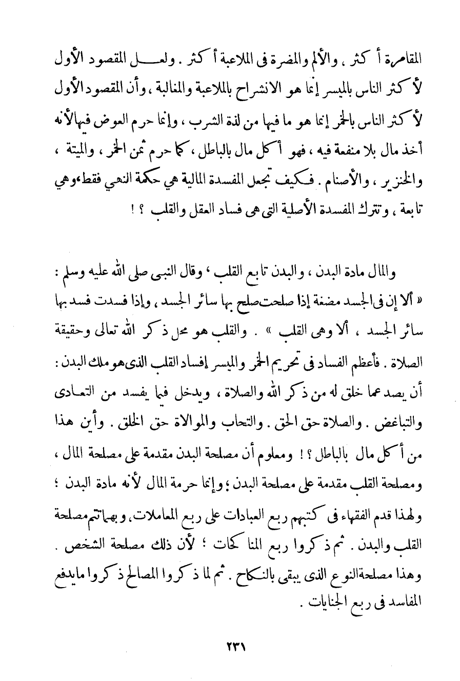 الْمُقَامَرَةِ أَكْثَرُ وَالْأَلَمَ وَالْمَضَرَّةَ فِي الْمُلَاعَبَةِ أَكْثَرُ. وَلَعَلَّ الْمَقْصُودَ الْأَوَّلَ لِأَكْثَرِ النَّاسِ بِالْمَيْسِرِ إنَّمَا هُوَ الِانْشِرَاحُ بِالْمُلَاعَبَةِ وَالْمُغَالَبَةِ وَأَنَّ الْمَقْصُودَ الْأَوَّلَ لِأَكْثَرِ النَّاسِ بِالْخَمْرِ إنَّمَا هُوَ مَا فِيهَا مِنْ لَذَّةِ الشُّرْبِ وَإِنَّمَا حَرَّمَ الْعِوَضَ فِيهَا لِأَنَّهُ أَخْذُ مَالٍ بِلَا مَنْفَعَةٍ فِيهِ فَهُوَ أَكْلُ مَالٍ بِالْبَاطِلِ كَمَا حَرَّمَ ثَمَنَ الْخَمْرِ وَالْمَيْتَةِ وَالْخِنْزِيرِ وَالْأَصْنَامِ. فَكَيْفَ تُجْعَلُ الْمَفْسَدَةُ الْمَالِيَّةُ هِيَ حِكْمَةَ النَّهْيِ فَقَطْ وَهِيَ تَابِعَةٌ وَتُتْرَكُ الْمَفْسَدَةُ الْأَصْلِيَّةُ الَّتِي هِيَ فَسَادُ الْعَقْلِ وَالْقَلْبِ وَالْمَالُ مَادَّةُ الْبَدَنِ وَالْبَدَنُ تَابِعُ الْقَلْبِ وَقَالَ النَّبِيُّ صَلَّى اللَّهُ عَلَيْهِ وَسَلَّمَ {أَلَا إنَّ فِي الْجَسَدِ مُضْغَةً إذَا صَلَحَتْ صَلَحَ بِهَا سَائِرُ الْجَسَدِ وَإِذَا فَسَدَتْ فَسَدَ بِهَا سَائِرُ الْجَسَدِ أَلَا وَهِيَ الْقَلْبُ} . وَالْقَلْبُ هُوَ مَحَلُّ ذِكْرِ اللَّهِ تَعَالَى وَحَقِيقَةُ الصَّلَاةِ. فَأَعْظَمُ الْفَسَادِ فِي تَحْرِيمِ الْخَمْرِ وَالْمَيْسِرِ إفْسَادُ الْقَلْبِ الَّذِي هُوَ مِلْكُ الْبَدَنِ: أَنْ يُصَدَّ عَمَّا خُلِقَ لَهُ مِنْ ذِكْرِ اللَّهِ وَالصَّلَاةِ وَيَدْخُلَ فِيمَا يُفْسِدُ مِنْ التَّعَادِي وَالتَّبَاغُضِ. وَالصَّلَاةُ حَقُّ الْحَقِّ. وَالتَّحَابُّ وَالْمُوَالَاةُ حَقُّ الْخَلْقِ. وَأَيْنَ هَذَا مِنْ أَكْلِ مَالٍ بِالْبَاطِلِ وَمَعْلُومٌ أَنَّ مَصْلَحَةَ الْبَدَنِ مُقَدَّمَةٌ عَلَى مَصْلَحَةِ الْمَالِ وَمَصْلَحَةَ الْقَلْبِ مُقَدَّمَةٌ عَلَى مَصْلَحَةِ الْبَدَنِ؛ وَإِنَّمَا حُرْمَةُ الْمَالِ لِأَنَّهُ مَادَّةُ الْبَدَنِ؛ وَلِهَذَا قَدَّمَ الْفُقَهَاءُ فِي كُتُبِهِمْ رُبْعَ الْعِبَادَاتِ عَلَى رُبْعِ الْمُعَامَلَاتِ وَبِهِمَا تَتِمُّ مَصْلَحَةُ الْقَلْبِ وَالْبَدَنِ. ثُمَّ ذَكَرُوا رُبْعَ الْمُنَاكَحَاتِ؛ لِأَنَّ ذَلِكَ مَصْلَحَةُ الشَّخْصِ. وَهَذَا مَصْلَحَةُ النَّوْعِ الَّذِي يَبْقَى بِالنِّكَاحِ. ثُمَّ لَمَّا ذَكَرُوا الْمَصَالِحَ ذَكَرُوا مَا يَدْفَعُ الْمَفَاسِدَ فِي رُبْعِ الْجِنَايَاتِ.