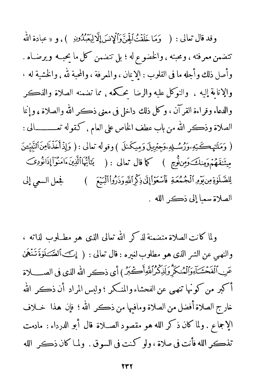 وَقَدْ قَالَ تَعَالَى: {وَمَا خَلَقْتُ الْجِنَّ وَالْإِنْسَ إلَّا لِيَعْبُدُونِ} و " عِبَادَةُ اللَّهِ تَتَضَمَّنُ مَعْرِفَتَهُ وَمَحَبَّتَهُ وَالْخُضُوعَ لَهُ؛ بَلْ تَتَضَمَّنُ كُلَّ مَا يُحِبُّهُ وَيَرْضَاهُ. وَأَصْلُ ذَلِكَ وَأَجَلُّهُ مَا فِي الْقُلُوبِ: الْإِيمَانُ وَالْمَعْرِفَةُ وَالْمَحَبَّةُ لِلَّهِ وَالْخَشْيَةُ لَهُ وَالْإِنَابَةُ إلَيْهِ وَالتَّوَكُّلُ عَلَيْهِ وَالرِّضَى بِحُكْمِهِ مِمَّا تَضْمَنُهُ الصَّلَاةُ وَالذِّكْرُ وَالدُّعَاءُ وَقِرَاءَةُ الْقُرْآنِ وَكُلُّ ذَلِكَ دَاخِلٌ فِي مَعْنَى ذِكْرِ اللَّهِ وَالصَّلَاةِ وَإِنَّمَا الصَّلَاةُ وَذِكْرُ اللَّهِ مِنْ بَابِ عَطْفِ الْخَاصِّ عَلَى الْعَامِّ كَقَوْلِهِ تَعَالَى: {وَمَلَائِكَتِهِ وَرُسُلِهِ وَجِبْرِيلَ وَمِيكَالَ} وقَوْله تَعَالَى {وَإِذْ أَخَذْنَا مِنَ النَّبِيِّينَ مِيثَاقَهُمْ وَمِنْكَ وَمِنْ نُوحٍ} كَمَا قَالَ تَعَالَى: {يَا أَيُّهَا الَّذِينَ آمَنُوا إذَا نُودِيَ لِلصَّلَاةِ مِنْ يَوْمِ الْجُمُعَةِ فَاسْعَوْا إلَى ذِكْرِ اللَّهِ وَذَرُوا الْبَيْعَ} فَجَعَلَ السَّعْيَ إلَى الصَّلَاةِ سَعْيًا إلَى ذِكْرِ اللَّهِ. وَلَمَّا كَانَتْ الصَّلَاةُ مُتَضَمِّنَةً لِذِكْرِ اللَّهِ تَعَالَى الَّذِي هُوَ مَطْلُوبٌ لِذَاتِهِ وَالنَّهْيِ عَنْ الشَّرِّ الَّذِي هُوَ مَطْلُوبٌ لِغَيْرِهِ: قَالَ تَعَالَى: {إنَّ الصَّلَاةَ تَنْهَى عَنِ الْفَحْشَاءِ وَالْمُنْكَرِ وَلَذِكْرُ اللَّهِ أَكْبَرُ} أَيْ ذِكْرُ اللَّهِ الَّذِي فِي الصَّلَاةِ أَكْبَرُ مِنْ كَوْنِهَا تَنْهَى عَنْ الْفَحْشَاءِ وَالْمُنْكَرِ؛ وَلَيْسَ الْمُرَادُ أَنَّ ذِكْرَ اللَّهِ خَارِجَ الصَّلَاةِ أَفْضَلُ مِنْ الصَّلَاةِ وَمَا فِيهَا مِنْ ذِكْرِ اللَّهِ؛ فَإِنَّ هَذَا خِلَافُ الْإِجْمَاعِ. وَلَمَّا كَانَ ذِكْرُ اللَّهِ هُوَ مَقْصُودَ الصَّلَاةِ قَالَ أَبُو الدَّرْدَاءِ: مَا دُمْت تَذْكُرُ اللَّهَ فَأَنْتَ فِي صَلَاةٍ وَلَوْ كُنْت فِي السُّوقِ. وَلَمَّا كَانَ ذِكْرُ اللَّهِ