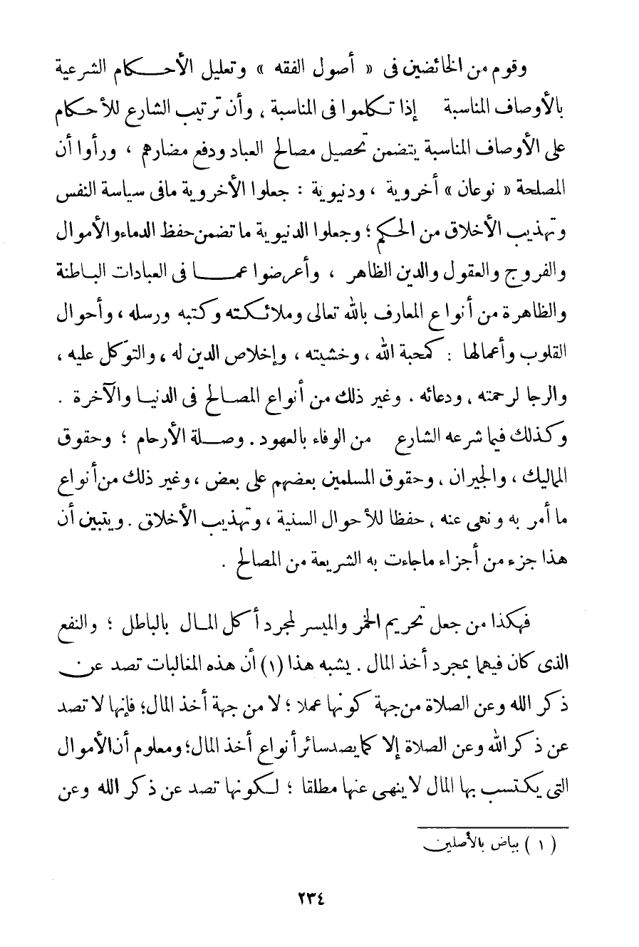 وَقَوْمٌ مِنْ الْخَائِضِينَ فِي " أُصُولِ الْفِقْهِ " وَتَعْلِيلُ الْأَحْكَامِ الشَّرْعِيَّةِ بِالْأَوْصَافِ الْمُنَاسِبَةِ إذَا تَكَلَّمُوا فِي الْمُنَاسَبَةِ وَأَنَّ تَرْتِيبَ الشَّارِعِ لِلْأَحْكَامِ عَلَى الْأَوْصَافِ الْمُنَاسِبَةِ يَتَضَمَّنُ تَحْصِيلَ مَصَالِحِ الْعِبَادِ وَدَفْعَ مَضَارِّهِمْ وَرَأَوْا أَنَّ الْمَصْلَحَةَ " نَوْعَانِ " أُخْرَوِيَّةٌ وَدُنْيَوِيَّةٌ: جَعَلُوا الْأُخْرَوِيَّةَ مَا فِي سِيَاسَةِ النَّفْسِ وَتَهْذِيبِ الْأَخْلَاقِ مِنْ الْحِكَمِ؛ وَجَعَلُوا الدُّنْيَوِيَّةَ مَا تَضْمَنُ حِفْظَ الدِّمَاءِ وَالْأَمْوَالِ وَالْفُرُوجِ وَالْعُقُولِ وَالدِّينِ الظَّاهِرِ وَأَعْرَضُوا عَمَّا فِي الْعِبَادَاتِ الْبَاطِنَةِ وَالظَّاهِرَةِ مِنْ أَنْوَاعِ الْمَعَارِفِ بِاَللَّهِ تَعَالَى وَمَلَائِكَتِهِ وَكُتُبِهِ وَرُسُلِهِ وَأَحْوَالِ الْقُلُوبِ وَأَعْمَالِهَا: كَمَحَبَّةِ اللَّهِ وَخَشْيَتِهِ وَإِخْلَاصِ الدِّينِ لَهُ وَالتَّوَكُّلِ عَلَيْهِ وَالرَّجَا لِرَحْمَتِهِ وَدُعَائِهِ وَغَيْرِ ذَلِكَ مِنْ أَنْوَاعِ الْمَصَالِحِ فِي الدُّنْيَا وَالْآخِرَةِ. وَكَذَلِكَ فِيمَا شَرَعَهُ الشَّارِعُ مِنْ الْوَفَاءِ بِالْعُهُودِ. وَصِلَةِ الْأَرْحَامِ؛ وَحُقُوقِ الْمَمَالِيكِ وَالْجِيرَانِ وَحُقُوقِ الْمُسْلِمِينَ بَعْضِهِمْ عَلَى بَعْضٍ وَغَيْرِ ذَلِكَ مِنْ أَنْوَاعِ مَا أَمَرَ بِهِ وَنَهَى عَنْهُ حِفْظًا لِلْأَحْوَالِ السُّنِّيَّةِ وَتَهْذِيبِ الْأَخْلَاقِ. وَيَتَبَيَّنُ أَنَّ هَذَا جُزْءٌ مِنْ أَجْزَاءِ مَا جَاءَتْ بِهِ الشَّرِيعَةُ مِنْ الْمَصَالِحِ. فَهَكَذَا مَنْ جَعَلَ تَحْرِيمَ الْخَمْرِ وَالْمَيْسِرِ لِمُجَرَّدِ أَكْلِ الْمَالِ بِالْبَاطِلِ؛ وَالنَّفْعَ الَّذِي كَانَ فِيهِمَا بِمُجَرَّدِ أَخْذِ الْمَالِ. يُشْبِهُ هَذَا. . . (1) أَنَّ هَذِهِ الْمُغَالِبَاتِ تَصُدُّ عَنْ ذِكْرِ اللَّهِ وَعَنْ الصَّلَاةِ مِنْ جِهَةِ كَوْنِهَا عَمَلًا؛ لَا مِنْ جِهَةِ أَخْذِ الْمَالِ؛ فَإِنَّهَا لَا تَصُدُّ عَنْ ذِكْرِ اللَّهِ وَعَنْ الصَّلَاةِ إلَّا كَمَا يَصُدُّ سَائِرُ أَنْوَاعِ أَخْذِ الْمَالِ؛ وَمَعْلُومٌ أَنَّ الْأَمْوَالَ الَّتِي يُكْتَسَبُ بِهَا الْمَالُ لَا يُنْهَى عَنْهَا مُطْلَقًا؛ لِكَوْنِهَا تَصُدُّ عَنْ ذِكْرِ اللَّهِ وَعَنْ