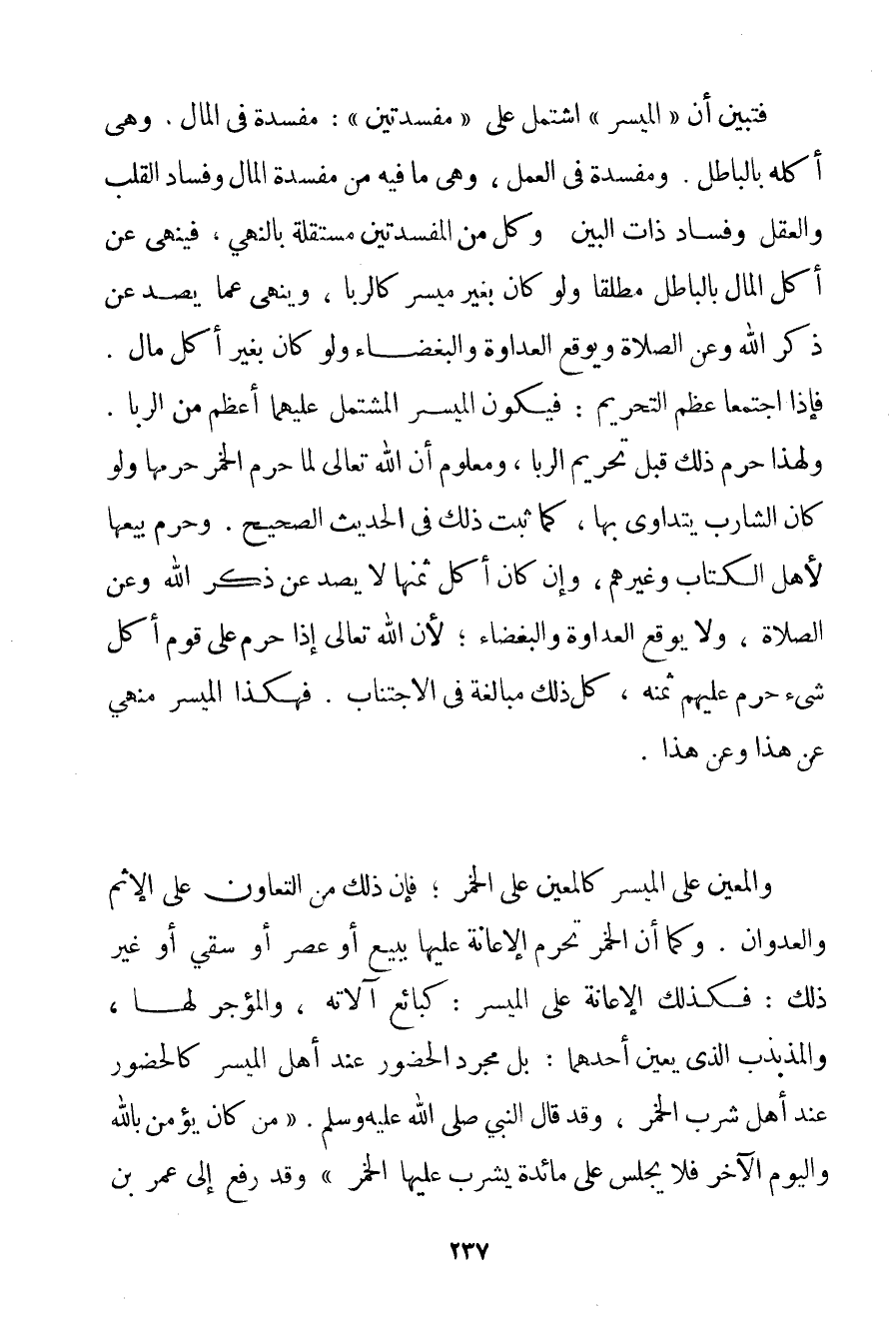 فَتَبَيَّنَ أَنَّ " الْمَيْسِرَ " اشْتَمَلَ عَلَى " مَفْسَدَتَيْنِ ": مَفْسَدَةٌ فِي الْمَالِ. وَهِيَ أَكْلُهُ بِالْبَاطِلِ. وَمَفْسَدَةٌ فِي الْعَمَلِ وَهِيَ مَا فِيهِ مِنْ مَفْسَدَةِ الْمَالِ وَفَسَادِ الْقَلْبِ وَالْعَقْلِ وَفَسَادِ ذَاتِ الْبَيْنِ. وَكُلٌّ مِنْ الْمَفْسَدَتَيْنِ مُسْتَقِلَّةٌ بِالنَّهْيِ فَيَنْهَى عَنْ أَكْلِ الْمَالِ بِالْبَاطِلِ مُطْلَقًا وَلَوْ كَانَ بِغَيْرِ مَيْسِرٍ كَالرِّبَا وَيَنْهَى عَمَّا يَصُدُّ عَنْ ذِكْرِ اللَّهِ وَعَنْ الصَّلَاةِ وَيُوقِعُ الْعَدَاوَةَ وَالْبَغْضَاءَ وَلَوْ كَانَ بِغَيْرِ أَكْلِ مَالٍ. فَإِذَا اجْتَمَعَا عَظُمَ التَّحْرِيمُ: فَيَكُونُ الْمَيْسِرُ الْمُشْتَمِلُ عَلَيْهِمَا أَعْظَمَ مِنْ الرِّبَا. وَلِهَذَا حُرِّمَ ذَلِكَ قَبْلَ تَحْرِيمِ الرِّبَا وَمَعْلُومٌ أَنَّ اللَّهَ تَعَالَى لَمَّا حَرَّمَ الْخَمْرَ حَرَّمَهَا وَلَوْ كَانَ الشَّارِبُ يَتَدَاوَى بِهَا كَمَا ثَبَتَ ذَلِكَ فِي الْحَدِيثِ الصَّحِيحِ. وَحَرَّمَ بَيْعَهَا لِأَهْلِ الْكِتَابِ وَغَيْرِهِمْ وَإِنْ كَانَ أَكْلُ ثَمَنِهَا لَا يَصُدُّ عَنْ ذِكْرِ اللَّهِ وَعَنْ الصَّلَاةِ وَلَا يُوقِعُ الْعَدَاوَةَ وَالْبَغْضَاءَ؛ لِأَنَّ اللَّهَ تَعَالَى إذَا حَرَّمَ عَلَى قَوْمٍ أَكْلَ شَيْءٍ حَرَّمَ عَلَيْهِمْ ثَمَنَهُ كُلُّ ذَلِكَ مُبَالَغَةً فِي الِاجْتِنَابِ. فَهَكَذَا الْمَيْسِرُ مَنْهِيٌّ عَنْ هَذَا وَعَنْ هَذَا. وَالْمُعِينُ عَلَى الْمَيْسِرِ كَالْمُعِينِ عَلَى الْخَمْرِ؛ فَإِنَّ ذَلِكَ مِنْ التَّعَاوُنِ عَلَى الْإِثْمِ وَالْعُدْوَانِ. وَكَمَا أَنَّ الْخَمْرَ تَحْرُمُ الْإِعَانَةُ عَلَيْهَا بِبَيْعِ أَوْ عَصْرٍ أَوْ سَقْيٍ أَوْ غَيْرِ ذَلِكَ: فَكَذَلِكَ الْإِعَانَةُ عَلَى الْمَيْسِرِ: كَبَائِعِ آلَاتِهِ وَالْمُؤَجِّرِ لَهَا وَالْمُذَبْذَبِ الَّذِي يُعِينُ أَحَدَهُمَا: بَلْ مُجَرَّدُ الْحُضُورِ عِنْدَ أَهْلِ الْمَيْسِرِ كَالْحُضُورِ عِنْدَ أَهْلِ شُرْبِ الْخَمْرِ. وَقَدْ قَالَ النَّبِيُّ صَلَّى اللَّهُ عَلَيْهِ وَسَلَّمَ. {مَنْ كَانَ يُؤْمِنُ بِاَللَّهِ وَالْيَوْمِ الْآخِرِ فَلَا يَجْلِسُ عَلَى مَائِدَةٍ يُشْرَبُ عَلَيْهَا الْخَمْرُ} وَقَدْ رُفِعَ إلَى عُمَرَ بْنِ