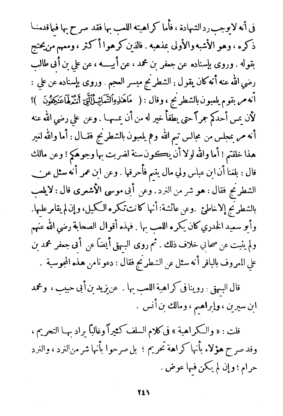فِي أَنَّهُ لَا يُوجِبُ رَدَّ الشَّهَادَةِ فَأَمَّا كَرَاهِيَتُهُ اللَّعِبَ بِهَا فَقَدْ صَرَّحَ بِهَا فِيمَا قَدَّمْنَا ذِكْرَهُ وَهُوَ الْأَشْبَهُ وَالْأَوْلَى بِمَذْهَبِهِ. فَاَلَّذِينَ كَرِهُوا أَكْثَرُ وَمَعَهُمْ مَنْ يُحْتَجُّ بِقَوْلِهِ. وَرُوِيَ بِإِسْنَادِهِ عَنْ جَعْفَرِ بْنِ مُحَمَّدٍ عَنْ أَبِيهِ عَنْ عَلِيِّ بْنِ أَبِي طَالِبٍ رَضِيَ اللَّهُ عَنْهُ أَنَّهُ كَانَ يَقُولُ: الشِّطْرَنْجُ مَيْسِرُ الْعَجَمِ. وَرُوِيَ بِإِسْنَادِهِ عَنْ عَلِيٍّ: أَنَّهُ مَرَّ بِقَوْمِ يَلْعَبُونَ بِالشِّطْرَنْجِ وَقَالَ: {مَا هَذِهِ التَّمَاثِيلُ الَّتِي أَنْتُمْ لَهَا عَاكِفُونَ} ؟ لَأَنْ يَمَسَّ أَحَدُكُمْ جَمْرًا حَتَّى يُطْفَأَ خَيْرٌ لَهُ مِنْ أَنْ يَمَسَّهَا. وَعَنْ عَلِيٍّ رَضِيَ اللَّهُ عَنْهُ أَنَّهُ مَرَّ بِمَجْلِسِ مِنْ مَجَالِسِ تَيْمِ اللَّهِ وَهُمْ يَلْعَبُونَ بِالشِّطْرَنْجِ فَقَالَ: أَمَا وَاَللَّهِ لِغَيْرِ هَذَا خُلِقْتُمْ أَمَا وَاَللَّهِ لَوْلَا أَنْ يَكُونَ سُنَّةً لَضَرَبْت بِهَا وُجُوهَكُمْ وَعَنْ مَالِكٍ قَالَ: بَلَغَنَا أَنَّ ابْنَ عَبَّاسٍ وَلِيَ مَالَ يَتِيمٍ فَأَحْرَقَهَا. وَعَنْ ابْنِ عُمَرَ أَنَّهُ سُئِلَ عَنْ الشِّطْرَنْجِ فَقَالَ: هُوَ شَرٌّ مِنْ النَّرْدِ. وَعَنْ أَبِي مُوسَى الْأَشْعَرِيِّ قَالَ: لَا يَلْعَبُ بِالشِّطْرَنْجِ إلَّا خَاطِئٌ. وَعَنْ عَائِشَةَ: أَنَّهَا كَانَتْ تَكْرَهُ الْكَيْلَ وَإِنْ لَمْ يُقَامَرْ عَلَيْهَا. وَأَبُو سَعِيدٍ الخدري كَانَ يَكْرَهُ اللَّعِبَ بِهَا. فَهَذِهِ أَقْوَالُ الصَّحَابَةِ رَضِيَ اللَّهُ عَنْهُمْ وَلَمْ يَثْبُتْ عَنْ صَحَابِيٍّ خِلَافُ ذَلِكَ. ثُمَّ رَوَى البيهقي أَيْضًا عَنْ أَبِي جَعْفَرٍ مُحَمَّدِ بْنِ عَلِيٍّ الْمَعْرُوفِ بِالْبَاقِرِ أَنَّهُ سُئِلَ عَنْ الشِّطْرَنْجِ فَقَالَ: دَعُونَا مِنْ هَذِهِ الْمَجُوسِيَّةِ. قَالَ البيهقي: رَوَيْنَا فِي كَرَاهِيَةِ اللَّعِبِ بِهَا. عَنْ يَزِيدَ بْنِ أَبِي حَبِيبٍ وَمُحَمَّدِ ابْنِ سِيرِين وَإِبْرَاهِيمَ وَمَالِكِ بْنِ أَنَسٍ. قُلْت: " وَالْكَرَاهِيَةُ " فِي كَلَامِ السَّلَفِ كَثِيرًا وَغَالِبًا يُرَادُ بِهَا التَّحْرِيمُ وَقَدْ صَرَّحَ هَؤُلَاءِ بِأَنَّهَا كَرَاهَةُ تَحْرِيمٍ؛ بَلْ صَرَّحُوا بِأَنَّهَا شَرٌّ مِنْ النَّرْدِ وَالنَّرْدُ حَرَامٌ؛ وَإِنْ لَمْ يَكُنْ فِيهَا عِوَضٌ.
