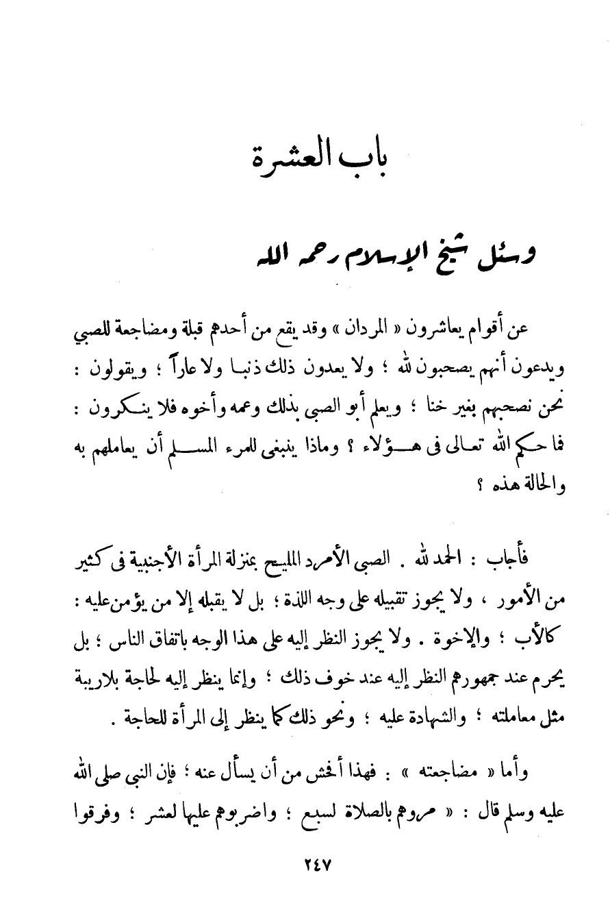 الْحَمْدُ لِلَّهِ، الصَّبِيُّ الْأَمْرَدُ الْمَلِيحُ بِمَنْزِلَةِ الْمَرْأَةِ الْأَجْنَبِيَّةِ فِي كَثِيرٍ مِنْ الْأُمُورِ وَلَا يَجُوزُ تَقْبِيلُهُ عَلَى وَجْهِ اللَّذَّةِ؛ بَلْ لَا يُقَبِّلُهُ إلَّا مَنْ يُؤْمَنُ عَلَيْهِ: كَالْأَبِ؛ وَالْإِخْوَةِ. وَلَا يَجُوزُ النَّظَرُ إلَيْهِ عَلَى هَذَا الْوَجْهِ بِاتِّفَاقِ النَّاسِ؛ بَلْ يَحْرُمُ عِنْدَ جُمْهُورِهِمْ النَّظَرُ إلَيْهِ عِنْدَ خَوْفِ ذَلِكَ؛ وَإِنَّمَا يُنْظَرُ إلَيْهِ لِحَاجَةِ بِلَا رِيبَةٍ مِثْلَ مُعَامَلَتِهِ وَالشَّهَادَةِ عَلَيْهِ؛ وَنَحْوِ ذَلِكَ كَمَا يُنْظَرُ إلَى الْمَرْأَةِ لِلْحَاجَةِ. وَأَمَّا " مُضَاجَعَتُهُ ": فَهَذَا أَفْحَشُ مِنْ أَنْ يُسْأَلَ عَنْهُ؛ فَإِنَّ النَّبِيَّ صَلَّى اللَّهُ عَلَيْهِ وَسَلَّمَ قَالَ: {مُرُوهُمْ بِالصَّلَاةِ لِسَبْعِ؛ وَاضْرِبُوهُمْ عَلَيْهَا لِعَشْرٍ؛ وَفَرِّقُوا