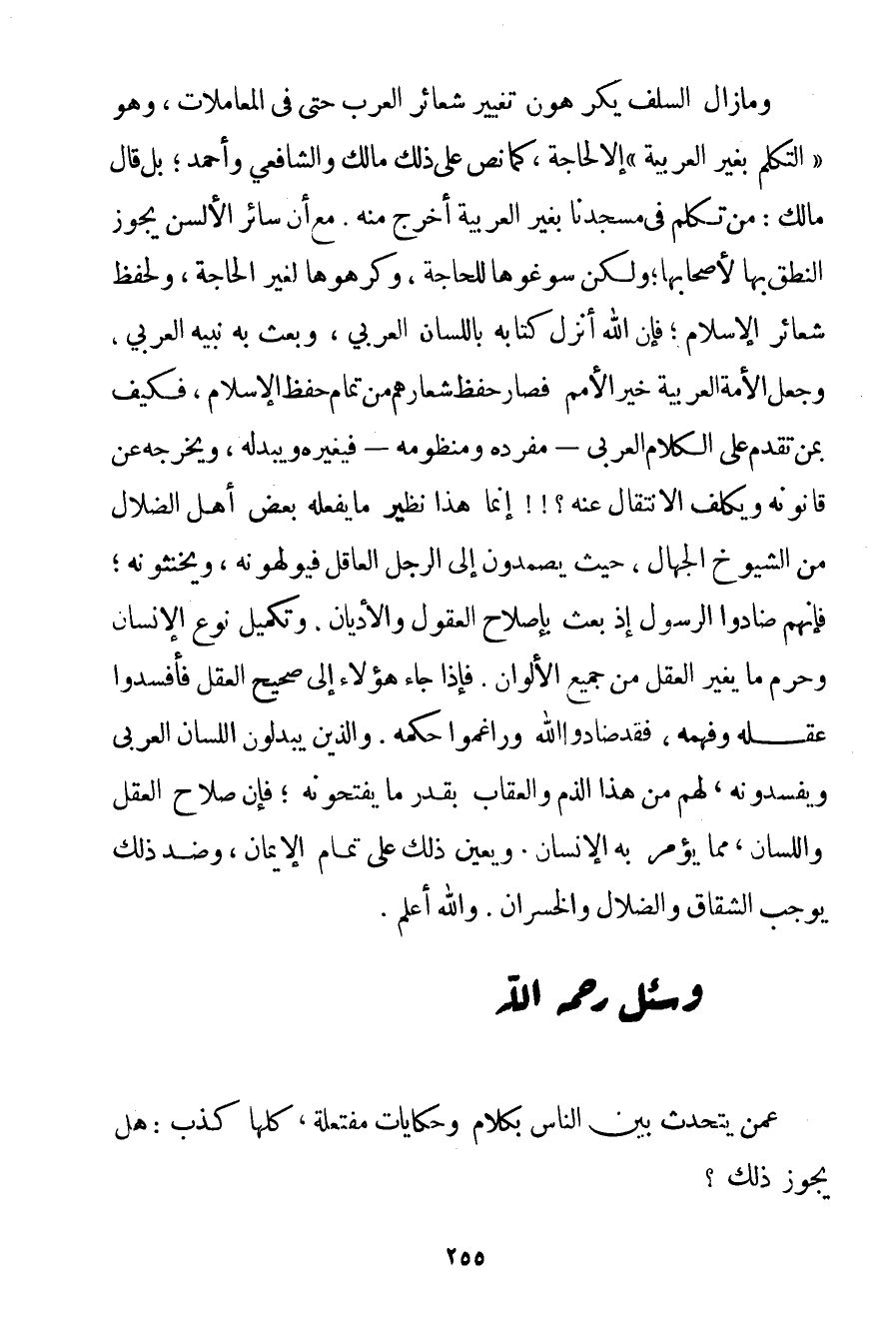 وَمَا زَالَ السَّلَفُ يَكْرَهُونَ تَغْيِيرَ شَعَائِرِ الْعَرَبِ حَتَّى فِي الْمُعَامَلَاتِ وَهُوَ " التَّكَلُّم بِغَيْرِ الْعَرَبِيَّةِ " إلَّا لِحَاجَةِ كَمَا نَصَّ عَلَى ذَلِكَ مَالِك وَالشَّافِعِيُّ وَأَحْمَد بَلْ قَالَ مَالِك: مَنْ تَكَلَّمَ فِي مَسْجِدِنَا بِغَيْرِ الْعَرَبِيَّةِ أُخْرِجَ مِنْهُ. مَعَ أَنَّ سَائِرَ الْأَلْسُنِ يَجُوزُ النُّطْقُ بِهَا لِأَصْحَابِهَا؛ وَلَكِنْ سَوَّغُوهَا لِلْحَاجَةِ وَكَرِهُوهَا لِغَيْرِ الْحَاجَةِ وَلِحِفْظِ شَعَائِرِ الْإِسْلَامِ؛ فَإِنَّ اللَّهَ أَنْزَلَ كِتَابَهُ بِاللِّسَانِ الْعَرَبِيِّ وَبَعَثَ بِهِ نَبِيَّهُ الْعَرَبِيَّ وَجَعَلَ الْأُمَّةَ الْعَرَبِيَّةَ خَيْرَ الْأُمَمِ فَصَارَ حِفْظُ شِعَارِهِمْ مِنْ تَمَامِ حِفْظِ الْإِسْلَامِ فَكَيْفَ بِمَنْ تَقَدَّمَ عَلَى الْكَلَامِ الْعَرَبِيِّ - مُفْرَدِهِ وَمَنْظُومِهِ - فَيُغَيِّرُهُ وَيُبَدِّلُهُ وَيُخْرِجُهُ عَنْ قَانُونِهِ وَيُكَلِّفُ الِانْتِقَالَ عَنْهُ إنَّمَا هَذَا نَظِيرُ مَا يَفْعَلُهُ بَعْضُ أَهْلِ الضَّلَالِ مِنْ الشُّيُوخِ الْجُهَّالِ حَيْثُ يَصْمُدُونَ إلَى الرَّجُلِ الْعَاقِلِ فَيُؤَلِّهُونَهُ ويخنثونه؛ فَإِنَّهُمْ ضَادُّوا الرَّسُولَ إذْ بُعِثَ بِإِصْلَاحِ الْعُقُولِ وَالْأَدْيَانِ وَتَكْمِيلِ نَوْعِ الْإِنْسَانِ وَحَرَّمَ مَا يُغَيِّرُ الْعَقْلَ مِنْ جَمِيعِ الْأَلْوَانِ. فَإِذَا جَاءَ هَؤُلَاءِ إلَى صَحِيحِ الْعَقْلِ فَأَفْسَدُوا عَقْلَهُ وَفَهْمَهُ وَقَدْ ضَادُّوا اللَّهَ وراغموا حُكْمَهُ. وَاَلَّذِينَ يُبَدِّلُونَ اللِّسَانَ الْعَرَبِيَّ وَيُفْسِدُونَهُ لَهُمْ مِنْ هَذَا الذَّمِّ وَالْعِقَابِ بِقَدْرِ مَا يَفْتَحُونَهُ؛ فَإِنَّ صَلَاحَ الْعَقْلِ وَاللِّسَانِ مِمَّا يُؤْمَرُ بِهِ الْإِنْسَانُ. وَيُعِينُ ذَلِكَ عَلَى تَمَامِ الْإِيمَانِ وَضِدُّ ذَلِكَ يُوجِبُ الشِّقَاقَ وَالضَّلَالَ وَالْخُسْرَانَ. وَاَللَّهُ أَعْلَمُ.
