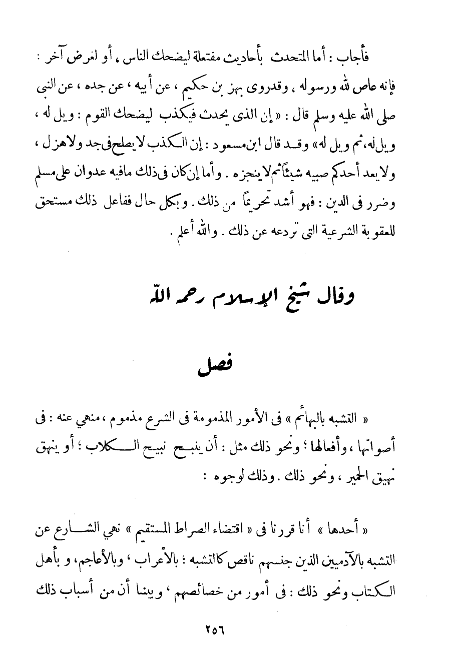 " التَّشَبُّهُ بِالْبَهَائِمِ " فِي الْأُمُورِ الْمَذْمُومَةِ فِي الشَّرْعِ مَذْمُومٌ مَنْهِيٌّ عَنْهُ: فِي أَصْوَاتِهَا وَأَفْعَالِهَا؛ وَنَحْوِ ذَلِكَ مِثْلُ: أَنْ يَنْبَحَ نَبِيحَ الْكِلَابِ؛ أَوْ يَنْهَقَ نَهِيقَ الْحَمِيرِ وَنَحْوَ ذَلِكَ. وَذَلِكَ لِوُجُوهِ: " أَحَدُهَا " أَنَّا قَرَّرْنَا فِي " اقْتِضَاءِ الصِّرَاطِ الْمُسْتَقِيمِ " نَهْيَ الشَّارِعِ عَنْ التَّشَبُّهِ بِالْآدَمِيِّينَ الَّذِينَ جِنْسُهُمْ نَاقِصٌ كَالتَّشَبُّهِ؛ بِالْأَعْرَابِ وَبِالْأَعَاجِمِ وَبِأَهْلِ الْكِتَابِ وَنَحْوِ ذَلِكَ: فِي أُمُورٍ مِنْ خَصَائِصِهِمْ وَبَيَّنَّا أَنَّ مِنْ أَسْبَابِ ذَلِكَ