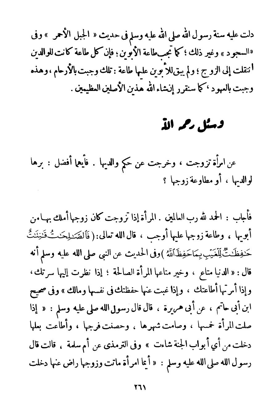الْحَمْدُ لِلَّهِ رَبِّ الْعَالَمِينَ، الْمَرْأَةُ إذَا تَزَوَّجَتْ كَانَ زَوْجُهَا أَمْلَكَ بِهَا مِنْ أَبَوَيْهَا وَطَاعَةُ زَوْجِهَا عَلَيْهَا أَوْجَبُ قَالَ اللَّهُ تَعَالَى: {فَالصَّالِحَاتُ قَانِتَاتٌ حَافِظَاتٌ لِلْغَيْبِ بِمَا حَفِظَ اللَّهُ} وَفِي الْحَدِيثِ عَنْ النَّبِيِّ صَلَّى اللَّهُ عَلَيْهِ وَسَلَّمَ أَنَّهُ قَالَ: {الدُّنْيَا مَتَاعٌ وَخَيْرُ مَتَاعِهَا الْمَرْأَةُ الصَّالِحَةُ؛ إذَا نَظَرْت إلَيْهَا سَرَّتْك وَإِذَا أَمَرْتهَا أَطَاعَتْك وَإِذَا غِبْت عَنْهَا حَفِظَتْك فِي نَفْسِهَا وَمَالِك} . وَفِي صَحِيحِ أَبِي حَاتِمٍ عَنْ أَبِي هُرَيْرَةَ قَالَ قَالَ رَسُولُ اللَّهِ صَلَّى اللَّهُ عَلَيْهِ وَسَلَّمَ {إذَا صَلَّتْ الْمَرْأَةُ خَمْسَهَا وَصَامَتْ شَهْرَهَا وَحَصَّنَتْ فَرْجَهَا وَأَطَاعَتْ بَعْلَهَا دَخَلَتْ مِنْ أَيِّ أَبْوَابِ الْجَنَّةِ شَاءَتْ} وَفِي التِّرْمِذِيِّ عَنْ أُمِّ سَلَمَةَ قَالَتْ قَالَ رَسُولُ اللَّهِ صَلَّى اللَّهُ عَلَيْهِ وَسَلَّمَ {أَيُّمَا امْرَأَةٍ مَاتَتْ وَزَوْجُهَا رَاضٍ عَنْهَا دَخَلَتْ