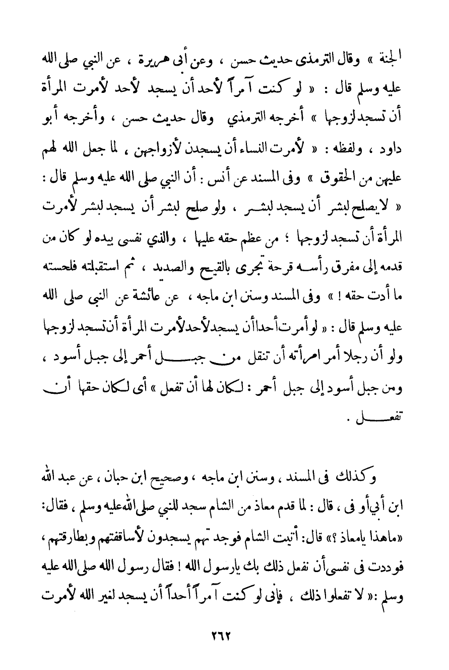 الْجَنَّةَ} وَقَالَ التِّرْمِذِيُّ حَدِيثٌ حَسَنٌ. وَعَنْ أَبِي هُرَيْرَةَ عَنْ النَّبِيِّ صَلَّى اللَّهُ عَلَيْهِ وَسَلَّمَ قَالَ: {لَوْ كُنْت آمِرًا لِأَحَدِ أَنْ يَسْجُدَ لِأَحَدِ لَأَمَرْت الْمَرْأَةَ أَنْ تَسْجُدَ لِزَوْجِهَا} أَخْرَجَهُ التِّرْمِذِيُّ وَقَالَ حَدِيثٌ حَسَنٌ وَأَخْرَجَهُ أَبُو دَاوُد وَلَفْظُهُ: {لَأَمَرْت النِّسَاءَ أَنْ يَسْجُدْنَ لِأَزْوَاجِهِنَّ لِمَا جَعَلَ اللَّهُ لَهُمْ عَلَيْهِنَّ مِنْ الْحُقُوقِ} وَفِي الْمُسْنَدِ عَنْ أَنَسٍ: أَنَّ النَّبِيَّ صَلَّى اللَّهُ عَلَيْهِ وَسَلَّمَ قَالَ: {لَا يَصْلُحُ لِبَشَرِ أَنْ يَسْجُدَ لِبَشَرِ وَلَوْ صَلَحَ لِبَشَرِ أَنْ يَسْجُدَ لِبَشَرِ لَأَمَرْت الْمَرْأَةَ أَنْ تَسْجُدَ لِزَوْجِهَا؛ مِنْ عِظَمِ حَقِّهِ عَلَيْهَا وَاَلَّذِي نَفْسِي بِيَدِهِ لَوْ كَانَ مِنْ قَدَمِهِ إلَى مَفْرِقِ رَأْسِهِ قُرْحَةٌ تَجْرِي بِالْقَيْحِ وَالصَّدِيدِ ثُمَّ اسْتَقْبَلَتْهُ فَلَحِسَتْهُ مَا أَدَّتْ حَقَّهُ} وَفِي الْمُسْنَدِ وَسُنَنِ ابْنِ مَاجَه عَنْ عَائِشَةَ عَنْ النَّبِيِّ صَلَّى اللَّهُ عَلَيْهِ وَسَلَّمَ قَالَ: {لَوْ أَمَرْت أَحَدًا أَنْ يَسْجُدَ لِأَحَدِ لَأَمَرْت الْمَرْأَةَ أَنْ تَسْجُدَ لِزَوْجِهَا وَلَوْ أَنَّ رَجُلًا أَمَرَ امْرَأَتَهُ أَنْ تَنْقُلَ مِنْ جَبَلٍ أَحْمَرَ إلَى جَبَلٍ أَسْوَدَ وَمِنْ جَبَلٍ أَسْوَدَ إلَى جَبَلٍ أَحْمَرَ: لَكَانَ لَهَا أَنْ تَفْعَلَ} أَيْ لَكَانَ حَقُّهَا أَنْ تَفْعَلَ. وَكَذَلِكَ فِي الْمُسْنَدِ وَسُنَنِ ابْنِ مَاجَه وَصَحِيحِ ابْنِ حِبَّانَ عَنْ عَبْدِ اللَّهِ بْنِ أَبِي أَوْفَى قَالَ: {لَمَّا قَدِمَ مُعَاذٌ مِنْ الشَّامِ سَجَدَ لِلنَّبِيِّ صَلَّى اللَّهُ عَلَيْهِ وَسَلَّمَ فَقَالَ: مَا هَذَا يَا مُعَاذُ؟ قَالَ: أَتَيْت الشَّامَ فَوَجَدْتهمْ يَسْجُدُونَ لِأَسَاقِفَتِهِمْ وَبَطَارِقَتِهِمْ فَوَدِدْت فِي نَفْسِي أَنْ نَفْعَلَ ذَلِكَ بِك يَا رَسُولَ اللَّهِ فَقَالَ رَسُولُ اللَّهِ صَلَّى اللَّهُ عَلَيْهِ وَسَلَّمَ لَا تَفْعَلُوا ذَلِكَ فَإِنِّي لَوْ كُنْت آمِرًا أَحَدًا أَنْ يَسْجُدَ لِغَيْرِ اللَّهِ لَأَمَرْت