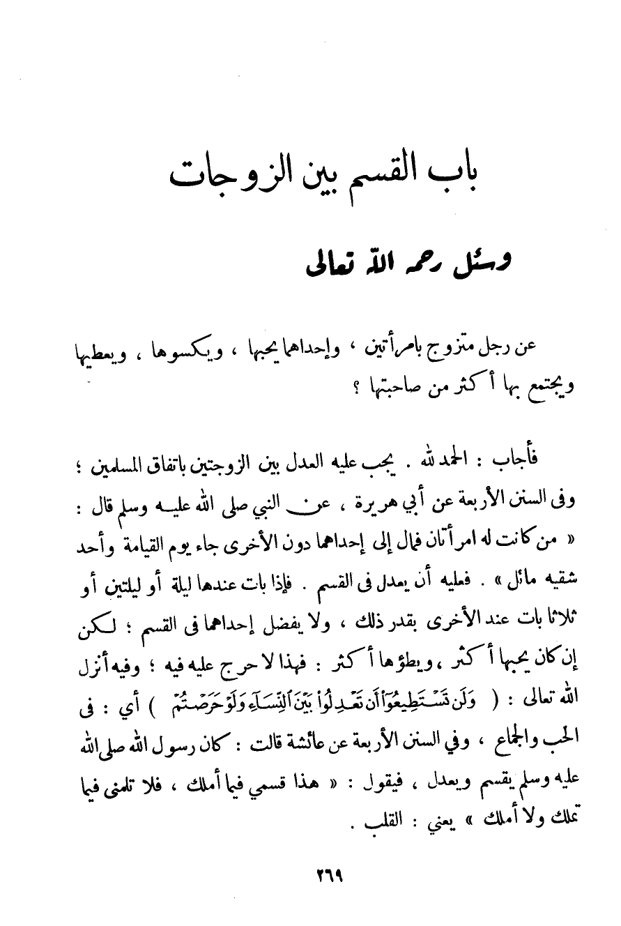 الْحَمْدُ لِلَّهِ، يَجِبُ عَلَيْهِ الْعَدْلُ بَيْنَ الزَّوْجَتَيْنِ بِاتِّفَاقِ الْمُسْلِمِينَ؛ وَفِي السُّنَنِ الْأَرْبَعَةِ عَنْ أَبِي هُرَيْرَةَ عَنْ النَّبِيِّ صَلَّى اللَّهُ عَلَيْهِ وَسَلَّمَ قَالَ: {مَنْ كَانَتْ لَهُ امْرَأَتَانِ فَمَالَ إلَى إحْدَاهُمَا دُونَ الْأُخْرَى جَاءَ يَوْمَ الْقِيَامَةِ وَأَحَدُ شِقَّيْهِ مَائِلٌ} . فَعَلَيْهِ أَنْ يَعْدِلَ فِي الْقَسْمِ. فَإِذَا بَاتَ عِنْدَهَا لَيْلَةً أَوْ لَيْلَتَيْنِ أَوْ ثَلَاثًا بَاتَ عِنْدَ الْأُخْرَى بِقَدْرِ ذَلِكَ وَلَا يُفَضِّلُ إحْدَاهُمَا فِي الْقَسْمِ؛ لَكِنْ إنْ كَانَ يُحِبُّهَا أَكْثَرَ وَيَطَؤُهَا أَكْثَرَ: فَهَذَا لَا حَرَجَ عَلَيْهِ فِيهِ؛ وَفِيهِ أَنْزَلَ اللَّهُ تَعَالَى: {وَلَنْ تَسْتَطِيعُوا أَنْ تَعْدِلُوا بَيْنَ النِّسَاءِ وَلَوْ حَرَصْتُمْ} أَيْ: فِي الْحُبِّ وَالْجِمَاعِ وَفِي السُّنَنِ الْأَرْبَعَةِ عَنْ عَائِشَةَ قَالَتْ: {كَانَ رَسُولُ اللَّهِ صَلَّى اللَّهُ عَلَيْهِ وَسَلَّمَ يَقْسِمُ وَيَعْدِلُ فَيَقُولُ: هَذَا قَسْمِي فِيمَا أَمْلِكُ فَلَا تَلُمْنِي فِيمَا تَمْلِكُ وَلَا أَمْلِكُ} يَعْنِي: الْقَلْبَ.