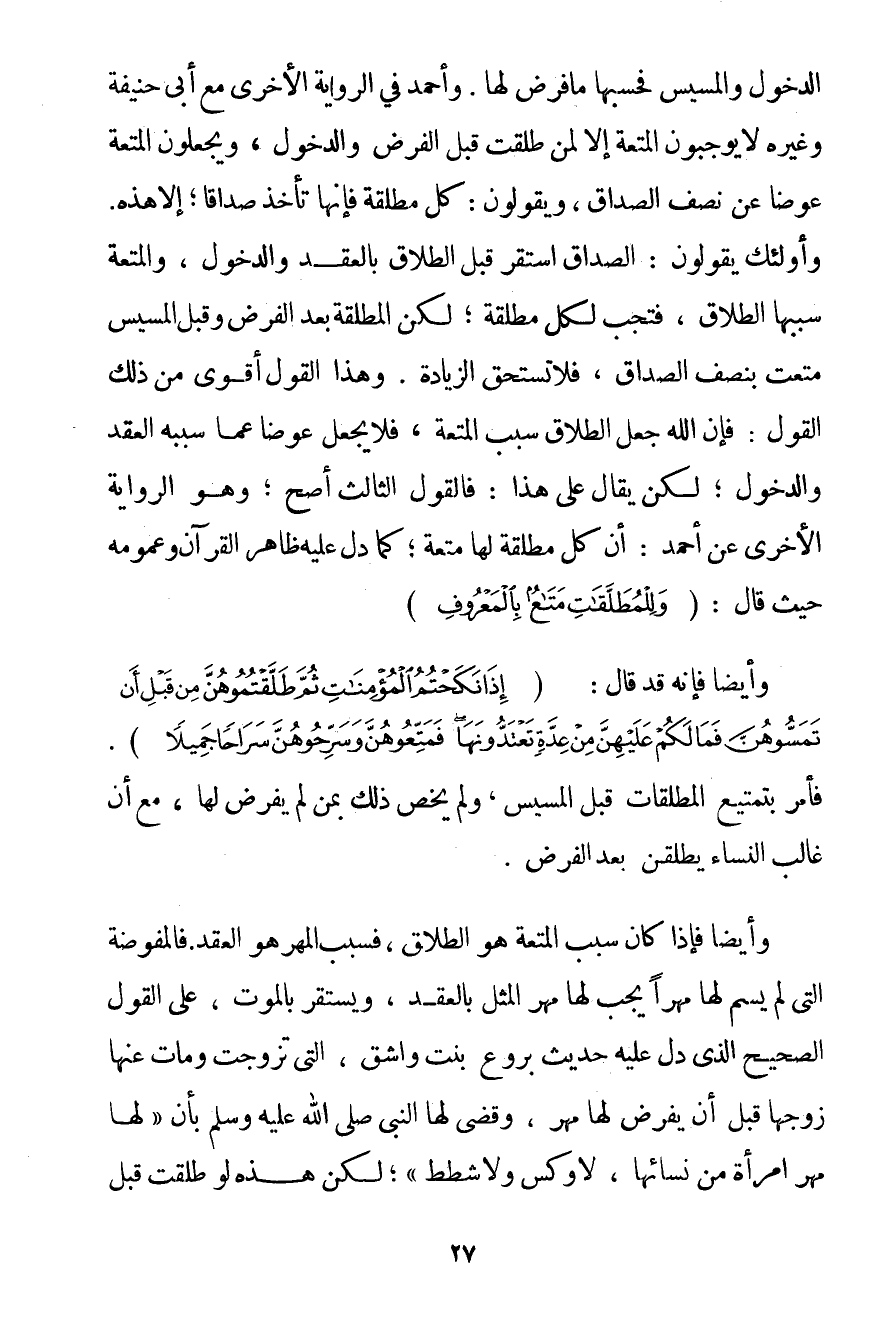 الدُّخُولِ وَالْمَسِيسِ فَحَسْبُهَا مَا فُرِضَ لَهَا. وَأَحْمَد فِي الرِّوَايَةِ الْأُخْرَى مَعَ أَبِي حَنِيفَةَ وَغَيْرِهِ لَا يُوجِبُونَ الْمُتْعَةَ إلَّا لِمَنْ طَلَقَتْ قَبْلَ الْفَرْضِ وَالدُّخُولِ وَيَجْعَلُونَ الْمُتْعَةَ عِوَضًا عَنْ نِصْفِ الصَّدَاقِ وَيَقُولُونَ: كُلُّ مُطَلَّقَةٍ فَإِنَّهَا تَأْخُذُ صَدَاقًا؛ إلَّا هَذِهِ. وَأُولَئِكَ يَقُولُونَ: الصَّدَاقُ اسْتَقَرَّ قَبْلَ الطَّلَاقِ بِالْعَقْدِ وَالدُّخُولِ وَالْمُتْعَةُ سَبَبُهَا الطَّلَاقُ فَتَجِبُ لِكُلِّ مُطَلَّقَةٍ؛ لَكِنَّ الْمُطَلَّقَةَ بَعْدَ الْفَرْضِ وَقَبْلَ الْمَسِيسِ مُتِّعَتْ بِنِصْفِ الصَّدَاقِ فَلَا تَسْتَحِقُّ الزِّيَادَةَ. وَهَذَا الْقَوْلُ أَقْوَى مِنْ ذَلِكَ الْقَوْلِ: فَإِنَّ اللَّهَ جَعَلَ الطَّلَاقَ سَبَبَ الْمُتْعَةِ فَلَا يُجْعَلُ عِوَضًا عَمَّا سَبَّبَهُ الْعَقْدُ وَالدُّخُولُ؛ لَكِنْ يُقَالُ عَلَى هَذَا: فَالْقَوْلُ الثَّالِثُ أَصَحُّ؛ وَهُوَ الرِّوَايَةُ الْأُخْرَى عَنْ أَحْمَد: أَنَّ كُلَّ مُطَلَّقَةٍ لَهَا مُتْعَةٌ؛ كَمَا دَلَّ عَلَيْهِ ظَاهِرُ الْقُرْآنِ وَعُمُومُهُ حَيْثُ قَالَ: {وَلِلْمُطَلَّقَاتِ مَتَاعٌ بِالْمَعْرُوفِ} وَأَيْضًا فَإِنَّهُ قَدْ قَالَ: {إذَا نَكَحْتُمُ الْمُؤْمِنَاتِ ثُمَّ طَلَّقْتُمُوهُنَّ مِنْ قَبْلِ أَنْ تَمَسُّوهُنَّ فَمَا لَكُمْ عَلَيْهِنَّ مِنْ عِدَّةٍ تَعْتَدُّونَهَا فَمَتِّعُوهُنَّ وَسَرِّحُوهُنَّ سَرَاحًا جَمِيلًا} . فَأَمَرَ بِتَمْتِيعِ الْمُطَلَّقَاتِ قَبْلَ الْمَسِيسِ وَلَمْ يَخُصَّ ذَلِكَ بِمَنْ لَمْ يُفْرَضْ لَهَا مَعَ أَنَّ غَالِبَ النِّسَاءِ يَطْلُقْنَ بَعْدَ الْفَرْضِ. وَأَيْضًا فَإِذَا كَانَ سَبَبُ الْمُتْعَةِ هُوَ الطَّلَاقَ فَسَبَبُ الْمَهْرِ هُوَ الْعَقْدُ. فَالْمُفَوَّضَةُ الَّتِي لَمْ يُسَمِّ لَهَا مَهْرًا يَجِبُ لَهَا مَهْرُ الْمِثْلِ بِالْعَقْدِ وَيَسْتَقِرُّ بِالْمَوْتِ عَلَى الْقَوْلِ الصَّحِيحِ الَّذِي دَلَّ عَلَيْهِ حَدِيثُ بروع بِنْتِ وَاشِقٍ الَّتِي تَزَوَّجَتْ وَمَاتَ عَنْهَا زَوْجُهَا قَبْلَ أَنْ يُفْرَضَ لَهَا مَهْرٌ وَقَضَى لَهَا النَّبِيُّ صَلَّى اللَّهُ عَلَيْهِ وَسَلَّمَ بِأَنَّ {لَهَا مَهْرَ امْرَأَةٍ مِنْ نِسَائِهَا لَا وَكْسَ وَلَا شَطَطَ} لَكِنْ هَذِهِ لَوْ طَلَقَتْ قَبْلَ