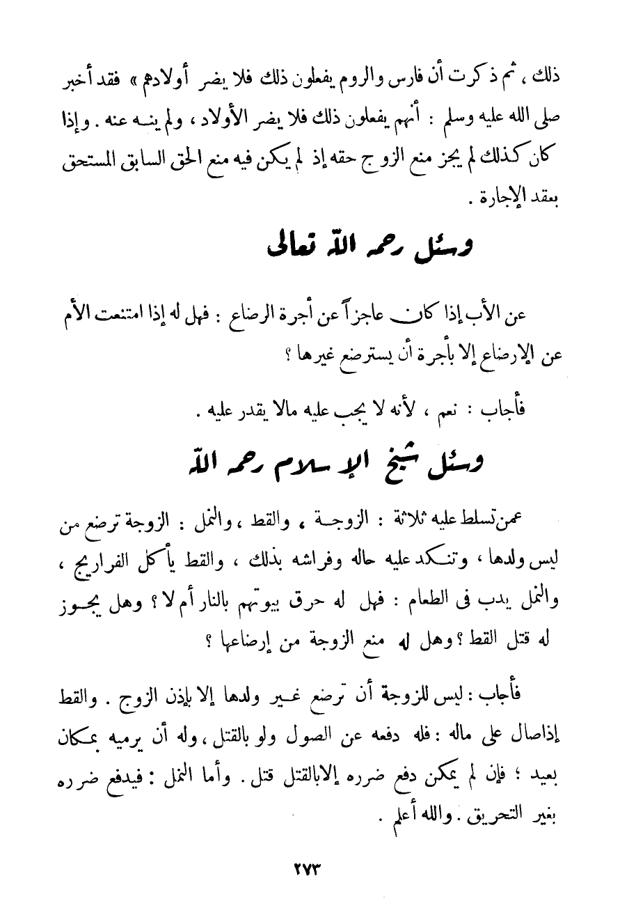 لَيْسَ لِلزَّوْجَةِ أَنْ تُرْضِعَ غَيْرَ وَلَدِهَا إلَّا بِإِذْنِ الزَّوْجِ. وَالْقِطُّ إذَا صَالَ عَلَى مَالِهِ: فَلَهُ دَفْعُهُ عَنْ الصَّوْلِ وَلَوْ بِالْقَتْلِ وَلَهُ أَنْ يَرْمِيَهُ بِمَكَانِ بَعِيدٍ؛ فَإِنْ لَمْ يَكُنْ دَفْعُ ضَرَرِهِ إلَّا بِالْقَتْلِ قُتِلَ. وَأَمَّا النَّمْلُ: فَيُدْفَعُ ضَرَرُهُ بِغَيْرِ التَّحْرِيقِ. وَاَللَّهُ أَعْلَمُ.
