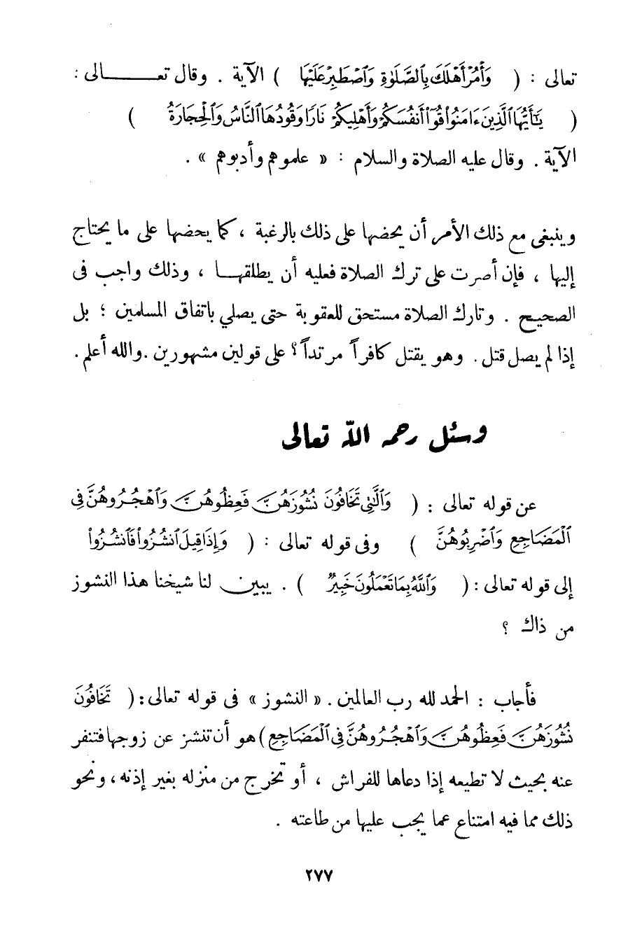 تَعَالَى: {وَأْمُرْ أَهْلَكَ بِالصَّلَاةِ وَاصْطَبِرْ عَلَيْهَا} الْآيَةَ. وَقَالَ تَعَالَى {يَا أَيُّهَا الَّذِينَ آمَنُوا قُوا أَنْفُسَكُمْ وَأَهْلِيكُمْ نَارًا وَقُودُهَا النَّاسُ وَالْحِجَارَةُ} الْآيَةَ. وَقَالَ عَلَيْهِ الصَّلَاةُ وَالسَّلَامُ {عَلِّمُوهُمْ وَأَدِّبُوهُمْ} . وَيَنْبَغِي مَعَ ذَلِكَ الْأَمْرِ أَنْ يَحُضَّهَا عَلَى ذَلِكَ بِالرَّغْبَةِ كَمَا يَحُضُّهَا عَلَى مَا يَحْتَاجُ إلَيْهَا فَإِنْ أَصَرَّتْ عَلَى تَرْكِ الصَّلَاةِ فَعَلَيْهِ أَنْ يُطَلِّقَهَا وَذَلِكَ وَاجِبٌ فِي الصَّحِيحِ. وَتَارِكُ الصَّلَاةِ مُسْتَحِقٌّ لِلْعُقُوبَةِ حَتَّى يُصَلِّيَ بِاتِّفَاقِ الْمُسْلِمِينَ؛ بَلْ إذَا لَمْ يُصَلِّ قُتِلَ. وَهُوَ يُقْتَلُ كَافِرًا مُرْتَدًّا؟ عَلَى قَوْلَيْنِ مَشْهُورَيْنِ. وَاَللَّهُ أَعْلَمُ.