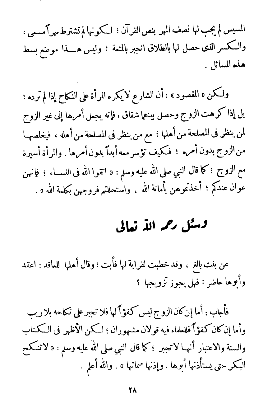 الْمَسِيسِ لَمْ يَجِبْ لَهَا نِصْفُ الْمَهْرِ بِنَصِّ الْقُرْآنِ؛ لِكَوْنِهَا لَمْ تَشْتَرِطْ مَهْرًا مُسَمًّى وَالْكَسْرُ الَّذِي حَصَلَ لَهَا بِالطَّلَاقِ انْجَبَرَ بِالْمُتْعَةِ؛ وَلَيْسَ هَذَا مَوْضِعَ بَسْطِ هَذِهِ الْمَسَائِلِ. وَلَكِنَّ " الْمَقْصُودَ ": أَنَّ الشَّارِعَ لَا يُكْرِهُ الْمَرْأَةَ عَلَى النِّكَاحِ إذَا لَمْ تُرِدْهُ؛ بَلْ إذَا كَرِهَتْ الزَّوْجَ وَحَصَلَ بَيْنَهُمَا شِقَاقٌ فَإِنَّهُ يَجْعَلُ أَمْرَهَا إلَى غَيْرِ الزَّوْجِ لِمَنْ يَنْظُرُ فِي الْمَصْلَحَةِ مِنْ أَهْلِهَا؛ مَعَ مَنْ يَنْظُرُ فِي الْمَصْلَحَةِ مِنْ أَهْلِهِ فَيُخَلِّصُهَا مِنْ الزَّوْجِ بِدُونِ أَمْرِهِ؛ فَكَيْفَ تُؤْسَرُ مَعَهُ أَبَدًا بِدُونِ أَمْرِهَا. وَالْمَرْأَةُ أَسِيرَةٌ مَعَ الزَّوْجِ؛ كَمَا قَالَ النَّبِيُّ صَلَّى اللَّهُ عَلَيْهِ وَسَلَّمَ {اتَّقُوا اللَّهَ فِي النِّسَاءِ؛ فَإِنَّهُنَّ عَوَانٌ عِنْدَكُمْ؛ أَخَذْتُمُوهُنَّ بِأَمَانَةِ اللَّهِ وَاسْتَحْلَلْتُمْ فُرُوجَهُنَّ بِكَلِمَةِ اللَّهِ} .