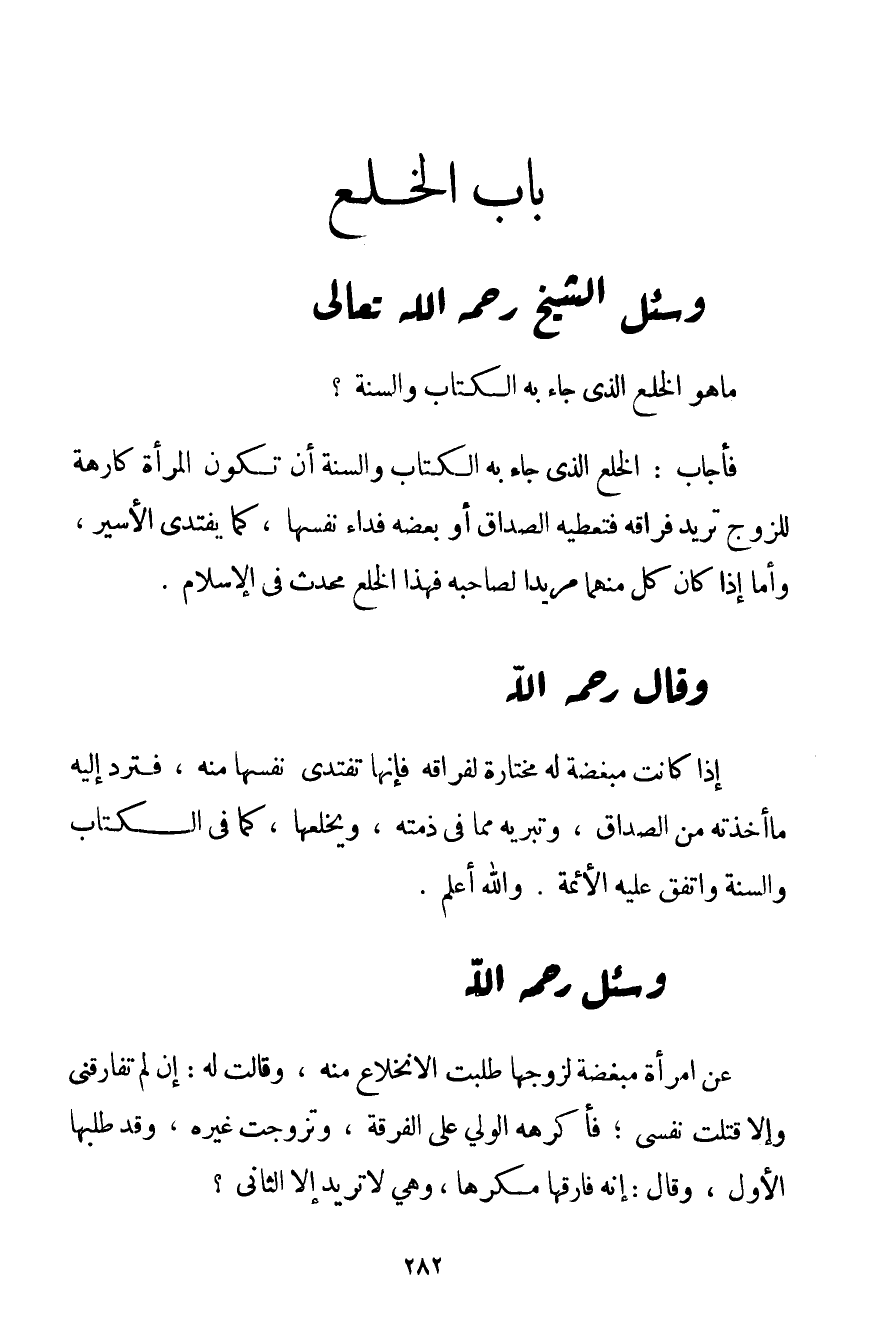 الْخُلْعُ الَّذِي جَاءَ بِهِ الْكِتَابُ وَالسُّنَّةُ أَنْ تَكُونَ الْمَرْأَةُ كَارِهَةً لِلزَّوْجِ تُرِيدُ فِرَاقَهُ فَتُعْطِيهِ الصَّدَاقَ أَوْ بَعْضَهُ فِدَاءَ نَفْسِهَا كَمَا يُفْتَدَى الْأَسِيرُ وَأَمَّا إذَا كَانَ كُلٌّ مِنْهُمَا مُرِيدًا لِصَاحِبِهِ فَهَذَا الْخُلْعُ مُحْدَثٌ فِي الْإِسْلَامِ. وَقَالَ رَحِمَهُ اللَّهُ إذَا كَانَتْ مُبْغِضَةً لَهُ مُخْتَارَةً لِفِرَاقِهِ فَإِنَّهَا تَفْتَدِي نَفْسَهَا مِنْهُ فَتَرُدُّ إلَيْهِ مَا أَخَذَتْهُ مِنْ الصَّدَاقِ وَتُبْرِيهِ مِمَّا فِي ذِمَّتِهِ وَيَخْلَعُهَا كَمَا فِي الْكِتَابِ وَالسُّنَّةِ وَاتَّفَقَ عَلَيْهِ الْأَئِمَّةُ. وَاَللَّهُ أَعْلَمُ.