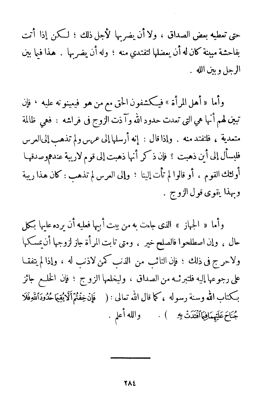 حَتَّى تُعْطِيَهُ بَعْضَ الصَّدَاقِ وَلَا أَنْ يَضْرِبَهَا لِأَجْلِ ذَلِكَ؛ لَكِنْ إذَا أَتَتْ بِفَاحِشَةٍ مُبَيِّنَةٍ كَانَ لَهُ أَنْ يَعْضُلَهَا لِتَفْتَدِي مِنْهُ؛ وَلَهُ أَنْ يَضْرِبَهَا. هَذَا فِيمَا بَيْنَ الرَّجُلِ وَبَيْنَ اللَّهِ. وَأَمَّا " أَهْلُ الْمَرْأَةِ " فَيَكْشِفُونَ الْحَقَّ مَعَ مَنْ هُوَ فَيُعِينُونَهُ عَلَيْهِ فَإِنْ تَبَيَّنَ لَهُمْ أَنَّهَا هِيَ الَّتِي تَعَدَّتْ حُدُودَ اللَّهِ وَآذَتْ الزَّوْجَ فِي فِرَاشِهِ: فَهِيَ ظَالِمَةٌ مُتَعَدِّيَةٌ فَلْتَفْتَدِ مِنْهُ. وَإِذَا قَالَ: إنَّهُ أَرْسَلَهَا إلَى عُرْسٍ وَلَمْ تَذْهَبْ إلَى الْعُرْسِ فَلْيَسْأَلْ إلَى أَيْنَ ذَهَبَتْ؟ فَإِنْ ذَكَرَ أَنَّهَا ذَهَبَتْ إلَى قَوْمٍ لَا رِيبَةَ عِنْدَهُمْ وَصَدَّقَهَا أُولَئِكَ الْقَوْمُ أَوْ قَالُوا لَمْ تَأْتِ إلَيْنَا؛ وَإِلَى الْعُرْسِ لَمْ تَذْهَبْ: كَانَ هَذَا رِيبَةً وَبِهَذَا يَقْوَى قَوْلُ الزَّوْجِ. وَأَمَّا " الْجِهَازُ " الَّذِي جَاءَتْ بِهِ مِنْ بَيْتِ أَبِيهَا فَعَلَيْهِ أَنْ يَرُدَّهُ عَلَيْهَا بِكُلِّ حَالٍ وَإِنْ اصْطَلَحُوا فَالصُّلْحُ خَيْرٌ وَمَتَى تَابَتْ الْمَرْأَةُ جَازَ لِزَوْجِهَا أَنْ يُمْسِكَهَا وَلَا حَرَجَ فِي ذَلِكَ؛ فَإِنَّ التَّائِبَ مِنْ الذَّنْبِ كَمَنْ لَا ذَنْبَ لَهُ وَإِذَا لَمْ يَتَّفِقَا عَلَى رُجُوعِهَا إلَيْهِ فَلْتُبْرِئْهُ مِنْ الصَّدَاقِ وَلْيَخْلَعْهَا الزَّوْجُ؛ فَإِنَّ الْخُلْعَ جَائِزٌ بِكِتَابِ اللَّهِ وَسُنَّةِ رَسُولِهِ كَمَا قَالَ اللَّهُ تَعَالَى: {فَإِنْ خِفْتُمْ أَلَّا يُقِيمَا حُدُودَ اللَّهِ فَلَا جُنَاحَ عَلَيْهِمَا فِيمَا افْتَدَتْ بِهِ} . وَاَللَّهُ أَعْلَمُ.