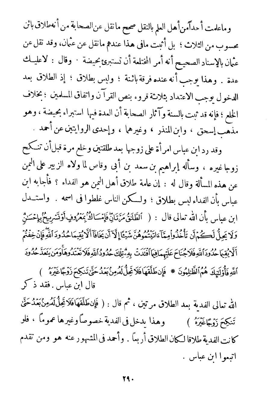 وَمَا عَلِمْت أَحَدًا مِنْ أَهْلِ الْعِلْمِ بِالنَّقْلِ صَحَّحَ مَا نُقِلَ عَنْ الصَّحَابَةِ مِنْ أَنَّهُ طَلَاقٌ بَائِنٌ مَحْسُوبٌ مِنْ الثَّلَاثِ؛ بَلْ أَثْبَتُ مَا فِي هَذَا عِنْدَهُمْ مَا نُقِلَ عَنْ عُثْمَانَ وَقَدْ نُقِلَ عَنْ عُثْمَانَ بِالْإِسْنَادِ الصَّحِيحِ أَنَّهُ أَمَرَ الْمُخْتَلَعَةَ أَنْ تَسْتَبْرِئَ بِحَيْضَةِ. وَقَالَ: لَا عَلَيْك عِدَّةٌ. وَهَذَا يُوجِبُ أَنَّهُ عِنْدَهُ فُرْقَةٌ بَائِنَةٌ؛ وَلَيْسَ بِطَلَاقِ؛ إذْ الطَّلَاقُ بَعْدَ الدُّخُولِ يُوجِبُ الِاعْتِدَادَ بِثَلَاثِ قُرُوءٍ بِنَصِّ الْقُرْآنِ وَاتِّفَاقِ الْمُسْلِمِينَ بِخِلَافِ الْخُلْعِ؛ فَإِنَّهُ قَدْ ثَبَتَ بِالسُّنَّةِ وَآثَارِ الصَّحَابَةِ أَنَّ الْعِدَّةَ فِيهَا اسْتِبْرَاءٌ بِحَيْضَةِ وَهُوَ مَذْهَبُ إسْحَاقَ وَابْنِ الْمُنْذِرِ وَغَيْرِهِمَا وَإِحْدَى الرِّوَايَتَيْنِ عَنْ أَحْمَدَ. وَقَدْ رَدَّ ابْنُ عَبَّاسٍ امْرَأَةً عَلَى زَوْجِهَا بَعْدَ طَلْقَتَيْنِ وَخَلَعَ مَرَّةً قَبْلَ أَنْ تَنْكِحَ زَوْجًا غَيْرَهُ وَسَأَلَهُ إبْرَاهِيمُ بْنُ سَعْدِ بْنِ أَبِي وَقَّاصٍ لَمَّا وَلَّاهُ ابْنُ الزُّبَيْرُ عَلَى الْيَمَنِ عَنْ هَذِهِ الْمَسْأَلَةِ وَقَالَ لَهُ: إنَّ عَامَّةَ طَلَاقِ أَهْلِ الْيَمَنِ هُوَ الْفِدَاءُ؟ فَأَجَابَهُ ابْنُ عَبَّاسٍ بِأَنَّ الْفِدَاءَ لَيْسَ بِطَلَاقِ؛ وَلَكِنَّ النَّاسَ غَلِطُوا فِي اسْمِهِ. وَاسْتَدَلَّ ابْنُ عَبَّاسٍ بِأَنَّ اللَّهَ تَعَالَى قَالَ: {الطَّلَاقُ مَرَّتَانِ فَإِمْسَاكٌ بِمَعْرُوفٍ أَوْ تَسْرِيحٌ بِإِحْسَانٍ وَلَا يَحِلُّ لَكُمْ أَنْ تَأْخُذُوا مِمَّا آتَيْتُمُوهُنَّ شَيْئًا إلَّا أَنْ يَخَافَا أَلَّا يُقِيمَا حُدُودَ اللَّهِ فَإِنْ خِفْتُمْ أَلَّا يُقِيمَا حُدُودَ اللَّهِ فَلَا جُنَاحَ عَلَيْهِمَا فِيمَا افْتَدَتْ بِهِ تِلْكَ حُدُودُ اللَّهِ فَلَا تَعْتَدُوهَا وَمَنْ يَتَعَدَّ حُدُودَ اللَّهِ فَأُولَئِكَ هُمُ الظَّالِمُونَ} {فَإِنْ طَلَّقَهَا فَلَا تَحِلُّ لَهُ مِنْ بَعْدُ حَتَّى تَنْكِحَ زَوْجًا غَيْرَهُ} قَالَ ابْنُ عَبَّاسٍ. فَقَدْ ذَكَرَ اللَّهُ تَعَالَى الْفِدْيَةَ بَعْدَ الطَّلَاقِ مَرَّتَيْنِ ثُمَّ قَالَ: {فَإِنْ طَلَّقَهَا فَلَا تَحِلُّ لَهُ مِنْ بَعْدُ حَتَّى تَنْكِحَ زَوْجًا غَيْرَهُ} وَهَذَا يَدْخُلُ فِي الْفِدْيَةِ خُصُوصًا وَغَيْرِهَا عُمُومًا فَلَوْ كَانَتْ الْفِدْيَةُ طَلَاقًا لَكَانَ الطَّلَاقُ أَرْبَعًا. وَأَحْمَدُ فِي الْمَشْهُورِ عَنْهُ هُوَ وَمَنْ تَقَدَّمَ اتَّبَعُوا ابْنَ عَبَّاسٍ.