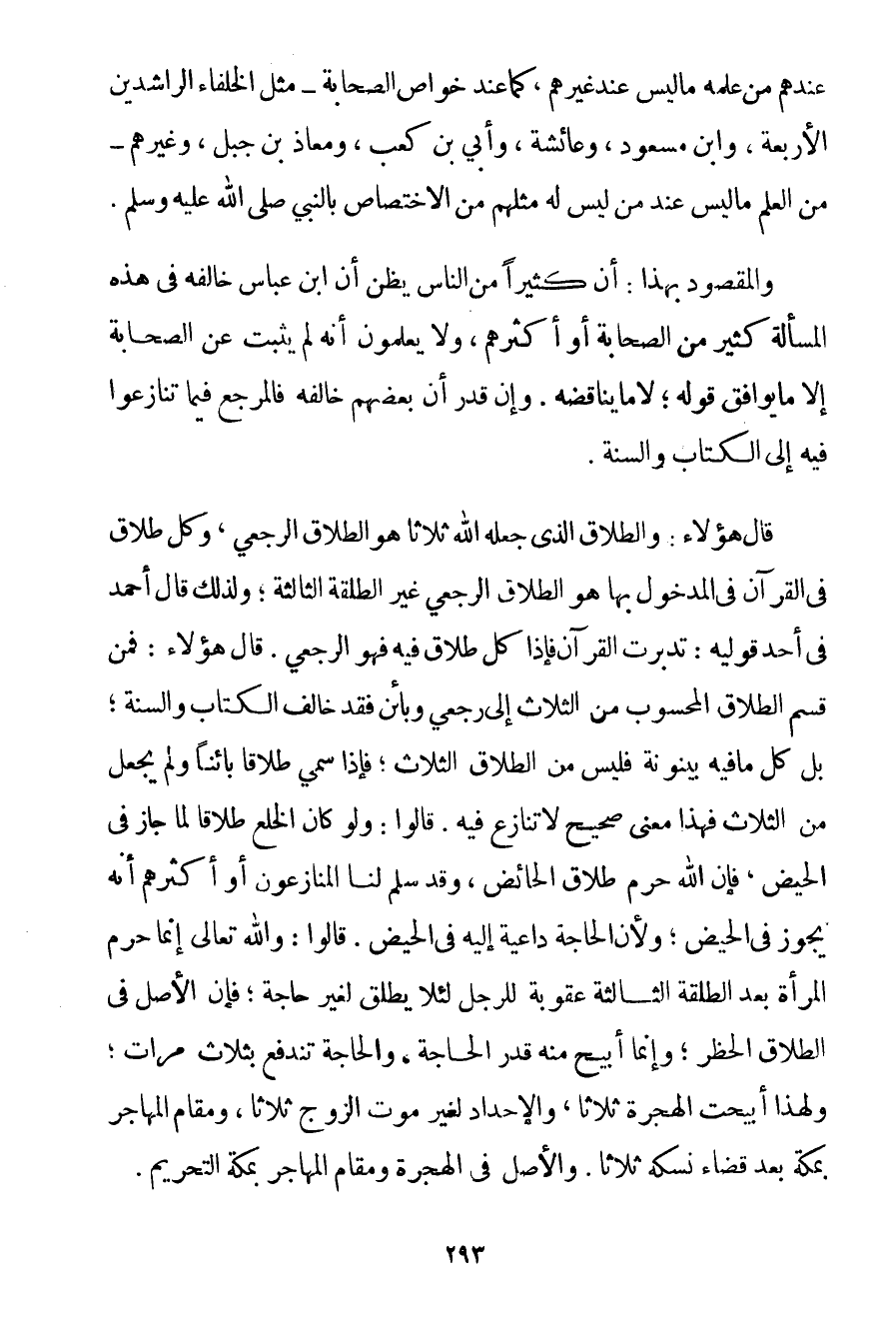 عِنْدَهُمْ مِنْ عِلْمِهِ مَا لَيْسَ عِنْدَ غَيْرِهِمْ كَمَا عِنْدَ خَوَاصِّ الصَّحَابَةِ - مِثْلَ الْخُلَفَاءِ الرَّاشِدِينَ الْأَرْبَعَةِ وَابْن مَسْعُودٍ وَعَائِشَةَ وأبي بْنِ كَعْبٍ وَمُعَاذِ بْنِ جَبَلٍ وَغَيْرِهِمْ - مِنْ الْعِلْمِ مَا لَيْسَ عِنْدَ مَنْ لَيْسَ لَهُ مِثْلُهُمْ مِنْ الِاخْتِصَاصِ بِالنَّبِيِّ صَلَّى اللَّهُ عَلَيْهِ وَسَلَّمَ. وَالْمَقْصُودُ بِهَذَا: أَنَّ كَثِيرًا مِنْ النَّاسِ يَظُنُّ أَنَّ ابْنَ عَبَّاسٍ خَالَفَهُ فِي هَذِهِ الْمَسْأَلَةِ كَثِيرٌ مِنْ الصَّحَابَةِ أَوْ أَكْثَرُهُمْ وَلَا يَعْلَمُونَ أَنَّهُ لَمْ يَثْبُتْ عَنْ الصَّحَابَةِ إلَّا مَا يُوَافِقُ قَوْلَهُ؛ لَا مَا يُنَاقِضُهُ. وَإِنْ قُدِّرَ أَنَّ بَعْضَهُمْ خَالَفَهُ فَالْمَرْجِعُ فِيمَا تَنَازَعُوا فِيهِ إلَى الْكِتَابِ وَالسُّنَّةِ. قَالَ هَؤُلَاءِ: وَالطَّلَاقُ الَّذِي جَعَلَهُ اللَّهُ ثَلَاثًا هُوَ الطَّلَاقُ الرَّجْعِيُّ وَكُلُّ طَلَاقٍ فِي الْقُرْآنِ فِي الْمَدْخُولِ بِهَا هُوَ الطَّلَاقُ الرَّجْعِيُّ غَيْرَ الطَّلْقَةِ الثَّالِثَةِ. وَلِذَلِكَ قَالَ أَحْمَدُ فِي أَحَدِ قَوْلَيْهِ: تَدَبَّرْت الْقُرْآنَ فَإِذَا كُلُّ طَلَاقٍ فِيهِ فَهُوَ الرَّجْعِيُّ. قَالَ هَؤُلَاءِ: فَمَنْ قَسَّمَ الطَّلَاقَ الْمَحْسُوبَ مِنْ الثَّلَاثِ إلَى رَجْعِيٍّ وَبَائِنٍ فَقَدْ خَالَفَ الْكِتَابَ وَالسُّنَّةَ؛ بَلْ كُلُّ مَا فِيهِ بَيْنُونَةٌ فَلَيْسَ مِنْ الطَّلَاقِ الثَّلَاثِ؛ فَإِذَا سُمِّيَ طَلَاقًا بَائِنًا وَلَمْ يُجْعَلْ مِنْ الثَّلَاثِ فَهَذَا مَعْنًى صَحِيحٌ لَا تَنَازُعَ فِيهِ. قَالُوا: وَلَوْ كَانَ الْخُلْعُ طَلَاقًا لَمَا جَازَ فِي الْحَيْضِ فَإِنَّ اللَّهَ حَرَّمَ طَلَاقَ الْحَائِضِ وَقَدْ سَلَّمَ لَنَا الْمُنَازِعُونَ أَوْ أَكْثَرُهُمْ أَنَّهُ يَجُوزُ فِي الْحَيْضِ؛ وَلِأَنَّ الْحَاجَةَ دَاعِيَةٌ إلَيْهِ فِي الْحَيْضِ. قَالُوا: وَاَللَّهُ تَعَالَى إنَّمَا حَرَّمَ الْمَرْأَةَ بَعْدَ الطَّلْقَةِ الثَّالِثَةِ عُقُوبَةً لِلرَّجُلِ لِئَلَّا يُطَلِّقَ لِغَيْرِ حَاجَةٍ؛ فَإِنَّ الْأَصْلَ فِي الطَّلَاقِ الْحَظْرُ؛ وَإِنَّمَا أُبِيحَ مِنْهُ قَدْرُ الْحَاجَةِ وَالْحَاجَةُ تَنْدَفِعُ بِثَلَاثِ مَرَّاتٍ؛ وَلِهَذَا أُبِيحَتْ الْهِجْرَةُ ثَلَاثًا وَالْإِحْدَادُ لِغَيْرِ مَوْتِ الزَّوْجِ ثَلَاثًا وَمُقَامُ الْمُهَاجِرِ بِمَكَّةَ بَعْدَ قَضَاءِ نُسُكِهِ ثَلَاثًا. وَالْأَصْلُ فِي الْهِجْرَةِ وَمُقَامُ الْمُهَاجِرِ بِمَكَّةَ التَّحْرِيمُ.