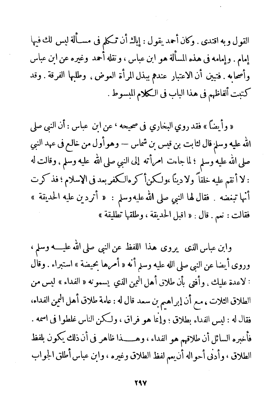 الْقَوْلِ وَبِهِ اقْتَدَى. وَكَانَ أَحْمَد يَقُولُ: إيَّاكَ أَنْ تَكَلَّمَ فِي مَسْأَلَةٍ لَيْسَ لَك فِيهَا إمَامٌ. وَإِمَامُهُ فِي هَذِهِ الْمَسْأَلَةِ هُوَ ابْنُ عَبَّاسٍ وَنَقَلَهُ أَحْمَد وَغَيْرُهُ عَنْ ابْنِ عَبَّاسٍ وَأَصْحَابِهِ. فَتَبَيَّنَ أَنَّ الِاعْتِبَارَ عِنْدَهُمْ بِبَذْلِ الْمَرْأَةِ الْعِوَضَ وَطَلَبِهَا الْفُرْقَةَ. وَقَدْ كَتَبْت أَلْفَاظَهُمْ فِي هَذَا الْبَابِ فِي الْكَلَامِ الْمَبْسُوطِ. " وَأَيْضًا " فَقَدْ رَوَى الْبُخَارِيُّ فِي صَحِيحِهِ عَنْ ابْنِ عَبَّاسٍ: {أَنَّ النَّبِيَّ صَلَّى اللَّهُ عَلَيْهِ وَسَلَّمَ قَالَ لِثَابِتِ بْنِ قَيْسِ بْن شَمَّاسٍ - وَهُوَ أَوَّلُ مَنْ خَالَعَ فِي عَهْدِ النَّبِيِّ صَلَّى اللَّهُ عَلَيْهِ وَسَلَّمَ لَمَّا جَاءَتْ امْرَأَتُهُ إلَى النَّبِيِّ صَلَّى اللَّهُ عَلَيْهِ وَسَلَّمَ وَقَالَتْ لَهُ: لَا أَنْقِمُ عَلَيْهِ خُلُقًا وَلَا دِينًا وَلَكِنْ أَكْرَهُ الْكُفْرَ بَعْدُ فِي الْإِسْلَامِ؛ فَذَكَرَتْ أَنَّهَا تُبْغِضُهُ. فَقَالَ لَهَا النَّبِيُّ صَلَّى اللَّهُ عَلَيْهِ وَسَلَّمَ أَتَرُدِّينَ عَلَيْهِ الْحَدِيقَةَ فَقَالَتْ: نَعَمْ. قَالَ: اقْبَلْ الْحَدِيقَةَ وَطَلِّقْهَا تَطْلِيقَةً} وَابْنُ عَبَّاسٍ الَّذِي يَرْوِي هَذَا اللَّفْظَ عَنْ النَّبِيِّ صَلَّى اللَّهُ عَلَيْهِ وَسَلَّمَ وَرَوَى أَيْضًا {عَنْ النَّبِيِّ صَلَّى اللَّهُ عَلَيْهِ وَسَلَّمَ أَنَّهُ أَمَرَهَا بِحَيْضَةِ اسْتِبْرَاءٍ. وَقَالَ: لَا عِدَّةَ عَلَيْك} وَأَفْتَى بِأَنَّ طَلَاقَ أَهْلِ الْيَمَنِ الَّذِي يُسَمُّونَهُ " الْفِدَاءَ " لَيْسَ مِنْ الطَّلَاقِ الثَّلَاثِ مَعَ أَنَّ إبْرَاهِيمَ بْنَ سَعْدٍ قَالَ لَهُ: عَامَّةُ طَلَاقِ أَهْلِ الْيَمَنِ الْفِدَاءُ فَقَالَ لَهُ: لَيْسَ الْفِدَاءُ بِطَلَاقِ؛ وَإِنَّمَا هُوَ فِرَاقٌ وَلَكِنَّ النَّاسَ غَلِطُوا فِي اسْمِهِ. فَأَخْبَرَهُ السَّائِلُ أَنَّ طَلَاقَهُمْ هُوَ الْفِدَاءُ وَهَذَا ظَاهِرٌ فِي أَنَّ ذَلِكَ يَكُونُ بِلَفْظِ الطَّلَاقِ وَأَدْنَى أَحْوَالِهِ أَنْ يَعُمَّ لَفْظُ الطَّلَاقِ وَغَيْرِهِ وَابْنُ عَبَّاسٍ أَطْلَقَ الْجَوَابَ