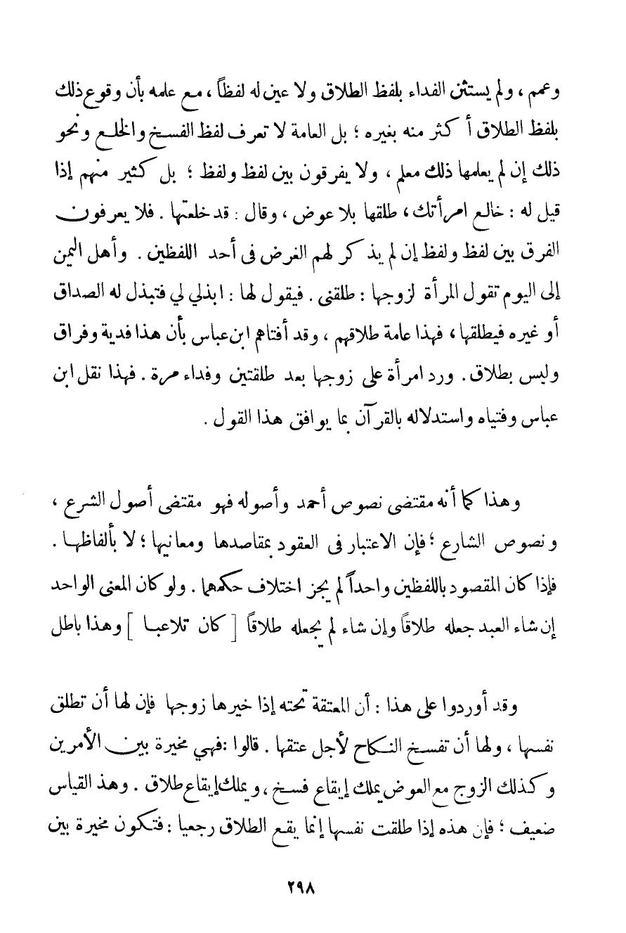 وَأَهْلُ الْيَمَنِ إلَى الْيَوْمِ تَقُولُ الْمَرْأَةُ لِزَوْجِهَا: طَلِّقْنِي. فَيَقُولُ لَهَا: اُبْذُلِي لِي فَتَبْذُلُ لَهُ الصَّدَاقَ أَوْ غَيْرَهُ فَيُطَلِّقُهَا. فَهَذَا عَامَّةُ طَلَاقِهِمْ وَقَدّ أَفْتَاهُمْ ابْنُ عَبَّاسٍ بِأَنَّ هَذَا فِدْيَةٌ وَفِرَاقٌ وَلَيْسَ بِطَلَاقِ. وَرَدَّ امْرَأَةً عَلَى زَوْجِهَا بَعْدَ طَلْقَتَيْنِ وَفِدَاءٍ مَرَّةً. فَهَذَا نَقْلُ ابْنِ عَبَّاسٍ وَفُتْيَاهُ وَاسْتِدْلَالُهُ بِالْقُرْآنِ بِمَا يُوَافِقُ هَذَا الْقَوْلَ. وَهَذَا كَمَا أَنَّهُ مُقْتَضَى نُصُوصِ أَحْمَد وَأُصُولُهُ فَهُوَ مُقْتَضَى أُصُولِ الشَّرْعِ وَنُصُوصِ الشَّارِعِ؛ فَإِنَّ الِاعْتِبَارَ فِي الْعُقُودِ بِمَقَاصِدِهَا وَمَعَانِيهَا؛ لَا بِأَلْفَاظِهَا. فَإِذَا كَانَ الْمَقْصُودُ بِاللَّفْظَيْنِ وَاحِدًا لَمْ يَجُزْ اخْتِلَافُ حُكْمِهِمَا. وَلَوْ كَانَ الْمَعْنَى الْوَاحِدُ إنْ شَاءَ الْعَبْدُ جَعَلَهُ طَلَاقًا وَإِنْ شَاءَ لَمْ يَجْعَلْهُ طَلَاقًا كَانَ تَلَاعُبًا وَهَذَا بَاطِلٌ وَقَدْ أَوْرَدُوا عَلَى هَذَا: أَنَّ الْمُعْتَقَةَ تَحْتَهُ إذَا خَيَّرَهَا زَوْجُهَا فَإِنَّ لَهَا أَنْ تُطَلِّقَ نَفْسَهَا وَلَهَا أَنْ تَفْسَخَ النِّكَاحَ لِأَجْلِ عِتْقِهَا. قَالُوا: فَهِيَ مُخَيَّرَةٌ بَيْنَ الْأَمْرَيْنِ وَكَذَلِكَ الزَّوْجُ مَعَ الْعِوَضِ يَمْلِكُ إيقَاعَ فَسْخٍ وَيَمْلِكُ إيقَاعَ طَلَاقٍ. وَهَذَا الْقِيَاسُ ضَعِيفٌ؛ فَإِنَّ هَذِهِ إذَا طَلَّقَتْ نَفْسَهَا إنَّمَا يَقَعُ الطَّلَاقُ رَجْعِيًّا: فَتَكُونُ مُخَيَّرَةً بَيْنَ