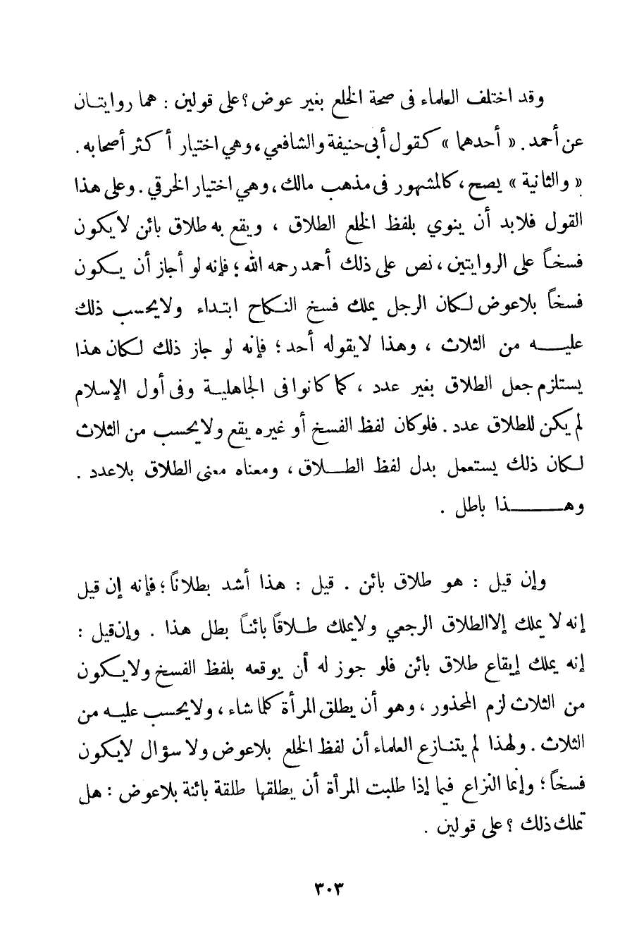 وَقَدْ اخْتَلَفَ الْعُلَمَاءُ فِي صِحَّةِ الْخُلْعِ بِغَيْرِ عِوَضٍ؟ عَلَى قَوْلَيْنِ: هُمَا رِوَايَتَانِ عَنْ أَحْمَد. " أَحَدُهُمَا " كَقَوْلِ أَبِي حَنِيفَةَ وَالشَّافِعِيِّ وَهِيَ اخْتِيَارُ أَكْثَرِ أَصْحَابِهِ. " وَالثَّانِيَةُ " يَصِحُّ كَالْمَشْهُورِ فِي مَذْهَبِ مَالِكٍ وَهِيَ اخْتِيَارُ الخرقي. وَعَلَى هَذَا الْقَوْلِ فَلَا بُدَّ أَنْ يَنْوِيَ بِلَفْظِ الْخُلْعِ الطَّلَاقَ وَيَقَعَ بِهِ طَلَاقٌ بَائِنٌ لَا يَكُونُ فَسْخًا عَلَى الرِّوَايَتَيْنِ نَصَّ عَلَى ذَلِكَ أَحْمَد رَحِمَهُ اللَّهُ فَإِنَّهُ لَوْ أَجَازَ أَنْ يَكُونَ فَسْخًا بِلَا عِوَضٍ لَكَانَ الرَّجُلُ يَمْلِكُ فَسْخَ النِّكَاحِ ابْتِدَاءً وَلَا يُحْسَبُ ذَلِكَ عَلَيْهِ مِنْ الثَّلَاثِ وَهَذَا لَا يَقُولُهُ أَحَدٌ؛ فَإِنَّهُ لَوْ جَازَ ذَلِكَ لَكَانَ هَذَا يَسْتَلْزِمُ جَعْلَ الطَّلَاقِ بِغَيْرِ عَدَدٍ كَمَا كَانُوا فِي الْجَاهِلِيَّةِ: وَفِي أَوَّلِ الْإِسْلَامِ لَمْ يَكُنْ لِلطَّلَاقِ عَدَدٌ. فَلَوْ كَانَ لَفْظُ الْفَسْخِ أَوْ غَيْرِهِ يَقَعُ وَلَا يُحْسَبُ مِنْ الثَّلَاثِ لَكَانَ ذَلِكَ يُسْتَعْمَلُ بَدَلَ لَفْظِ الطَّلَاقِ وَمَعْنَاهُ مَعْنَى الطَّلَاقِ بِلَا عَدَدٍ. وَهَذَا بَاطِلٌ. وَإِنْ قِيلَ: هُوَ طَلَاقٌ بَائِنٌ. قِيلَ: هَذَا أَشَدُّ بُطْلَانًا؛ فَإِنَّهُ إنْ قِيلَ إنَّهُ لَا يَمْلِكُ إلَّا الطَّلَاقَ الرَّجْعِيَّ وَلَا يَمْلِكُ طَلَاقًا بَائِنًا بَطَلَ هَذَا. وَإِنْ قِيلَ: إنَّهُ يَمْلِكُ إيقَاعَ طَلَاقٍ بَائِنٍ فَلَوْ جُوِّزَ لَهُ أَنْ يُوقِعَهُ بِلَفْظِ الْفَسْخِ وَلَا يَكُونُ مِنْ الثَّلَاثِ لَزِمَ الْمَحْذُورُ وَهُوَ أَنْ يُطَلِّقَ الْمَرْأَةَ كُلَّمَا شَاءَ وَلَا يُحْسَبُ عَلَيْهِ مِنْ الثَّلَاثِ. وَلِهَذَا لَمْ يَتَنَازَعْ الْعُلَمَاءُ أَنَّ لَفْظَ الْخُلْعِ بِلَا عِوَضٍ وَلَا سُؤَالٍ لَا يَكُونُ فَسْخًا؛ وَإِنَّمَا النِّزَاعُ فِيمَا إذَا طَلَبَتْ الْمَرْأَةُ أَنْ يُطَلِّقَهَا طَلْقَةً بَائِنَةً بِلَا عِوَضٍ: هَلْ تَمْلِكُ ذَلِكَ؟ عَلَى قَوْلَيْنِ.