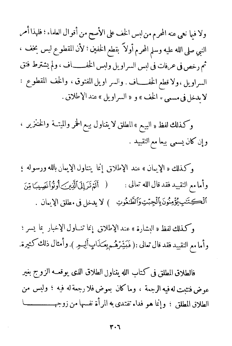 وَلَا فِيمَا نُهِيَ عَنْهُ الْمُحْرِمُ مِنْ لُبْسِ الْخُفِّ عَلَى الْأَصَحِّ مِنْ أَقْوَالِ الْعُلَمَاءِ؛ فَلِهَذَا أَمَرَ النَّبِيُّ صَلَّى اللَّهُ عَلَيْهِ وَسَلَّمَ الْمُحْرِمَ أَوَّلًا بِقَطْعِ الْخُفَّيْنِ؛ لِأَنَّ الْمَقْطُوعَ لَيْسَ بِخُفِّ ثُمَّ رَخَّصَ فِي عَرَفَاتٍ فِي لُبْسِ السَّرَاوِيلِ وَلُبْسِ الْخِفَافِ وَلَمْ يَشْتَرِطْ فَتْقَ السَّرَاوِيلِ وَلَا قَطْعَ الْخِفَافِ. وَالسَّرَاوِيلُ الْمَفْتُوقُ وَالْخُفُّ الْمَقْطُوعُ: لَا يَدْخُلُ فِي مُسَمَّى " الْخُفِّ " و " السَّرَاوِيلِ " عِنْدَ الْإِطْلَاقِ. وَكَذَلِكَ لَفْظُ " الْبَيْعِ " الْمُطْلَقِ لَا يَتَنَاوَلُ بَيْعَ الْخَمْرِ وَالْمَيْتَةِ وَالْخِنْزِيرِ وَإِنْ كَانَ يُسَمَّى بَيْعًا مَعَ التَّقْيِيدِ. وَكَذَلِكَ " الْإِيمَانُ " عِنْدَ الْإِطْلَاقِ إنَّمَا يَتَنَاوَلُ الْإِيمَانَ بِاَللَّهِ وَرَسُولِهِ؛ وَأَمَّا مَعَ التَّقْيِيدِ فَقَدْ قَالَ اللَّهُ تَعَالَى: {أَلَمْ تَرَ إلَى الَّذِينَ أُوتُوا نَصِيبًا مِنَ الْكِتَابِ يُؤْمِنُونَ بِالْجِبْتِ وَالطَّاغُوتِ} لَا يَدْخُلُ فِي مُطْلَقِ الْإِيمَانِ. وَكَذَلِكَ لَفْظُ " الْبِشَارَةِ " عِنْدَ الْإِطْلَاقِ إنَّمَا تَنَاوَلَ الْإِخْبَارَ بِمَا يَسُرُّ؛ وَأَمَّا مَعَ التَّقْيِيدِ فَقَدْ قَالَ تَعَالَى: {فَبَشِّرْهُمْ بِعَذَابٍ أَلِيمٍ} . وَأَمْثَالُ ذَلِكَ كَثِيرَةٌ فَالطَّلَاقُ الْمُطْلَقُ فِي كِتَابِ اللَّهِ يَتَنَاوَلُ الطَّلَاقَ الَّذِي يُوقِعُهُ الزَّوْجُ بِغَيْرِ عِوَضٍ فَتَثْبُتُ لَهُ فِيهِ الرَّجْعَةُ وَمَا كَانَ بِعِوَضِ فَلَا رَجْعَةَ لَهُ فِيهِ؛ وَلَيْسَ مِنْ الطَّلَاقِ الْمُطْلَقِ؛ وَإِنَّمَا هُوَ فِدَاءٌ تَفْتَدِي بِهِ الْمَرْأَةُ نَفْسَهَا مِنْ زَوْجِهَا