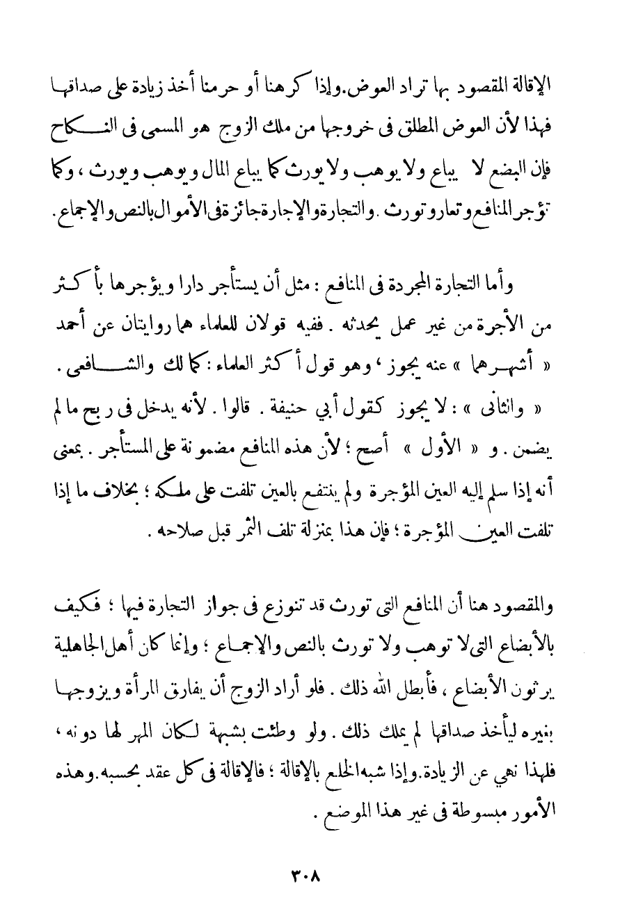 وَأَمَّا التِّجَارَةُ الْمُجَرَّدَةُ فِي الْمَنَافِعِ: مِثْلَ أَنْ يَسْتَأْجِرَ دَارًا وَيُؤَجِّرَهَا بِأَكْثَرَ مِنْ الْأُجْرَةِ مِنْ غَيْرِ عَمَلٍ يُحْدِثُهُ. فَفِيهِ قَوْلَانِ لِلْعُلَمَاءِ هُمَا رِوَايَتَانِ عَنْ أَحْمَد " أَشْهَرُهُمَا " عَنْهُ يَجُوزُ وَهُوَ قَوْلُ أَكْثَرِ الْعُلَمَاءِ: كَمَالِكِ وَالشَّافِعِيِّ. " وَالثَّانِي ": لَا يَجُوزُ كَقَوْلِ أَبِي حَنِيفَةَ. قَالُوا. لِأَنَّهُ يَدْخُلُ فِي رِبْحِ مَا لَمْ يُضْمَنْ. و " الْأَوَّلُ " أَصَحُّ؛ لِأَنَّ هَذِهِ الْمَنَافِعَ مَضْمُونَةٌ عَلَى الْمُسْتَأْجِرِ. بِمَعْنَى أَنَّهُ إذَا سَلَّمَ إلَيْهِ الْعَيْنَ الْمُؤَجَّرَةَ وَلَمْ يَنْتَفِعْ بِالْعَيْنِ تَلِفَتْ عَلَى مِلْكِهِ؛ بِخِلَافِ مَا إذَا تَلِفَتْ الْعَيْنُ الْمُؤَجَّرَةُ؛ فَإِنَّ هَذَا بِمَنْزِلَةِ تَلَفِ الثَّمَرِ قَبْلَ صَلَاحِهِ. وَالْمَقْصُودُ هُنَا أَنَّ الْمَنَافِعَ الَّتِي تُورَثُ قَدْ تُنُوزِعَ فِي جَوَازِ التِّجَارَةِ فِيهَا؛ فَكَيْفَ بِالْأَبْضَاعِ الَّتِي لَا تُوهَبُ وَلَا تُورَثُ بِالنَّصِّ وَالْإِجْمَاعِ؛ وَإِنَّمَا كَانَ أَهْلُ الْجَاهِلِيَّةِ يَرِثُونَ الْأَبْضَاعَ فَأَبْطَلَ اللَّهُ ذَلِكَ. فَلَوْ أَرَادَ الزَّوْجُ أَنْ يُفَارِقَ الْمَرْأَةَ وَيُزَوِّجَهَا بِغَيْرِهِ لِيَأْخُذَ صَدَاقَهَا لَمْ يَمْلِكْ ذَلِكَ. وَلَوْ وُطِئَتْ بِشُبْهَةِ لَكَانَ الْمَهْرُ لَهَا دُونَهُ فَلِهَذَا نَهَى عَنْ الزِّيَادَةِ. وَإِذَا شَبَّهَ الْخُلْعَ بِالْإِقَالَةِ؛ فَالْإِقَالَةُ فِي كُلِّ عَقْدٍ بِحَسَبِهِ وَهَذِهِ الْأُمُورُ مَبْسُوطَةٌ فِي غَيْرِ هَذَا الْمَوْضِعِ.