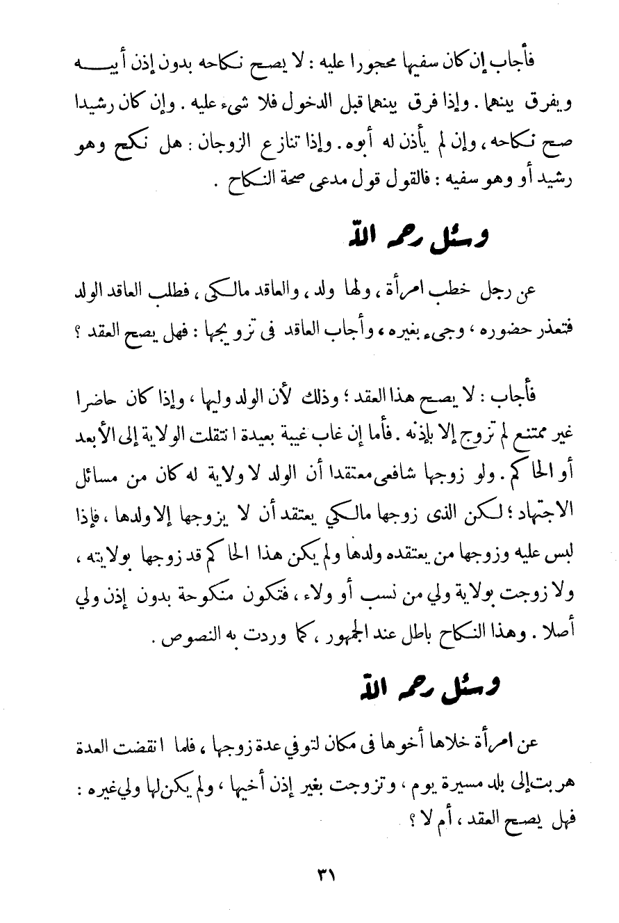 فَأَجَابَ إنْ كَانَ سَفِيهًا مَحْجُورًا عَلَيْهِ: لَا يَصِحُّ نِكَاحُهُ بِدُونِ إذْنِ أَبِيهِ وَيُفَرَّقُ بَيْنَهُمَا. وَإِذَا فُرِّقَ بَيْنَهُمَا قَبْلَ الدُّخُولِ فَلَا شَيْءَ عَلَيْهِ. وَإِنْ كَانَ رَشِيدًا صَحَّ نِكَاحُهُ وَإِنْ لَمْ يَأْذَنْ لَهُ أَبُوهُ. وَإِذَا تَنَازَعَ الزَّوْجَانِ: هَلْ نَكَحَ وَهُوَ رَشِيدٌ أَوْ وَهُوَ سَفِيهٌ: فَالْقَوْلُ قَوْلُ مُدَّعِي صِحَّةَ النِّكَاحِ.