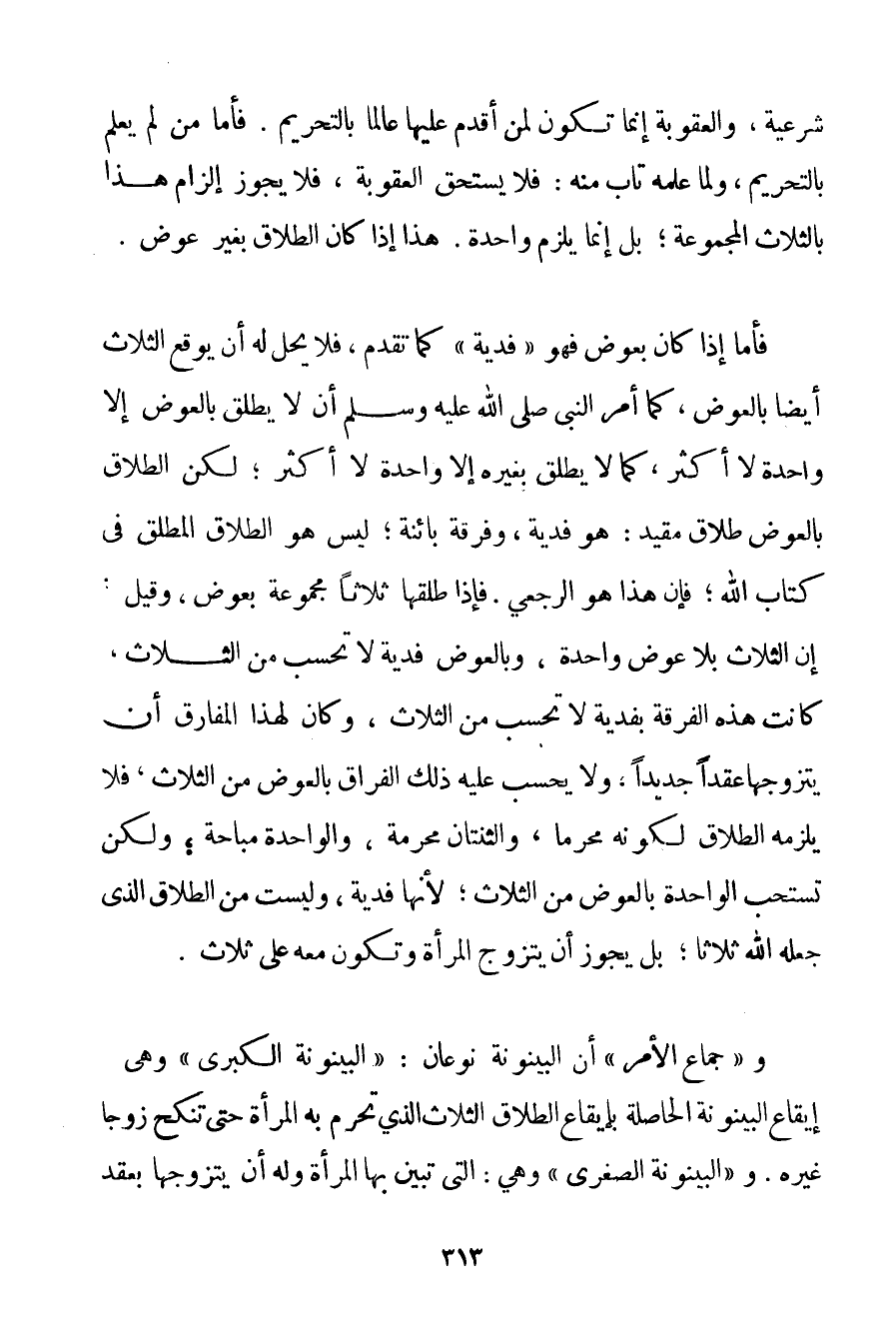 شَرْعِيَّةٌ وَالْعُقُوبَةُ إنَّمَا تَكُونُ لِمَنْ أَقْدَمَ عَلَيْهَا عَالِمًا بِالتَّحْرِيمِ. فَأَمَّا مَنْ لَمْ يَعْلَمْ بِالتَّحْرِيمِ وَلَمَّا عَلِمَهُ تَابَ مِنْهُ: فَلَا يَسْتَحِقُّ الْعُقُوبَةَ فَلَا يَجُوزُ إلْزَامُ هَذَا بِالثَّلَاثِ الْمَجْمُوعَةِ؛ بَلْ إنَّمَا يُلْزَمُ وَاحِدَةً. هَذَا إذَا كَانَ الطَّلَاقُ بِغَيْرِ عِوَضٍ. فَأَمَّا إذَا كَانَ بِعِوَضِ فَهُوَ " فِدْيَةٌ " كَمَا تَقَدَّمَ فَلَا يَحِلُّ لَهُ أَنْ يُوقِعَ الثَّلَاثَ أَيْضًا بِالْعِوَضِ كَمَا أَمَرَ النَّبِيُّ صَلَّى اللَّهُ عَلَيْهِ وَسَلَّمَ أَنْ لَا يُطَلِّقَ بِالْعِوَضِ إلَّا وَاحِدَةً لَا أَكْثَرَ كَمَا لَا يُطَلِّقُ بِغَيْرِهِ إلَّا وَاحِدَةً لَا أَكْثَرَ؛ لَكِنَّ الطَّلَاقَ بِالْعِوَضِ طَلَاقٌ مُقَيَّدٌ: هُوَ فِدْيَةٌ وَفُرْقَةٌ بَائِنَةٌ؛ لَيْسَ هُوَ الطَّلَاقَ الْمُطْلَقَ فِي كِتَابِ اللَّهِ؛ فَإِنَّ هَذَا هُوَ الرَّجْعِيُّ. فَإِذَا طَلَّقَهَا ثَلَاثًا مَجْمُوعَةً بِعِوَضِ وَقِيلَ: إنَّ الثَّلَاثَ بِلَا عِوَضٍ وَاحِدَةٌ وَبِالْعِوَضِ فَدِيَةٌ لَا تُحْسَبُ مِنْ الثَّلَاثِ كَانَتْ هَذِهِ الْفُرْقَةُ بِفِدْيَةِ لَا تُحْسَبُ مِنْ الثَّلَاثِ وَكَانَ لِهَذَا الْمُفَارِقِ أَنْ يَتَزَوَّجَهَا عَقْدًا جَدِيدًا وَلَا يُحْسَبُ عَلَيْهِ ذَلِكَ الْفِرَاقُ بِالْعِوَضِ مِنْ الثَّلَاثِ فَلَا يَلْزَمُهُ الطَّلَاقُ لِكَوْنِهِ مُحَرَّمًا وَالثِّنْتَانِ مُحَرَّمَةٌ وَالْوَاحِدَةُ مُبَاحَةٌ؛ وَلَكِنْ تُسْتَحَبُّ الْوَاحِدَةُ بِالْعِوَضِ مِنْ الثَّلَاثِ؛ لِأَنَّهَا فِدْيَةٌ وَلَيْسَتْ مِنْ الطَّلَاقِ الَّذِي جَعَلَهُ اللَّهُ ثَلَاثًا؛ بَلْ يَجُوزُ أَنْ يَتَزَوَّجَ الْمَرْأَةَ وَتَكُونَ مَعَهُ عَلَى ثَلَاثٍ. و " جِمَاعُ الْأَمْرِ " أَنَّ الْبَيْنُونَةَ نَوْعَانِ: " الْبَيْنُونَةُ الْكُبْرَى " وَهِيَ إيقَاع الْبَيْنُونَةِ الْحَاصِلَةِ بِإِيقَاعِ الطَّلَاقِ الثَّلَاثِ الَّذِي تَحْرُمُ بِهِ الْمَرْأَةُ حَتَّى تَنْكِحَ زَوْجًا غَيْرَهُ. و " الْبَيْنُونَةُ الصُّغْرَى " وَهِيَ: الَّتِي تَبِينُ بِهَا الْمَرْأَةُ وَلَهُ أَنْ يَتَزَوَّجَهَا بِعَقْدِ