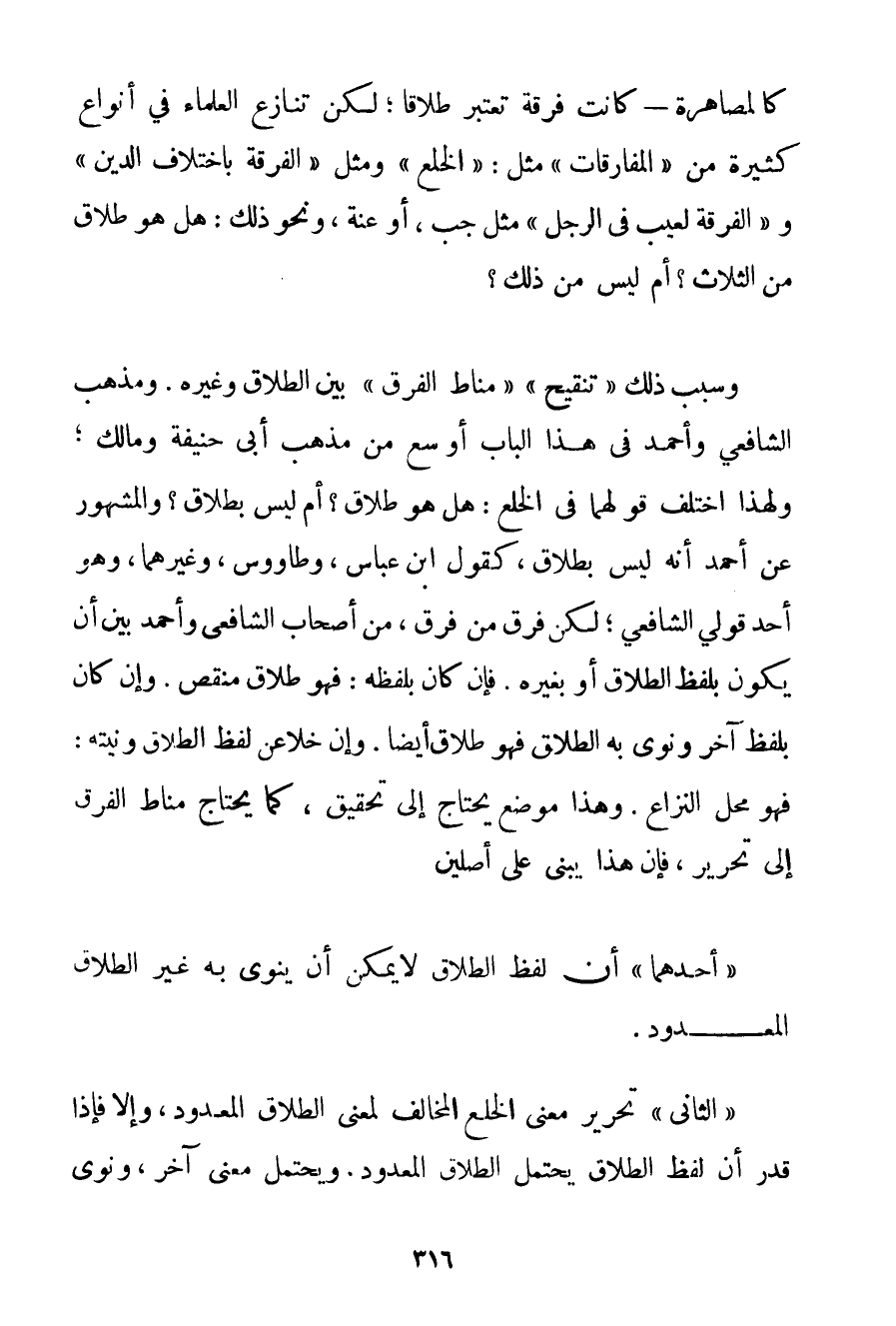 كَالْمُصَاهَرَةِ - كَانَتْ فُرْقَةً تُعْتَبَرُ طَلَاقًا؛ لَكِنْ تَنَازَعَ الْعُلَمَاءُ فِي أَنْوَاعٍ كَثِيرَةٍ مِنْ " الْمُفَارَقَاتِ " مِثْلَ: " الْخُلْعِ " وَمِثْلَ " الْفُرْقَةِ بِاخْتِلَافِ الدِّينِ " و " الْفُرْقَةِ لِعَيْبِ فِي الرَّجُلِ " مِثْلَ جَبٍّ أَوْ عُنَّةٍ وَنَحْوِ ذَلِكَ: هَلْ هُوَ طَلَاقٌ مِنْ الثَّلَاثِ؟ أَمْ لَيْسَ مِنْ ذَلِكَ؟ وَسَبَبُ ذَلِكَ " تَنْقِيحُ " " مَنَاطِ الْفَرْقِ " بَيْنَ الطَّلَاقِ وَغَيْرِهِ. وَمَذْهَبُ الشَّافِعِيِّ وَأَحْمَد فِي هَذَا الْبَابِ أَوْسَعُ مِنْ مَذْهَبِ أَبِي حَنِيفَةَ وَمَالِكٍ؛ وَلِهَذَا اخْتَلَفَ قَوْلُهُمَا فِي الْخُلْعِ: هَلْ هُوَ طَلَاقٌ؟ أَمْ لَيْسَ بِطَلَاقِ؟ وَالْمَشْهُورُ عَنْ أَحْمَد أَنَّهُ لَيْسَ بِطَلَاقِ كَقَوْلِ ابْنِ عَبَّاسٍ وطاوس وَغَيْرِهِمَا وَهُوَ أَحَدُ قَوْلَيْ الشَّافِعِيِّ؛ لَكِنْ فَرَّقَ مَنْ فَرَّقَ مِنْ أَصْحَابِ الشَّافِعِيِّ وَأَحْمَد بَيْنَ أَنْ يَكُونَ بِلَفْظِ الطَّلَاقِ أَوْ بِغَيْرِهِ. فَإِنْ كَانَ بِلَفْظِهِ: فَهُوَ طَلَاقٌ مُنَقِّصٌ. وَإِنْ كَانَ بِلَفْظِ آخَرَ وَنَوَى بِهِ الطَّلَاقَ فَهُوَ طَلَاقٌ أَيْضًا. وَإِنْ خَلَا عَنْ لَفْظِ الطَّلَاقِ وَنِيَّتِهِ: فَهُوَ مَحَلُّ النِّزَاعِ. وَهَذَا مَوْضِعٌ يَحْتَاجُ إلَى تَحْقِيقٍ كَمَا يَحْتَاجُ مَنَاطُ الْفَرْقِ إلَى تَحْرِيرٍ فَإِنَّ هَذَا يُبْنَى عَلَى أَصْلَيْنِ " أَحَدُهُمَا " أَنَّ لَفْظَ الطَّلَاقِ لَا يُمْكِنُ أَنْ يَنْوِيَ بِهِ غَيْرَ الطَّلَاقِ الْمَعْدُودِ. " الثَّانِي " تَحْرِيرُ مَعْنَى الْخُلْعِ الْمُخَالِفِ لِمَعْنَى الطَّلَاقِ الْمَعْدُودِ وَإِلَّا فَإِذَا قُدِّرَ أَنَّ لَفْظَ الطَّلَاقِ يَحْتَمِلُ الطَّلَاقَ الْمَعْدُودَ. وَيَحْتَمِلُ مَعْنًى آخَرُ وَنَوَى