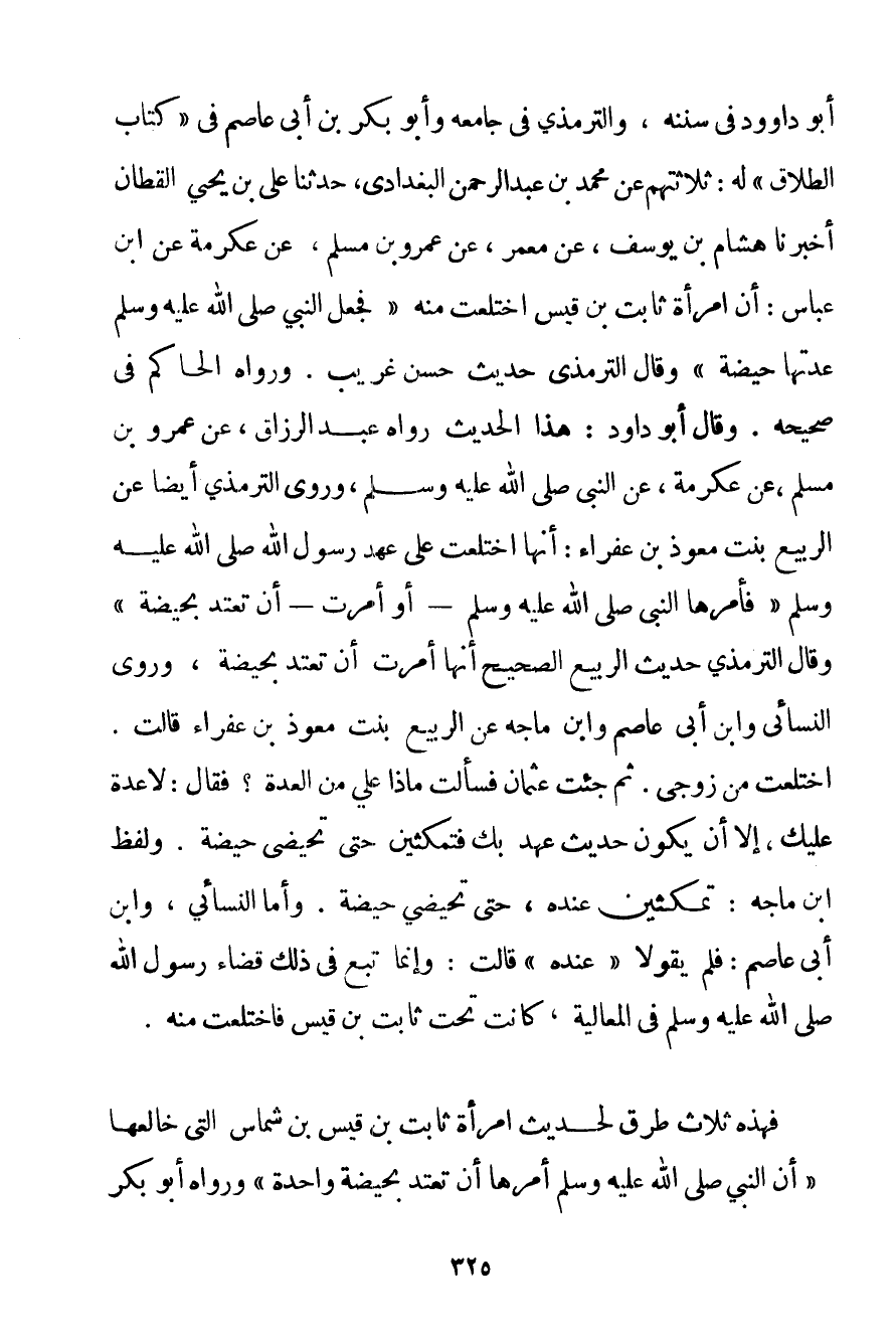 أَبُو دَاوُد فِي سُنَنِهِ وَالتِّرْمِذِي فِي جَامِعِهِ وَأَبُو بَكْرِ بْنُ أَبِي عَاصِمٍ فِي " كِتَابِ الطَّلَاقِ " لَهُ: ثَلَاثَتُهُمْ عَنْ مُحَمَّدِ بْنِ عَبْدِ الرَّحْمَنِ الْبَغْدَادِيِّ حَدَّثَنَا عَلِيُّ بْنُ يَحْيَى الْقَطَّانِ أَخْبَرَنَا هِشَامُ بْنُ يُوسُفَ عَنْ مَعْمَرٍ عَنْ عَمْرِو بْنِ مُسْلِمٍ عَنْ عِكْرِمَةَ {عَنْ ابْنِ عَبَّاسٍ: أَنَّ امْرَأَةَ ثَابِتِ بْنِ قَيْسٍ اخْتَلَعَتْ مِنْهُ فَجَعَلَ النَّبِيُّ صَلَّى اللَّهُ عَلَيْهِ وَسَلَّمَ عِدَّتَهَا حَيْضَةً} وَقَالَ التِّرْمِذِيُّ حَدِيثٌ حَسَنُ غَرِيبٌ. وَرَوَاهُ الْحَاكِمُ فِي صَحِيحِهِ. وَقَالَ أَبُو دَاوُد: هَذَا الْحَدِيثُ رَوَاهُ عَبْدُ الرَّزَّاقِ عَنْ عَمْرِو بْنِ مُسْلِمٍ عَنْ عِكْرِمَةَ عَنْ النَّبِيِّ صَلَّى اللَّهُ عَلَيْهِ وَسَلَّمَ وَرَوَى التِّرْمِذِيُّ أَيْضًا {عَنْ الربيع بِنْتِ مُعَوِّذِ ابْنِ عَفْرَاءَ: أَنَّهَا اخْتَلَعَتْ عَلَى عَهْدِ رَسُولِ اللَّهِ صَلَّى اللَّهُ عَلَيْهِ وَسَلَّمَ فَأَمَرَهَا النَّبِيُّ صَلَّى اللَّهُ عَلَيْهِ وَسَلَّمَ - أَوْ أُمِرَتْ - أَنْ تَعْتَدَّ بِحَيْضَةِ} وَقَالَ التِّرْمِذِيُّ حَدِيثُ الربيع الصَّحِيحُ أَنَّهَا أُمِرَتْ أَنْ تَعْتَدَّ بِحَيْضَةِ وَرَوَى النَّسَائِي وَابْنُ أَبِي عَاصِمٍ وَابْنُ مَاجَه عَنْ الربيع بِنْتِ مُعَوِّذِ ابْنِ عَفْرَاءَ قَالَتْ. اختلعت مِنْ زَوْجِي. ثُمَّ جِئْت عُثْمَانَ فَسَأَلْت مَاذَا عَلَيَّ مِنْ الْعِدَّةِ؟ فَقَالَ: لَا عِدَّةَ عَلَيْك إلَّا أَنْ يَكُونَ حَدِيثَ عَهْدٍ بِك فَتَمْكُثِينَ حَتَّى تَحِيضِي حَيْضَةً. وَلَفْظُ ابْنِ مَاجَه: تَمْكُثِينَ عِنْدَهُ حَتَّى تَحِيضِي حَيْضَةً. وَأَمَّا النَّسَائِي وَابْنُ أَبِي عَاصِمٍ: فَلَمْ يَقُولَا " عِنْدَهُ " قَالَتْ: وَإِنَّمَا تَبِعَ فِي ذَلِكَ قَضَاءَ رَسُولِ اللَّهِ صَلَّى اللَّهُ عَلَيْهِ وَسَلَّمَ فِي الْمُغَالِيَةِ كَانَتْ تَحْتَ ثَابِتِ بْنِ قَيْسٍ فَاخْتَلَعَتْ مِنْهُ. فَهَذِهِ ثَلَاثُ طُرُقٍ لِحَدِيثِ امْرَأَةِ ثَابِتِ بْنِ قَيْسِ بْنِ شَمَّاسٍ الَّتِي خَالَعَهَا {أَنَّ النَّبِيَّ صَلَّى اللَّهُ عَلَيْهِ وَسَلَّمَ أَمَرَهَا أَنْ تَعْتَدَّ بِحَيْضَةِ وَاحِدَةٍ} وَرَوَاهُ أَبُو بَكْرِ