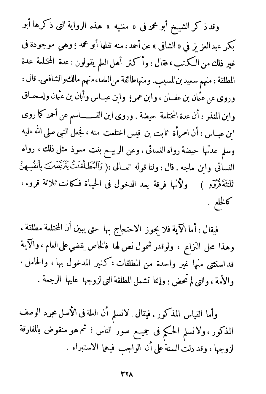 وَقَدْ ذَكَرَ الشَّيْخُ أَبُو مُحَمَّدٍ فِي " مُغْنِيهِ " هَذِهِ الرِّوَايَةَ الَّتِي ذَكَرَهَا أَبُو بَكْرٍ عَبْدُ الْعَزِيزِ فِي " الشَّافِي " عَنْ أَحْمَد مِنْهُ نَقَلَهَا أَبُو مُحَمَّدٍ؛ وَهِيَ مَوْجُودَةٌ فِي غَيْرِ ذَلِكَ مِنْ الْكُتُبِ فَقَالَ: وَأَكْثَرُ أَهْل الْعِلْمِ يَقُولُونَ: عِدَّةُ الْمُخْتَلَعَة عِدَّةُ الْمُطَلَّقَةِ. مِنْهُمْ سَعِيدُ بْنُ الْمُسَيِّبِ. وَمِنْهَا طَائِفَةٌ مِنْ الْعُلَمَاءِ مِنْهُمْ مَالِكٌ وَالشَّافِعِيُّ. قَالَ: وَرُوِيَ عَنْ عُثْمَانَ بْنِ عفان وَابْنِ عُمَرَ؛ وَابْنِ عَبَّاسٍ وَأَبَانَ بْنِ عُثْمَانَ وَإِسْحَاقَ وَابْنِ الْمُنْذِرِ: أَنَّ عِدَّةَ الْمُخْتَلِعَةِ حَيْضَةٌ. وَرَوَى ابْنُ الْقَاسِمِ عَنْ أَحْمَد كَمَا {رَوَى ابْنُ عَبَّاسٍ: أَنَّ امْرَأَةَ ثَابِتِ بْنِ قَيْسٍ اخْتَلَعَتْ مِنْهُ فَجَعَلَ النَّبِيُّ صَلَّى اللَّهُ عَلَيْهِ وَسَلَّمَ عِدَّتَهَا حَيْضَةً} رَوَاهُ النَّسَائِي وَعَنْ الربيع بِنْتِ مُعَوِّذٍ مَثَل ذَلِكَ رَوَاهُ النَّسَائِي وَابْنُ مَاجَه. قَالَ: وَلَنَا قَوْله تَعَالَى {وَالْمُطَلَّقَاتُ يَتَرَبَّصْنَ بِأَنْفُسِهِنَّ ثَلَاثَةَ قُرُوءٍ} وَلِأَنَّهَا فُرْقَةٌ بَعْدَ الدُّخُولِ فِي الْحَيَاةِ فَكَانَتْ ثَلَاثَةَ قُرُوءٍ كَالْخُلْعِ. فَقَالَ: أَمَّا الْآيَةُ فَلَا يَجُوزُ الِاحْتِجَاجُ بِهَا حَتَّى يُبَيِّنَ أَنَّ الْمُخْتَلَعَةَ مُطَلَّقَةٌ وَهَذَا مَحَلُّ النِّزَاعِ وَلَوْ قُدِّرَ شُمُولُ نَصِّ لَهَا فَالْخَاصُّ يَقْضِي عَلَى الْعَامِّ وَالْآيَةُ قَدْ اسْتَثْنَى مِنْهَا غَيْرَ وَاحِدَةٍ مِنْ الْمُطَلَّقَاتِ: كَغَيْرِ الْمَدْخُولِ بِهَا وَالْحَامِلِ وَالْأَمَةِ وَاَلَّتِي لَمْ تَحِضْ وَإِنَّمَا تَشْمَلُ الْمُطَلَّقَةَ الَّتِي لِزَوْجِهَا عَلَيْهَا الرَّجْعَةُ. وَأَمَّا الْقِيَاسُ الْمَذْكُورُ. فَيُقَالُ لَا نُسَلِّمُ أَنَّ الْعِلَّةَ فِي الْأَصْلِ مُجَرَّدُ الْوَصْفِ الْمَذْكُورِ وَلَا نُسَلِّمُ الْحُكْمَ فِي جَمِيعِ صُوَرِ النَّاسِ؛ ثُمَّ هُوَ مَنْقُوضٌ بِالْمُفَارَقَةِ لِزَوْجِهَا وَقَدْ دَلَّتْ السُّنَّةُ عَلَى أَنَّ الْوَاجِبَ فِيهِمَا الِاسْتِبْرَاءُ.